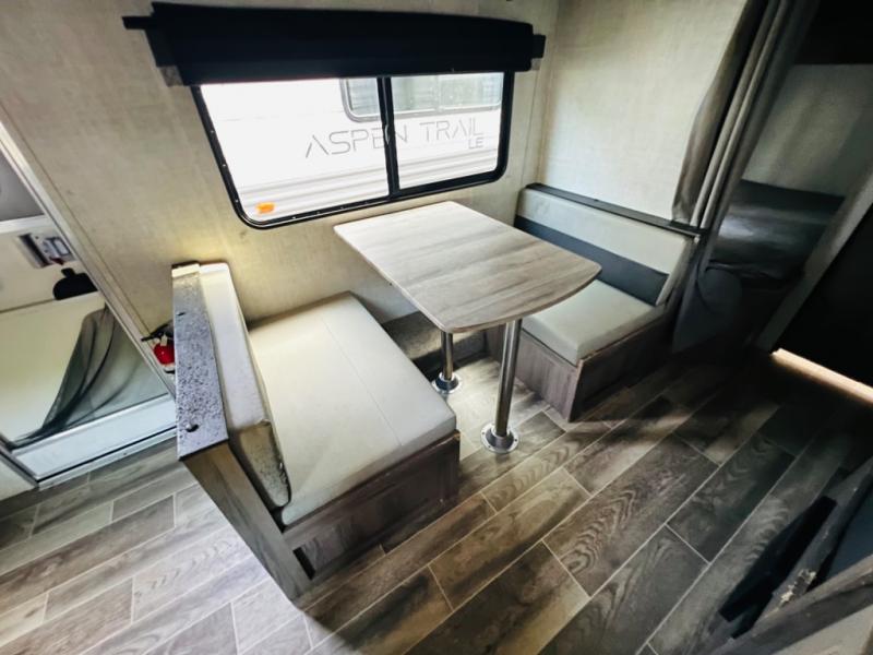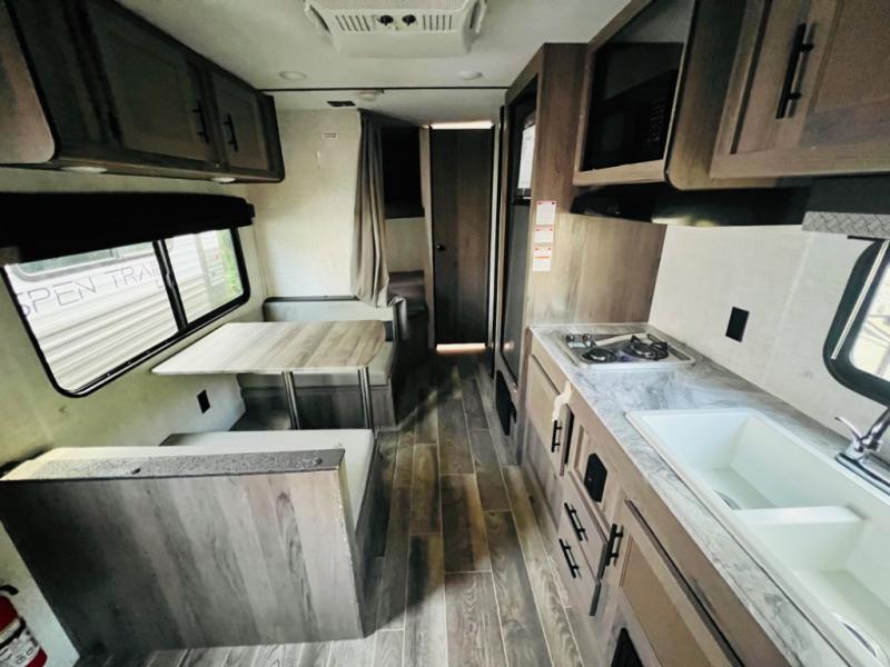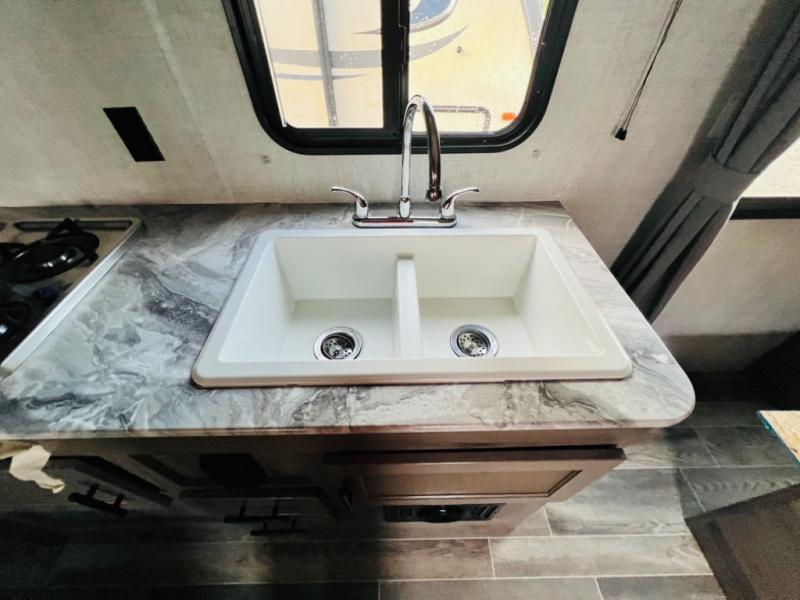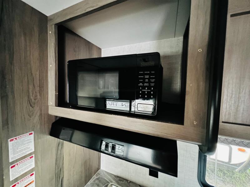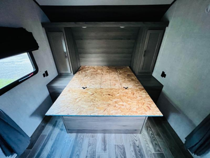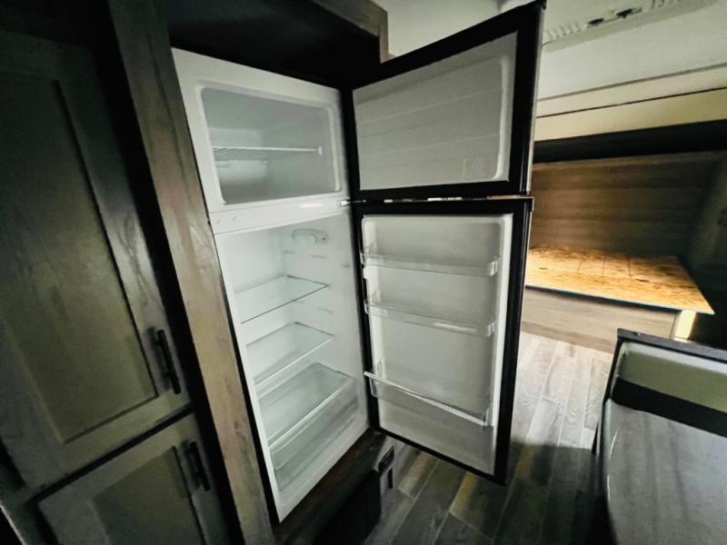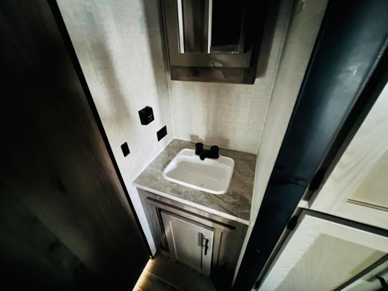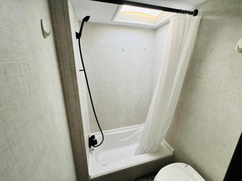 This semi-private front bedroom travel trailer allows you to change in privacy when you close the curtain and sleep on a queen-size bed or choose the optional Murphy bed/sofa for versatility. You will find your own wardrobe and a handy shelf at the head of the bed for your belongings. Your friends or kids will loving sleeping on the double-size bunks in the rear next to the private toilet and tub/shower room. The bathroom sink is just outside the door which is handy when two people need to get ready at once. And the cook will have full amenities, plus a pantry, and overhead storage for all the dishes, pots, and spices.