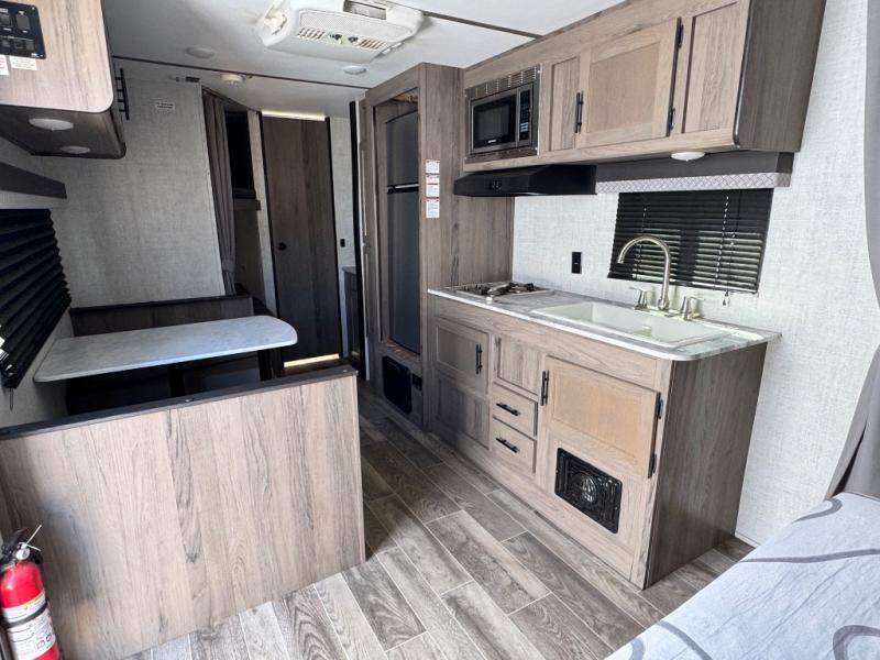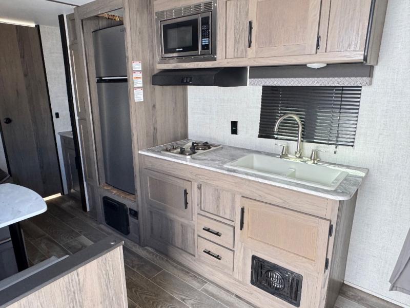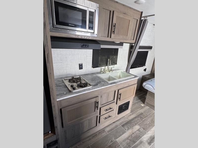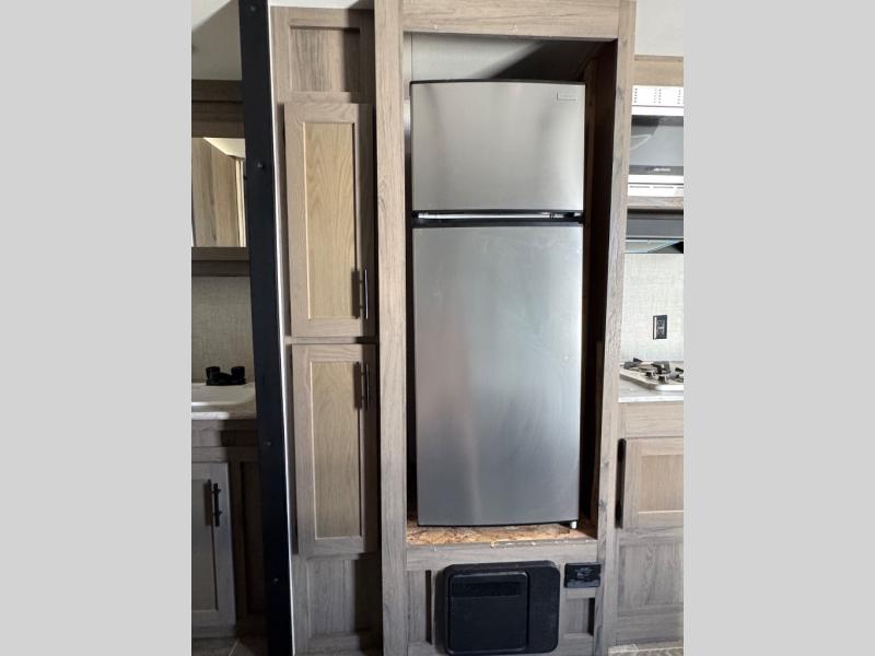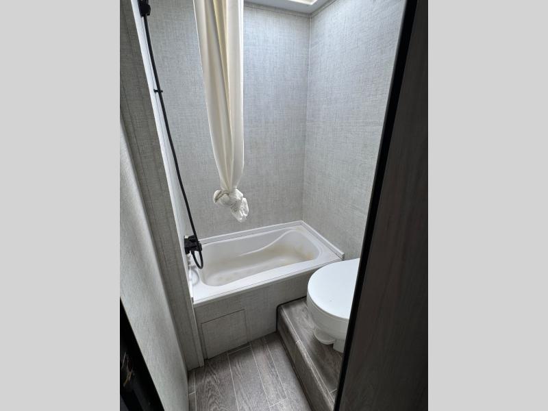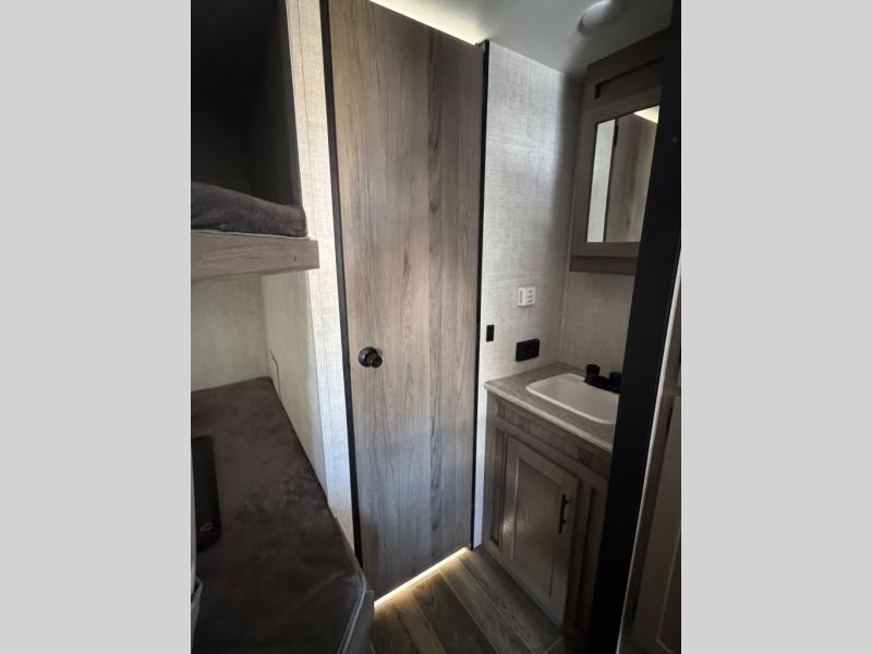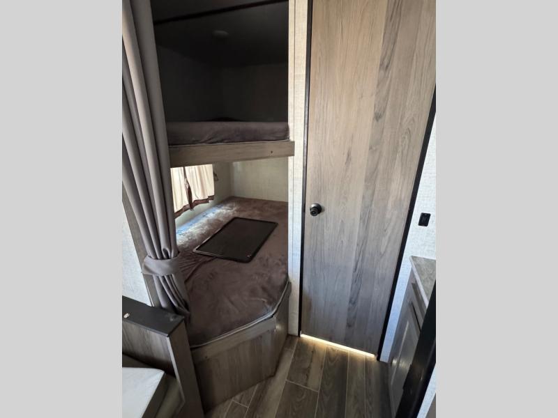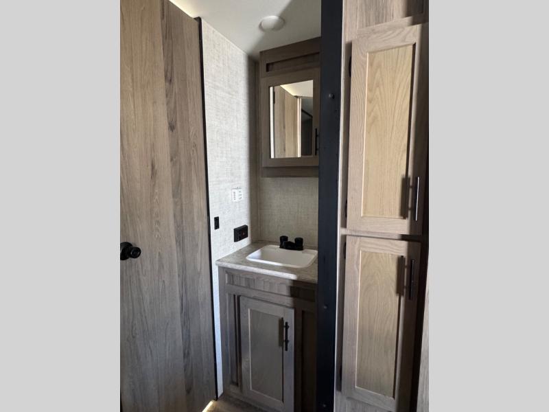 This semi-private front bedroom travel trailer allows you to change in privacy when you close the curtain and sleep on a queen-size bed or choose the optional Murphy bed/sofa for versatility. You will find your own wardrobe and a handy shelf at the head of the bed for your belongings. Your friends or kids will loving sleeping on the double-size bunks in the rear next to the private toilet and tub/shower room. The bathroom sink is just outside the door which is handy when two people need to get ready at once. And the cook will have full amenities, plus a pantry, and overhead storage for all the dishes, pots, and spices.