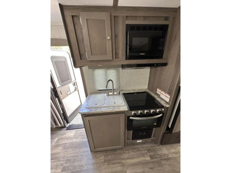 You will love how convenient it will be to take trips with this Matrix SVT travel trailer! Because of the 60" x 74" queen bed up front and the sofa slide, this unit can sleep four, and you can even close off the bed from the rest of the trailer by drawing the privacy curtain. The entertainment center is right next to the sofa for easy viewing, and the folding table in front of the sofa allows you to eat your dinner while you relax. For the bigger equipment that you don't want to store inside, you can use the exterior pass-through storage compartment.