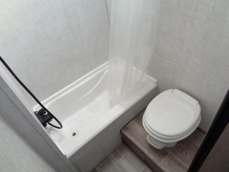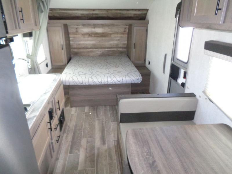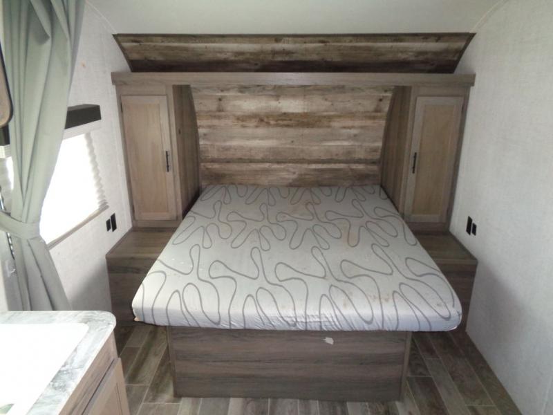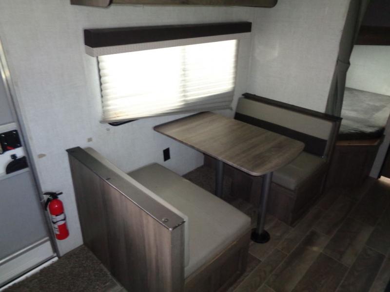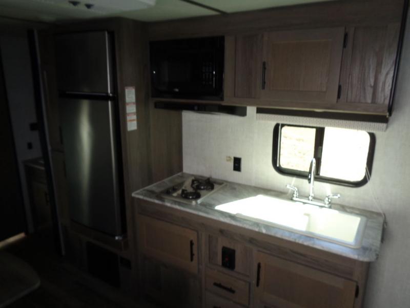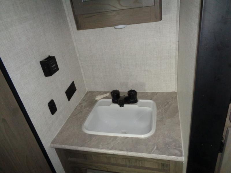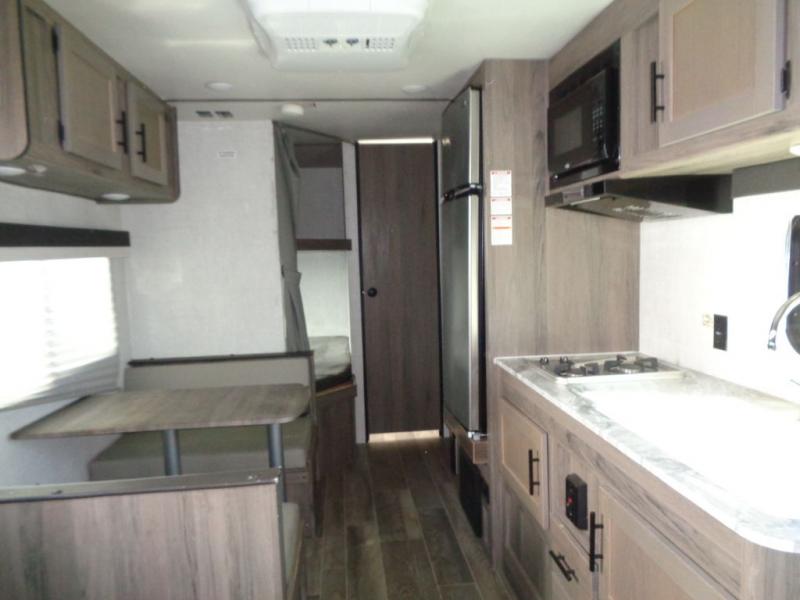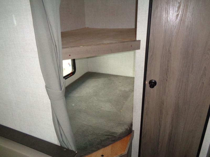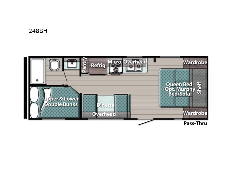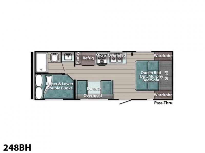 The kids will be begging to go camping every other weekend in this bunkhouse model. The double size bunks allow them to invite their cousins along, and you and your spouse will enjoy the queen bed up front. If you are needing more seating space during the day, just choose the optional Murphy bed in place of the queen bed! Making breakfast will be a snap on the three burner cooktop, and the pancake mix and syrup can be stored in the pantry.