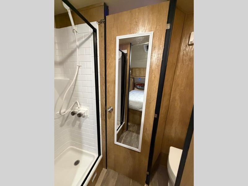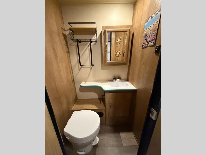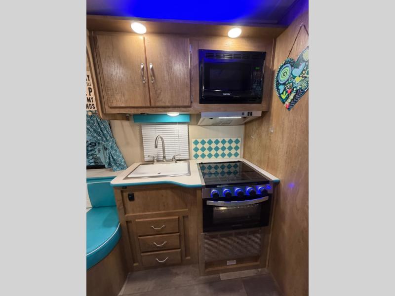 If you enjoy a more classic look for an RV, you'll love this Vintage Cruiser 19ERD. The rear booth dinette is surrounded by windows for bright, open views, and you'll find overhead storage here for dry goods or snacks. The chef of your group will have a two burner cooktop and a microwave oven to prepare meals, and you may want to add an optional 19" LED HDTV to keep your guests busy at the dinette while dinner is being made. The private toilet and sink is right across the hall from the 24" x 36" shower so two people can freshen up at once. How convenient! This model also features a semi-private front bedroom with a privacy curtain for your own space, plus an RV queen bed and dual shirt closets to keep your clothes tidy!