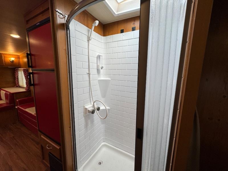 Step into comfort with this classic travel trailer in tow. You will find a rear vintage booth dinette and a sofa slide out with end tables to set your drinks on, and an optional 19" LED HDTV can be added for entertainment. The kitchen is complete with a microwave oven, a two burner cooktop, plus overhead cabinets for your belongings. After a day outdoors, you can clean up in the 24" x 36" shower, and there is a private toilet and sink across the hall if someone needs to use it while you're cleaning up. This model will feel just like home with its RV queen bed and dual shirt closets for your clothes.