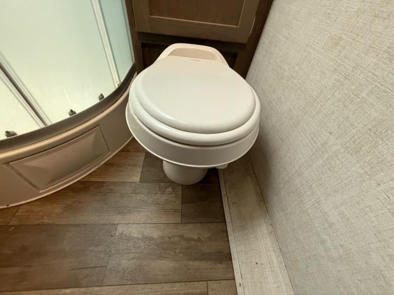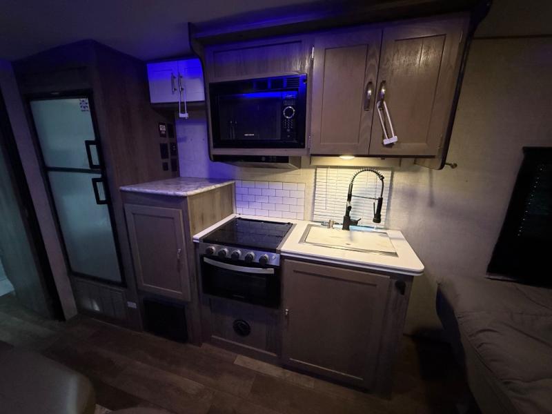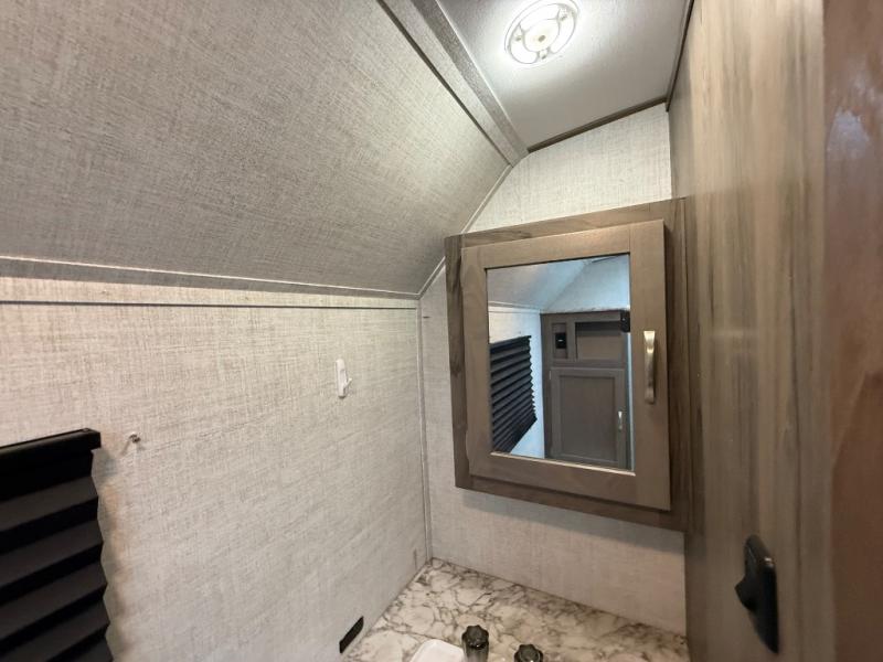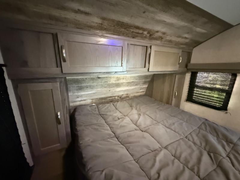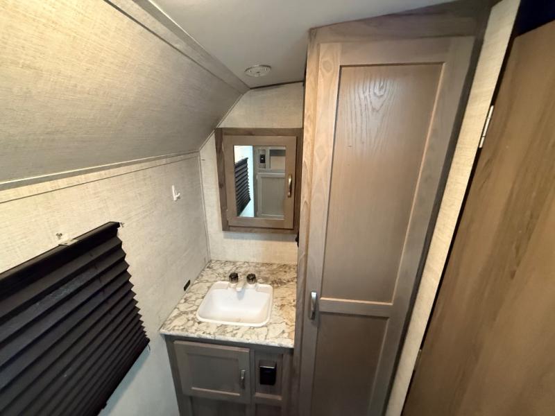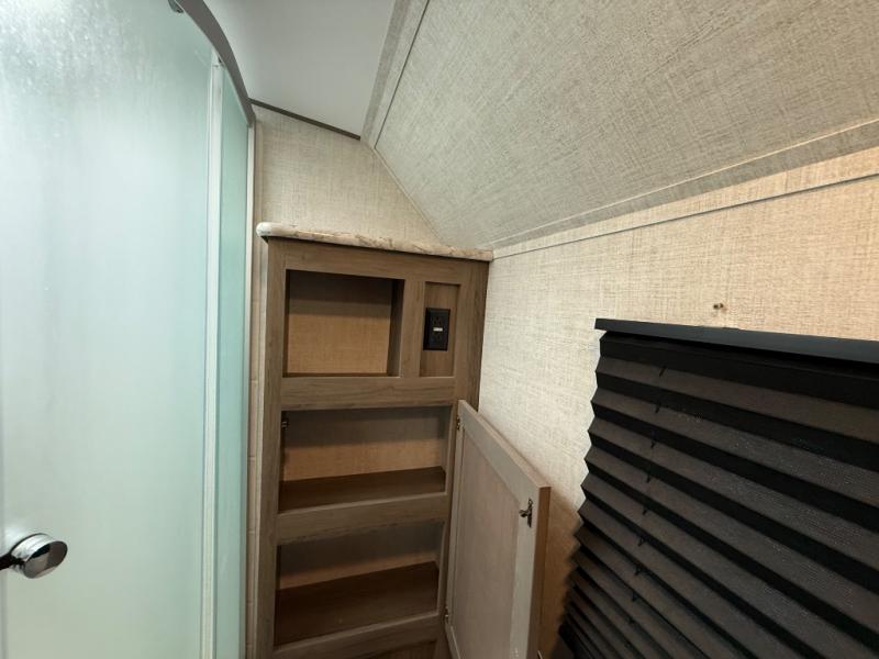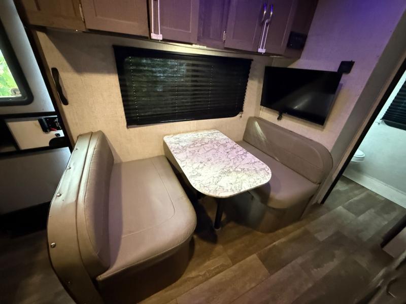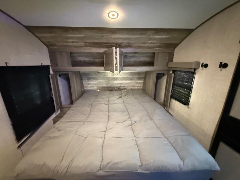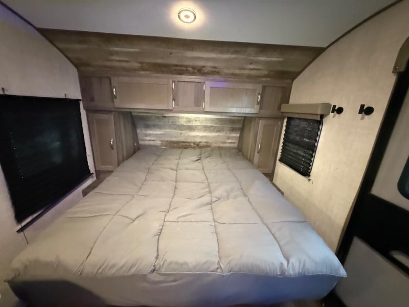 Enjoy a relaxing getaway with your spouse in this travel trailer! The front 60" x 74" bed ensures you will have a good night's rest each night, and the shirt closets on either side will keep your clothes looking nice. The rear full bathroom has a radius shower with a high velocity vent to eliminate any unwanted steam and a deluxe wood medicine cabinet with mirror. The pantry has a TV mount location by it and the three burner cooktop is just waiting for you to prepare a delicious home cooked meal that you can enjoy at the booth dinette!