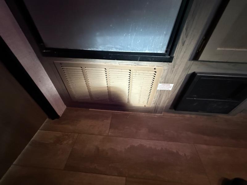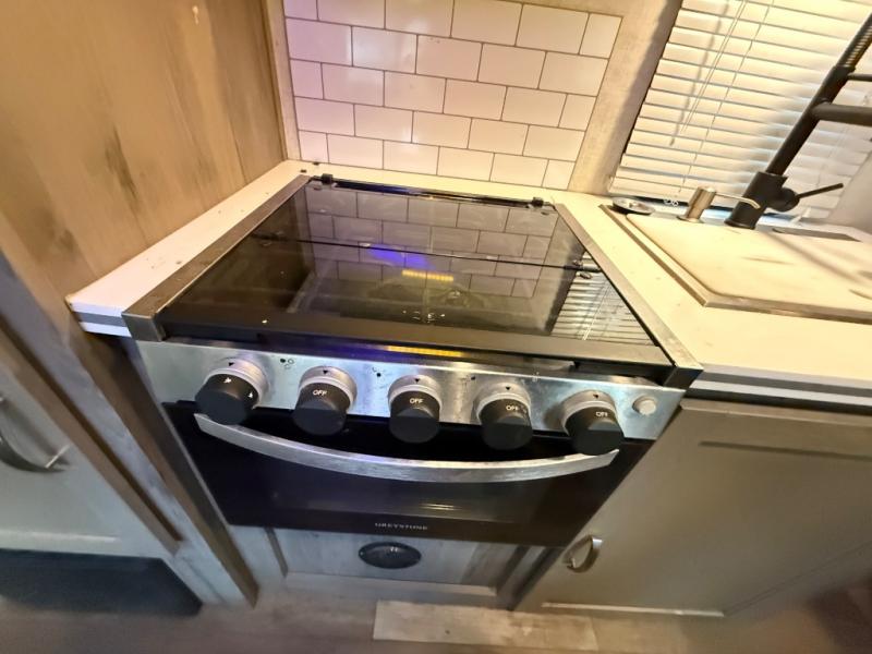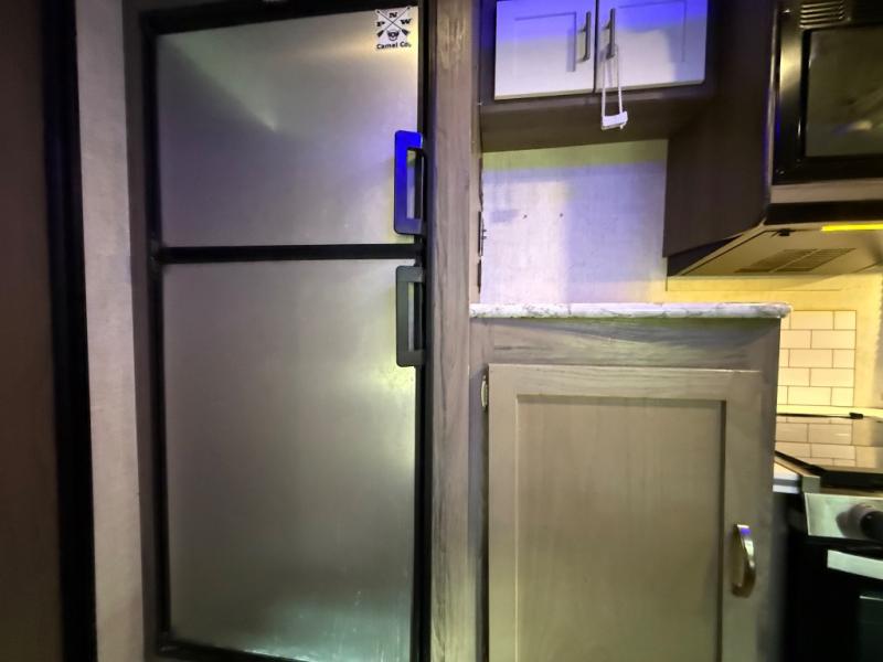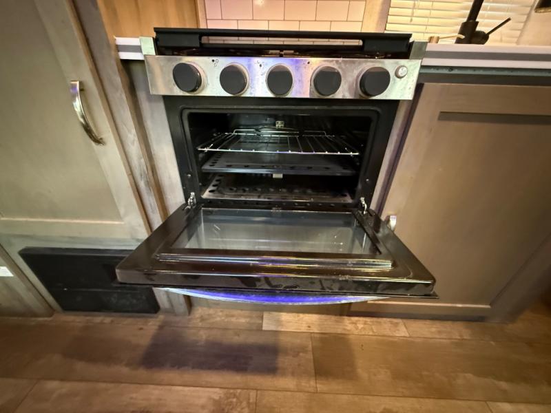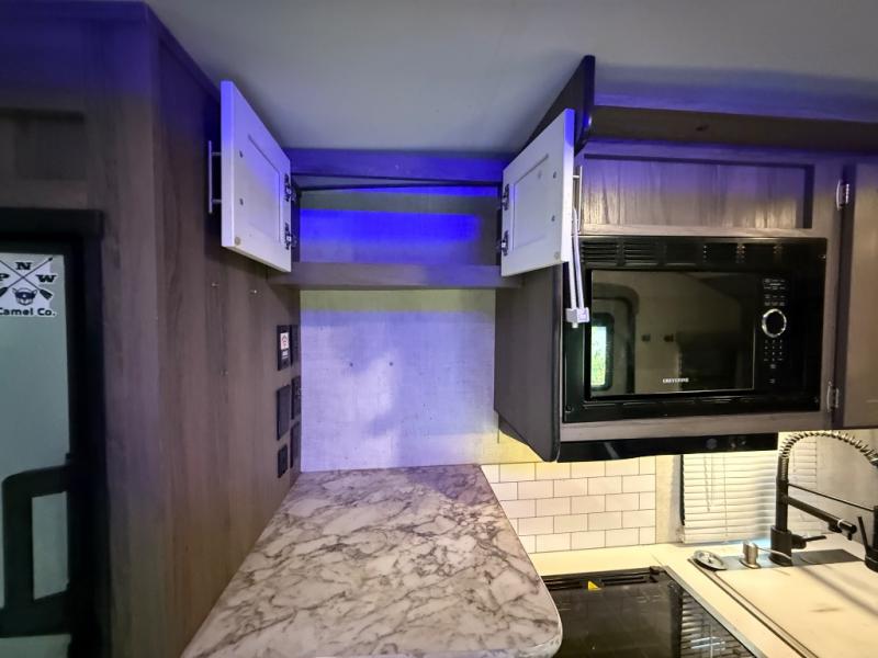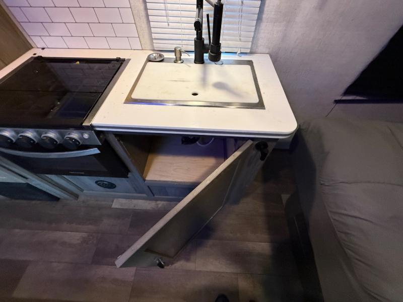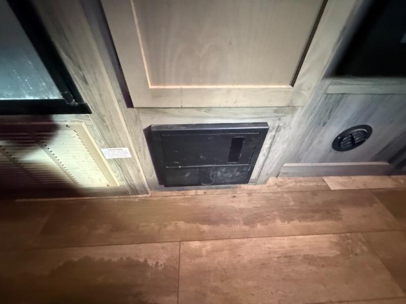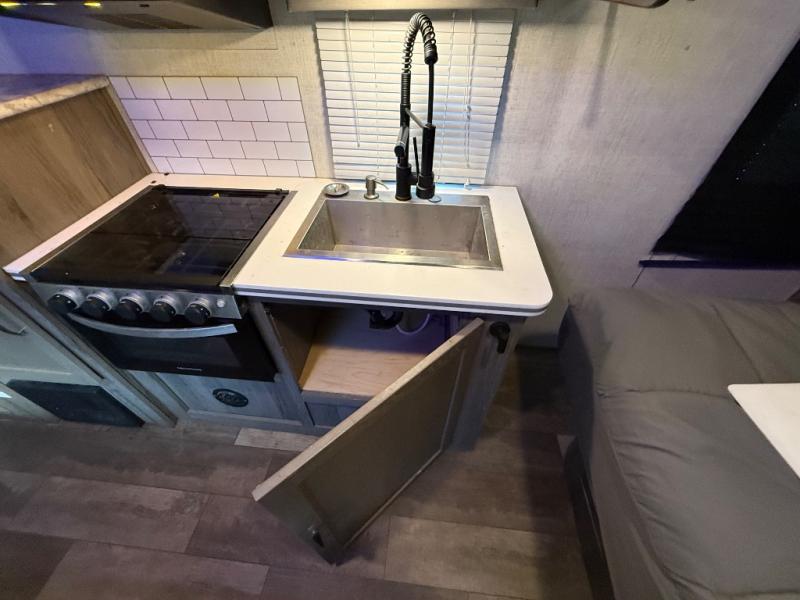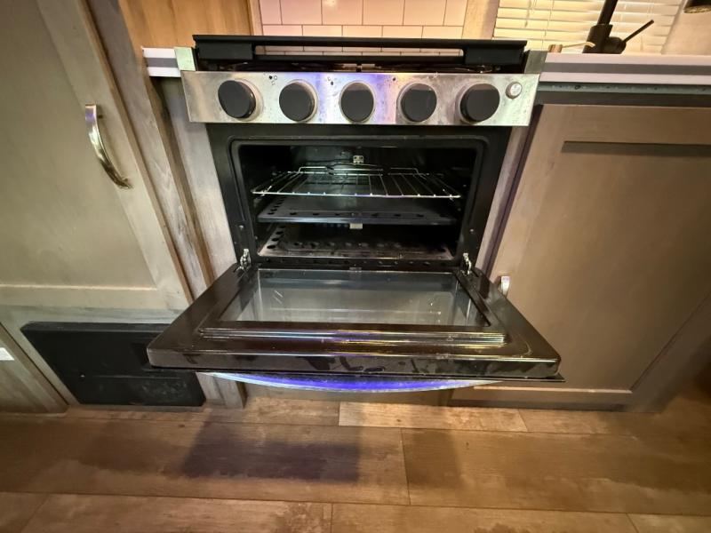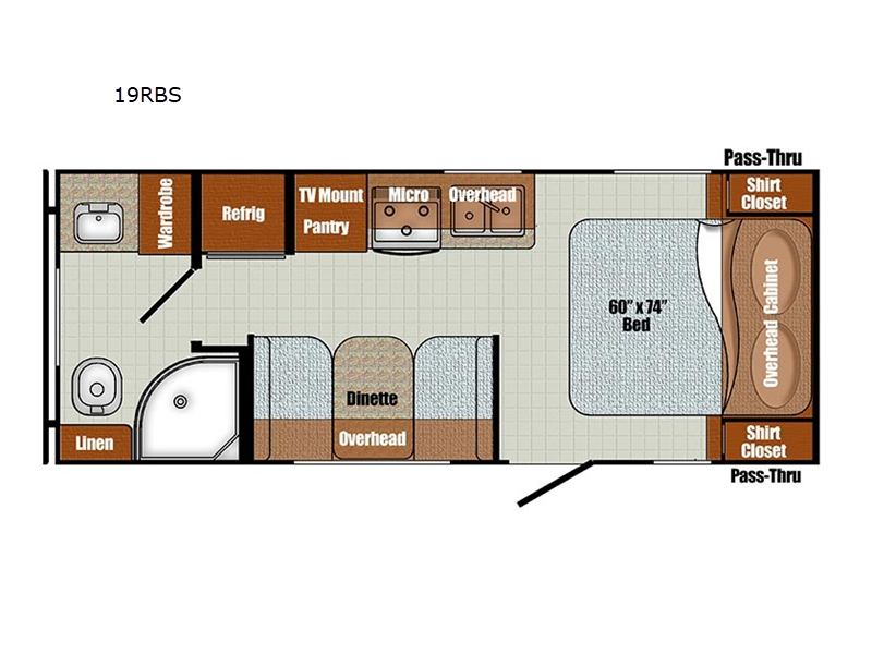Enjoy a relaxing getaway with your spouse in this travel trailer! The front 60" x 74" bed ensures you will have a good night's rest each night, and the shirt closets on either side will keep your clothes looking nice. The rear full bathroom has a radius shower with a high velocity vent to eliminate any unwanted steam and a deluxe wood medicine cabinet with mirror. The pantry has a TV mount location by it and the three burner cooktop is just waiting for you to prepare a delicious home cooked meal that you can enjoy at the booth dinette!