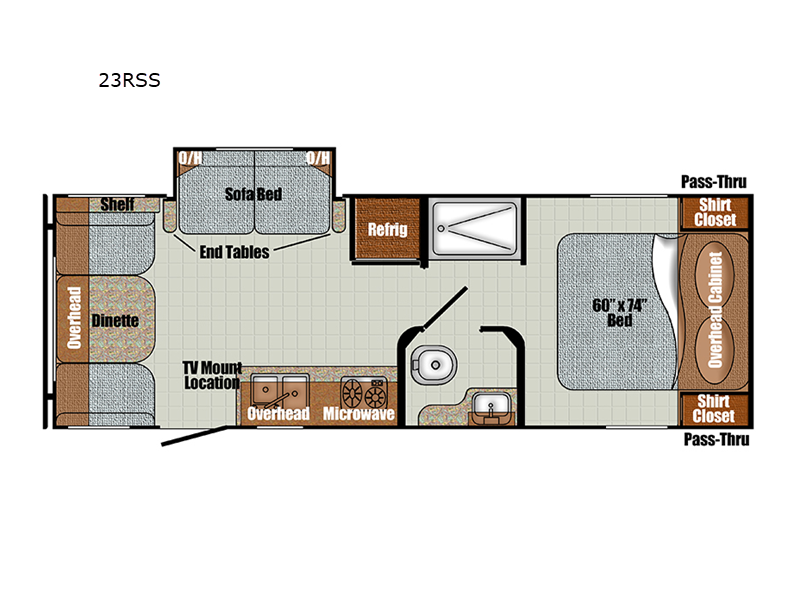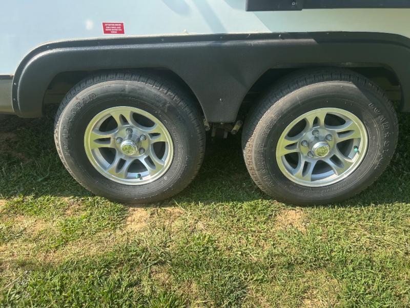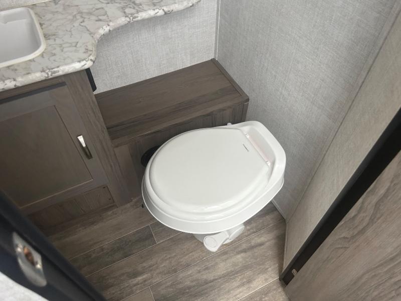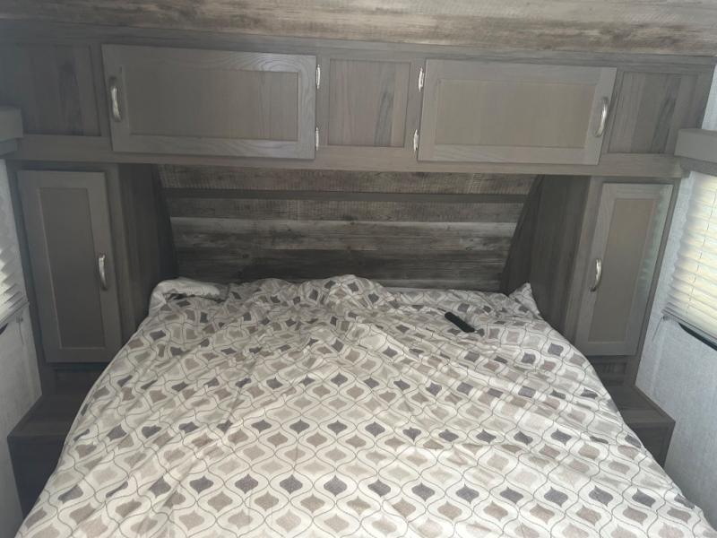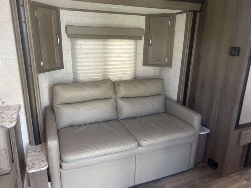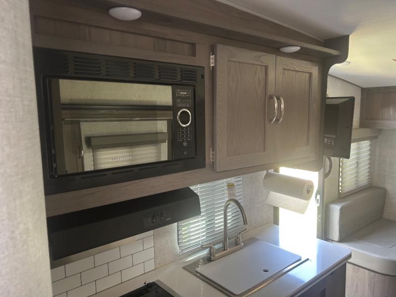 Book your favorite campsite and head to a great weekend getaway with your spouse and a guest or two in this travel trailer! There is a front 60" x 74" bed with shirt closets on either side for you to sleep on, and your guests can sleep on the sofa bed slide with end tables, as well as the rear booth dinette once they are converted. Whip up your best meals for everyone in the fully equipped kitchen that even has a microwave to pop a bag of popcorn at night. With a separated bathroom, everyone will be able to start their mornings feeling squeaky clean!