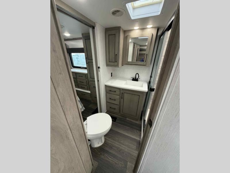 Looking to travel with a spacious master bedroom that offers a fireplace, lots of floor space thanks to the slide out king bed, plus a large front wardrobe for all your clothing and some? Look no further, this Big Country offers what you want plus more like the hallway wardrobe within a slide, and a double entry bathroom with a shower with a seat for convenience. The dual opposing slides in the main living and kitchen area offer more floor space in this combined area, plus seating to relax and watch the 55" TV with fireplace below, and to dine at the free-standing table with four chairs. And you can offer overnight guests sleeping space on the tri-fold sofa sleeper. The kitchen has an island with a farm style sink, stainless steel appliances and a full-size pantry for lots of snacks and dry good storage.