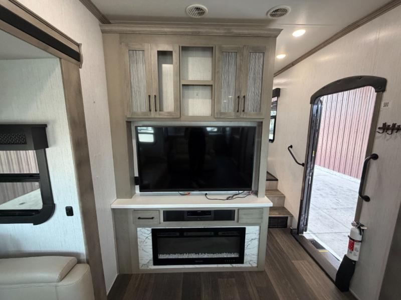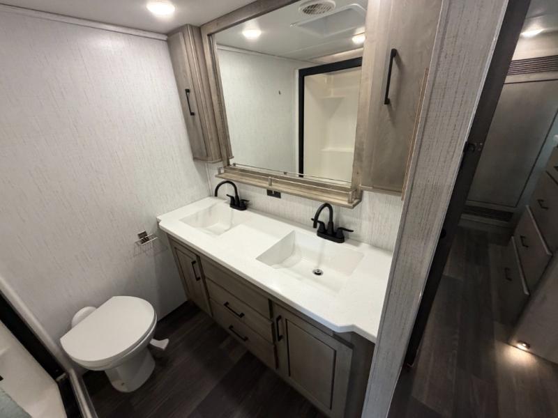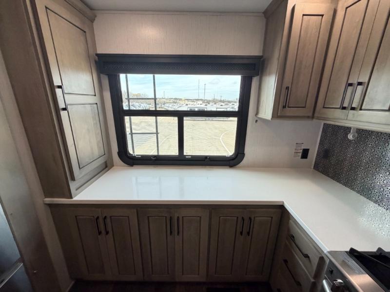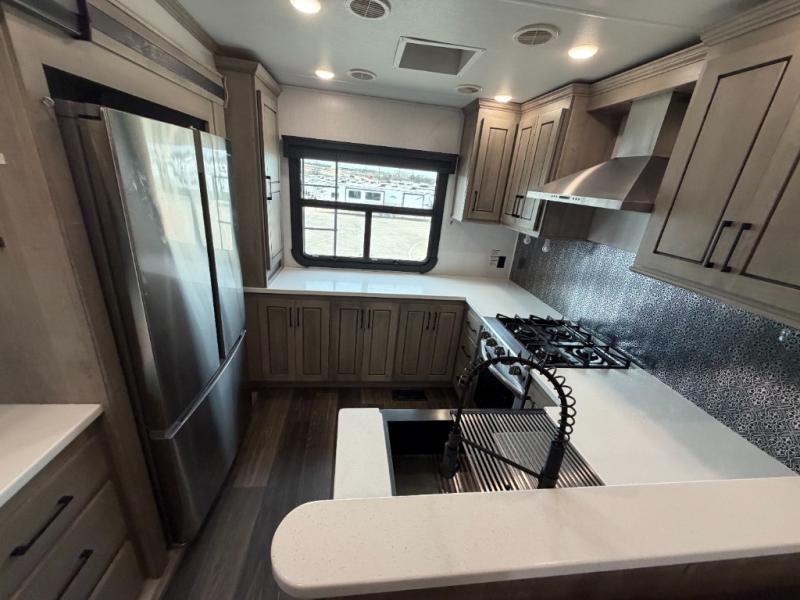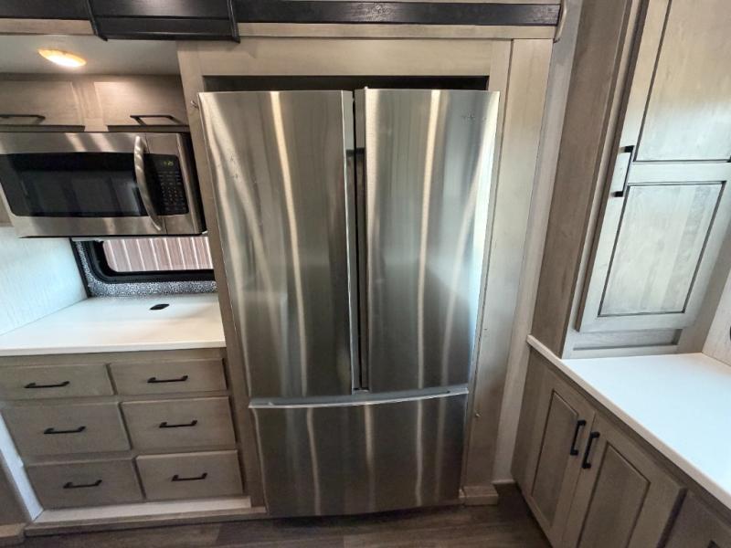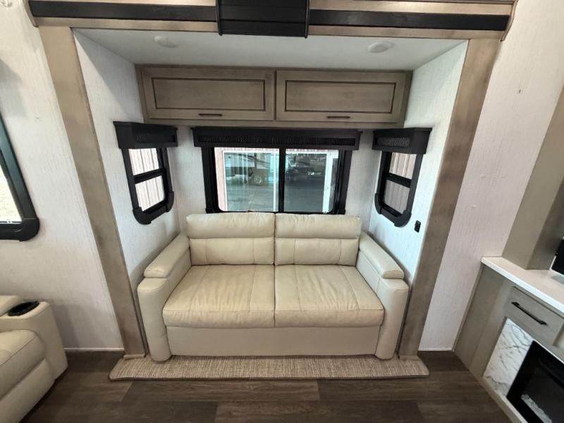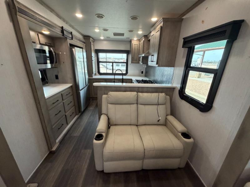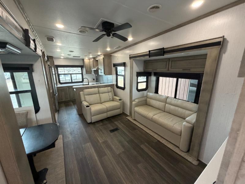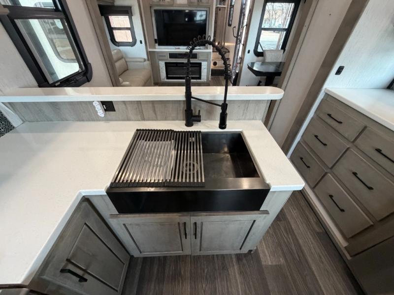 As you travel to glamp, camp or get away from the hustle and bustle of your daily schedule, you will always be comfortable in this fifth wheel with the four slides offering more interior space throughout. The rear kitchen gives the cook their own space to make meals with lots of counter space, a farm style sink, a four burner cooktop, and more! The living area offers two sofas to relax in while visiting or watching a show on the 55" TV, and two slides for more interior space to dine at the free-standing dinette with four chairs. You might need to work from here as well after playing cards or looking out the windows at the scenery. The full bathroom includes two sinks, a shower with a seat and a space saving sliding door. And at night, fall quickly to sleep on your own king bed slide. You might even like to add a few options such as a washer/dryer to the prepped space to keep all the linens clean, a 32" bedroom TV for nighttime entertainment, the Yeti Extreme Weather package, and/or generator prep and a 5.5kw generator.