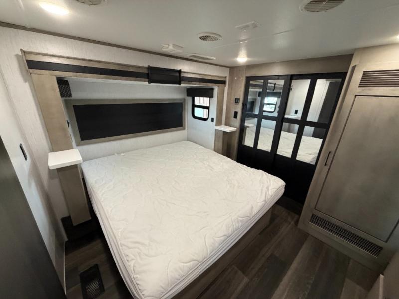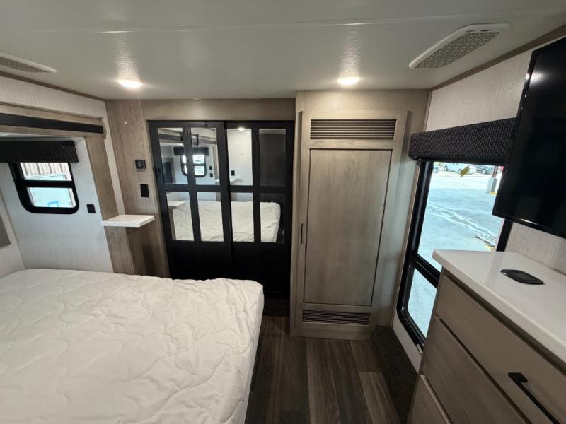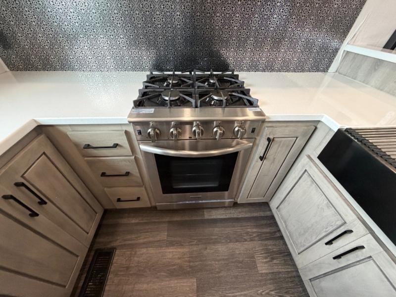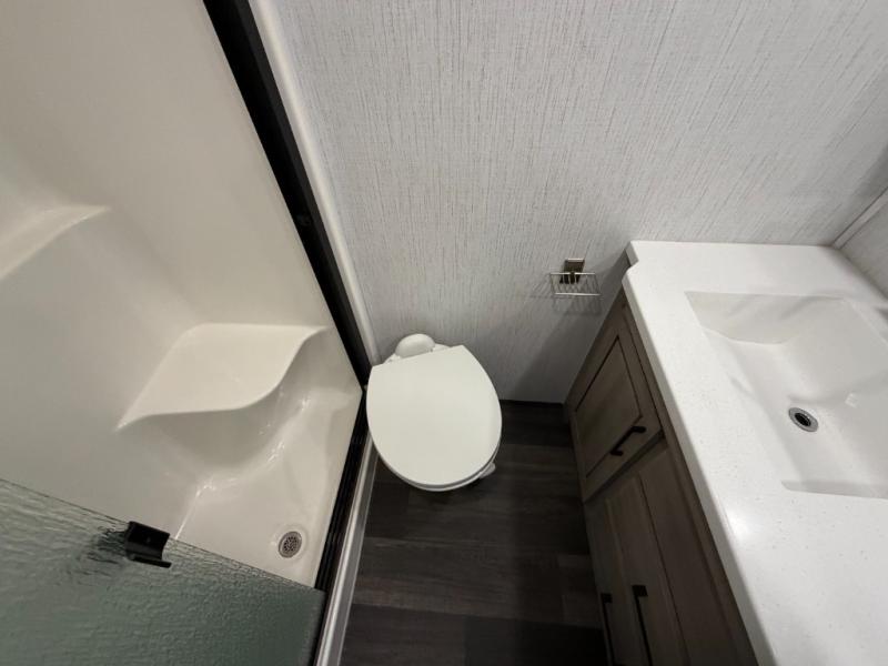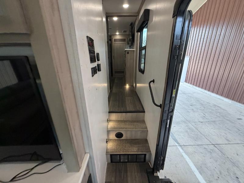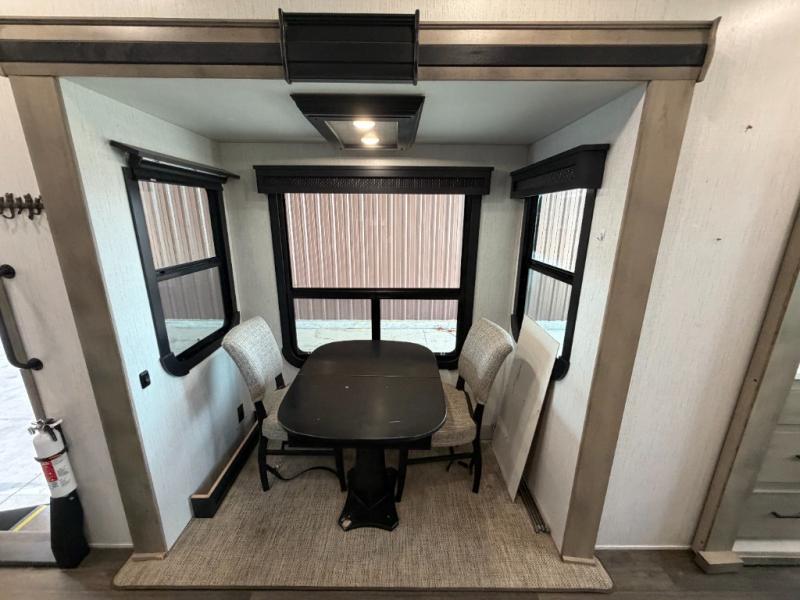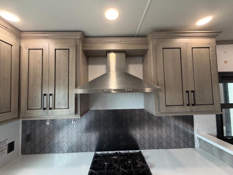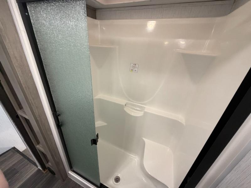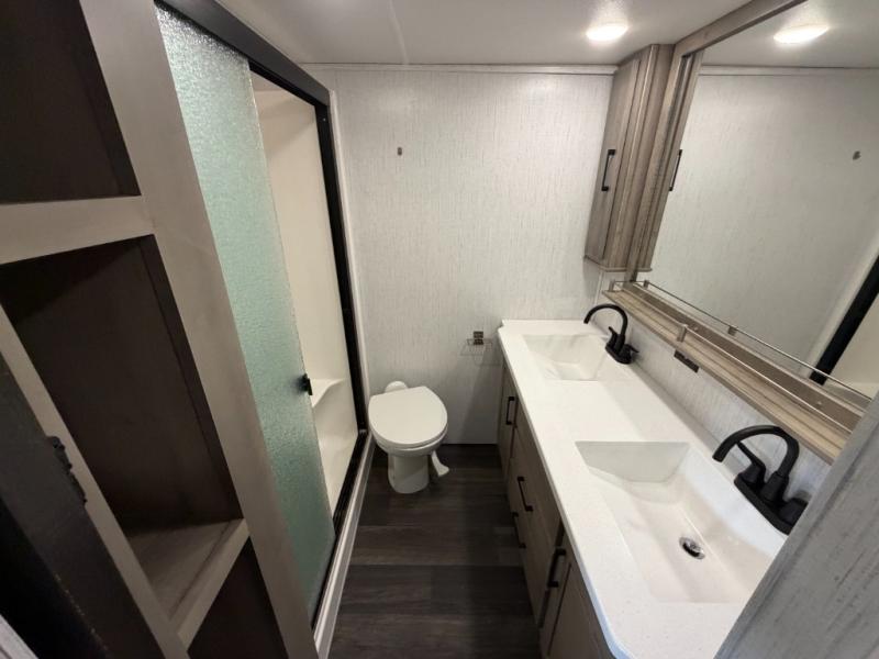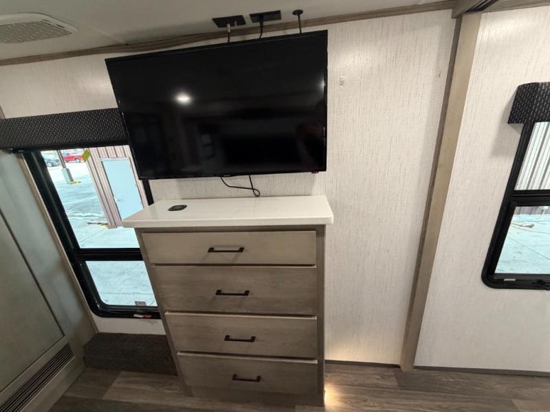 As you travel to glamp, camp or get away from the hustle and bustle of your daily schedule, you will always be comfortable in this fifth wheel with the four slides offering more interior space throughout. The rear kitchen gives the cook their own space to make meals with lots of counter space, a farm style sink, a four burner cooktop, and more! The living area offers two sofas to relax in while visiting or watching a show on the 55" TV, and two slides for more interior space to dine at the free-standing dinette with four chairs. You might need to work from here as well after playing cards or looking out the windows at the scenery. The full bathroom includes two sinks, a shower with a seat and a space saving sliding door. And at night, fall quickly to sleep on your own king bed slide. You might even like to add a few options such as a washer/dryer to the prepped space to keep all the linens clean, a 32" bedroom TV for nighttime entertainment, the Yeti Extreme Weather package, and/or generator prep and a 5.5kw generator.