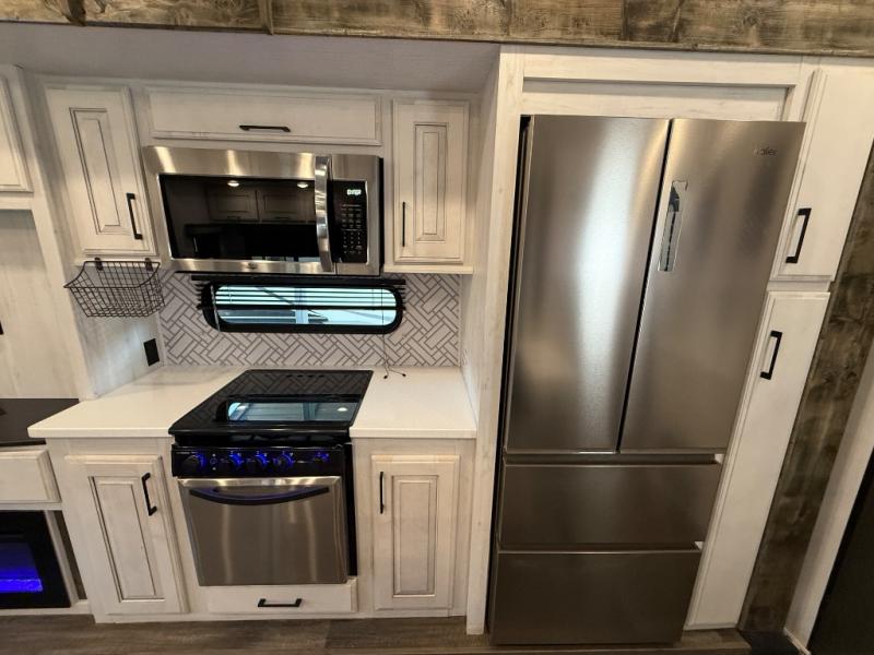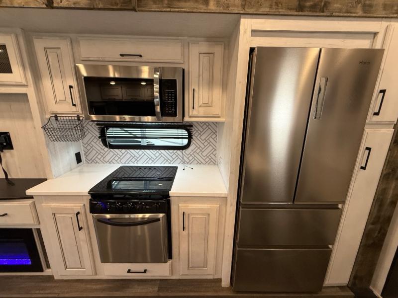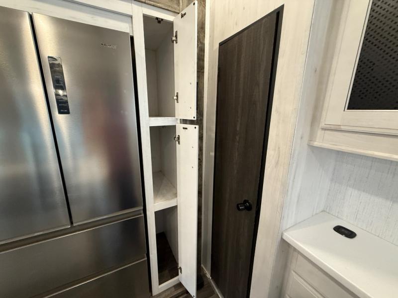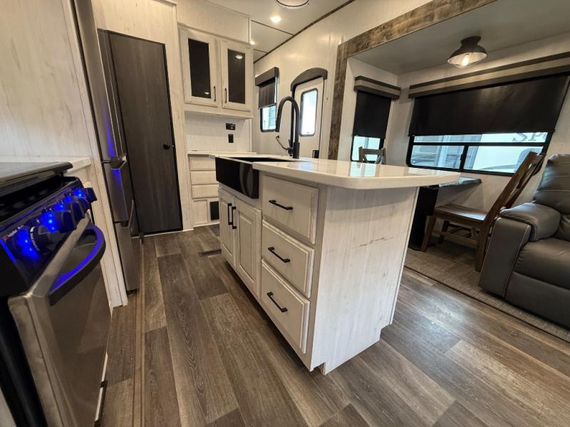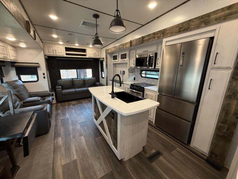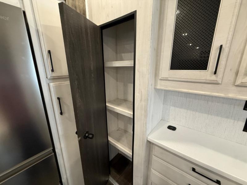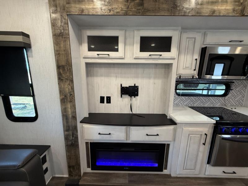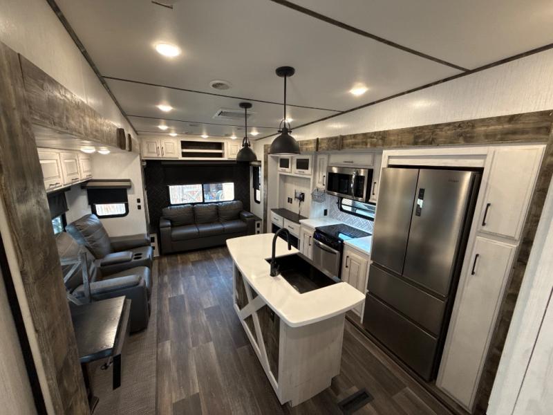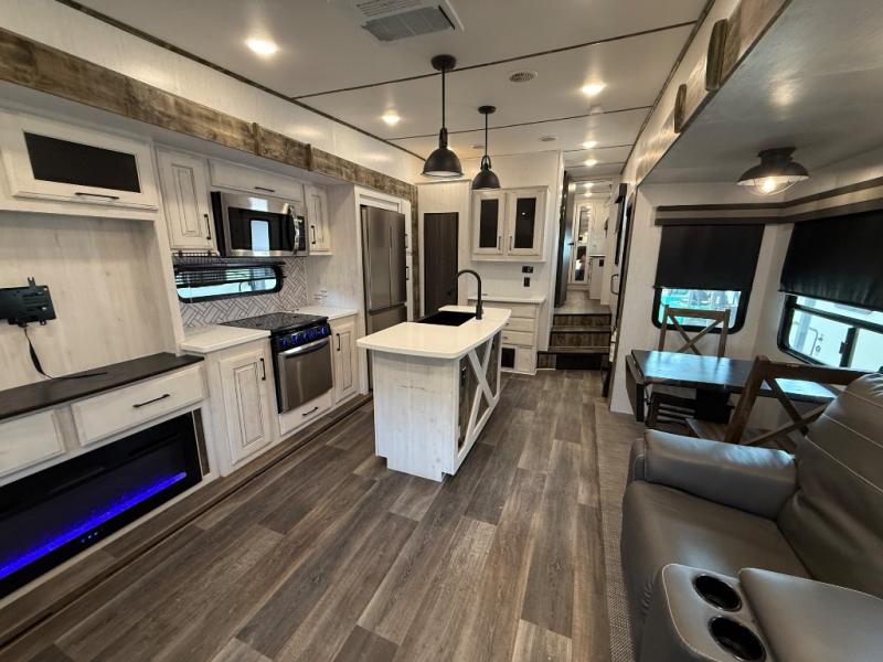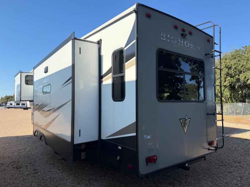 This Bighorn Traveler fifth wheel is your ticket to fun and adventure. The dual opposing slides in the main living area open your living space, and the kitchen island provides more counter space to prep meals. You'll also find a pantry and 20" deep residential size kitchen drawers for all your kitchen storage needs. Your crew can relax on the rear sofa or on the theater seats across from the entertainment center and 40" fireplace. The 6' 4" bath ceiling height will allow you to clean up just like you would at home, and there is a doomed skylight to let natural light in. You will feel at home in the front bedroom that includes a king bed, large unobstructed under-bed storage, and a large front closet for your clothes, shoes, and jackets!