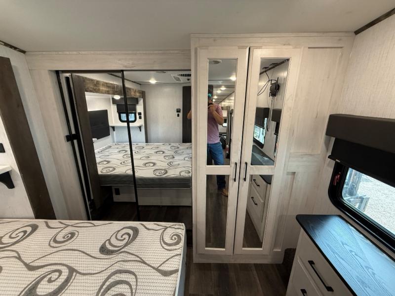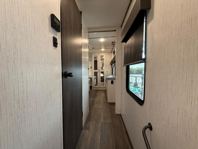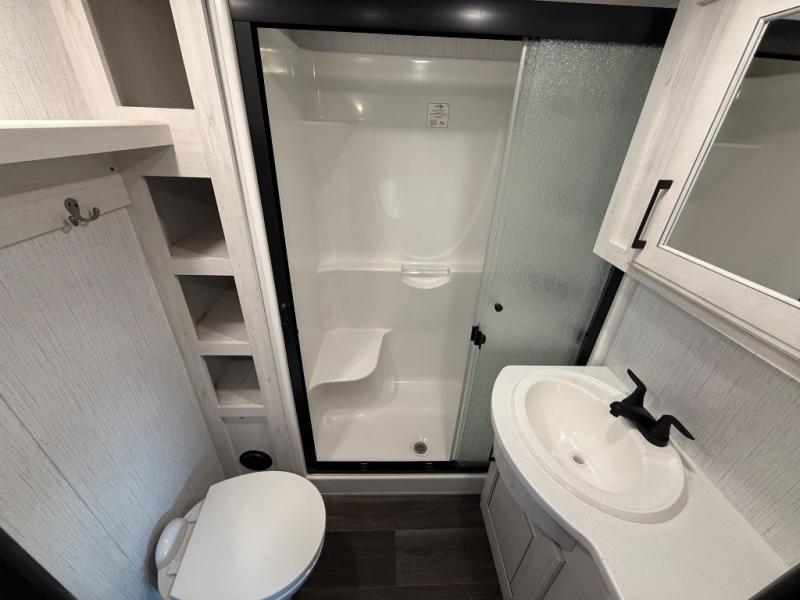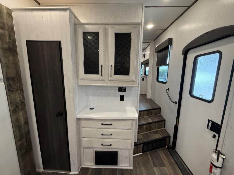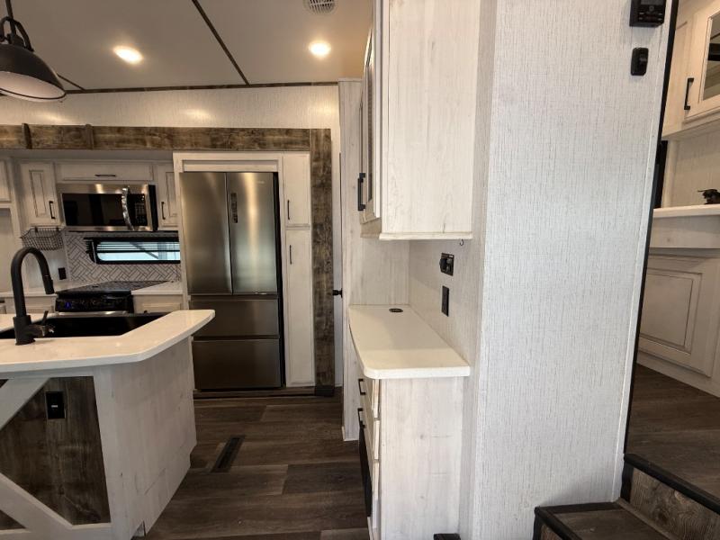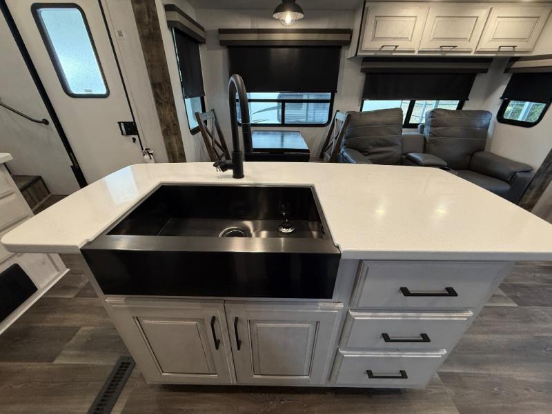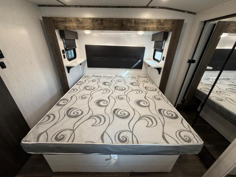 Each Bighorn Traveler fifth wheel by Heartland is constructed with lightweight Azdel laminated sidewalls, a walkable roof, and a heated and enclosed underbelly for an added layer of protection. The MORryde strut-assisted "Step Above" folding aluminum treat entry staircase will provide stability when entering your fifth wheel, and the MORryde CRE3000 rubber suspension will ensure smooth towing, especially on tougher terrain. Your electronics are welcome here with dual wireless charging ports and dual Bluetooth speaker ports in each model, and the "Barefoot Friendly" carpet-free flooring is both kid and pet-friendly. Some of the residential comforts you'll find in the Bighorn Traveler are the real wood drawer construction, the recessed LED ceiling lighting, and the in-house milled and finished solid surface countertops throughout!