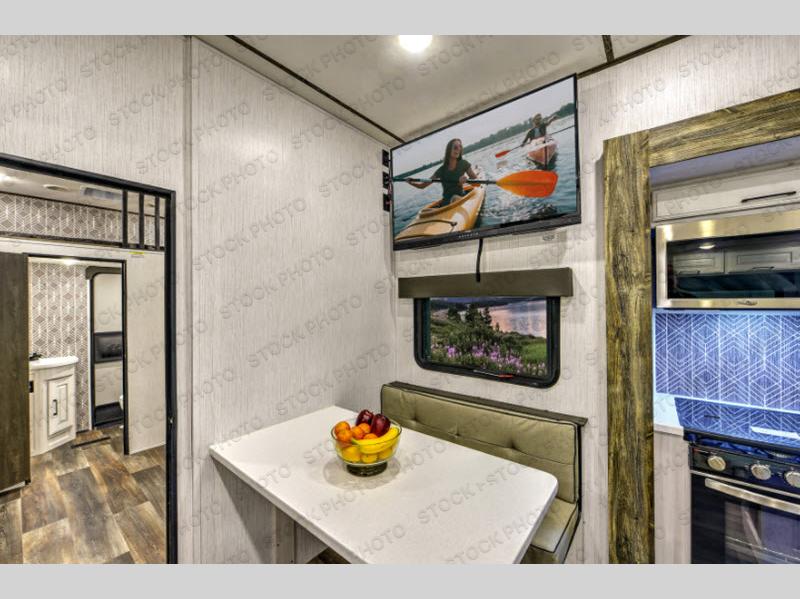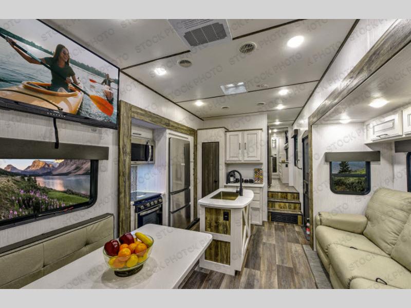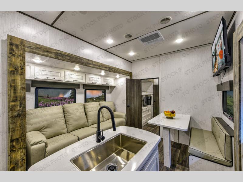 Each Bighorn Traveler fifth wheel by Heartland is constructed with lightweight Azdel laminated sidewalls, a walkable roof, and a heated and enclosed underbelly for an added layer of protection. The MORryde strut-assisted "Step Above" folding aluminum treat entry staircase will provide stability when entering your fifth wheel, and the MORryde CRE3000 rubber suspension will ensure smooth towing, especially on tougher terrain. Your electronics are welcome here with dual wireless charging ports and dual Bluetooth speaker ports in each model, and the "Barefoot Friendly" carpet-free flooring is both kid and pet-friendly. Some of the residential comforts you'll find in the Bighorn Traveler are the real wood drawer construction, the recessed LED ceiling lighting, and the in-house milled and finished solid surface countertops throughout!