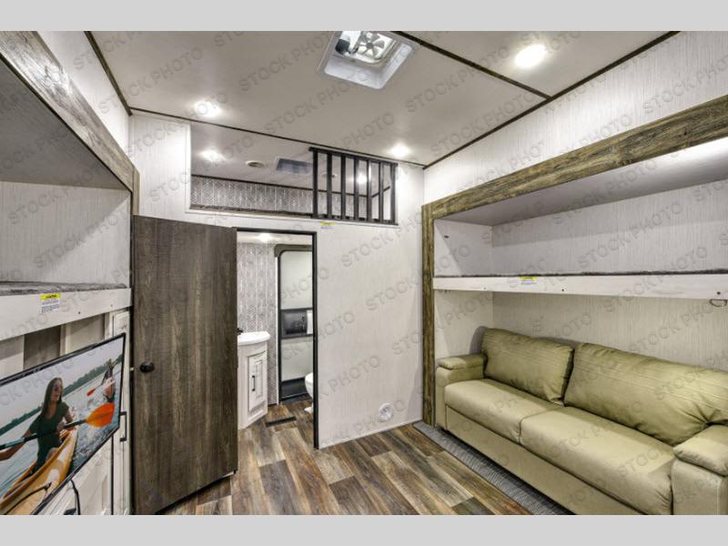 Family and friends will love to tag along for camping trips in this five slide out fifth wheel. The rear bunkhouse suite features dual opposing slides, a full bath with its own exterior entry door, plus a loft! You will enjoy the front private bedroom all to yourselves with a king bed slide out, a large front closet with washer and dryer prep, and quick access into the second full bath. Everyone will love to meet in the middle kitchen that also includes dual opposing slides, a large sofa, plus a dinette with bench seating the kids are sure to love. The chef of your group can whip up a hearty breakfast on the three burner cooktop, or they may just decide to use the outdoor kitchen!
