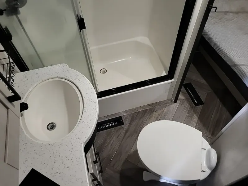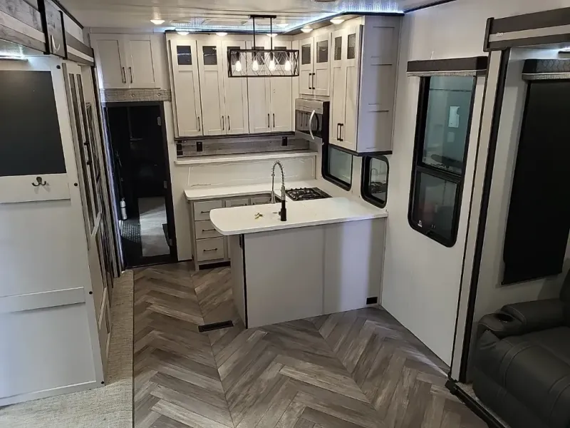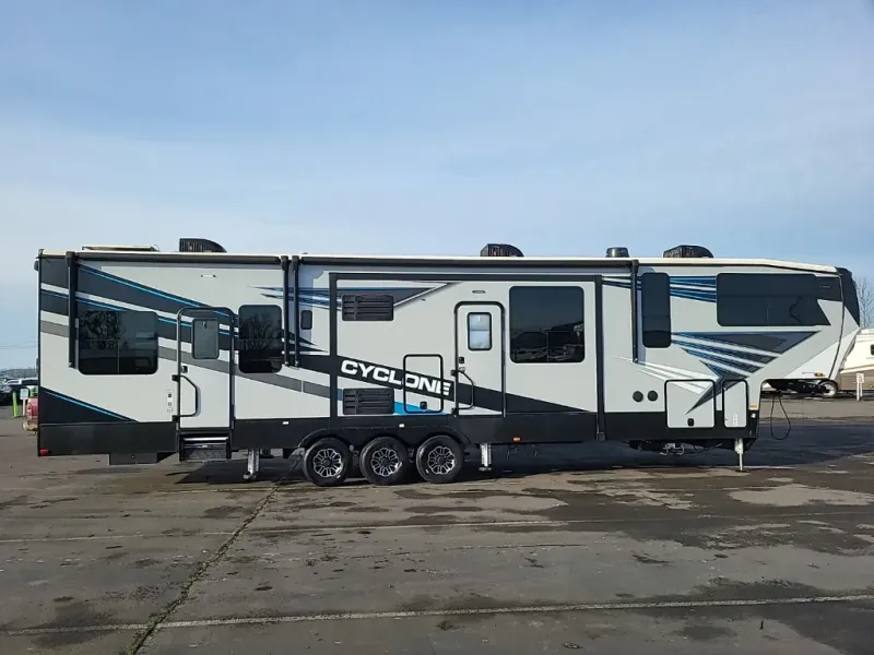 Satisfy your wanderlust with a Heartland Cyclone fifth wheel toy hauler! You won't have to sacrifice any luxury either with indulgent features like the king bedroom suite with a "swift space" work station that pulls out from the dresser, a Stor-Mor three-sided access to the basement with 30% more storage capacity, and Step Caddy folding patio step for better stability as you enter or exit the patio. The industry first Grill and Go 25" residential pull out 3 burner griddle combo comes on models with an exterior kitchen for an easier cooking experience. Full height shaker cabinetry provides 25% more storage space so you can bring more camping necessities with you. If you like to dry camp longer then you will appreciate the industry's largest 150 gallons fresh water tanks. Come find the perfect model for you today!