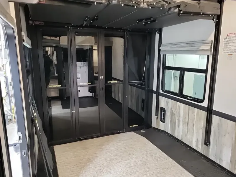 Everyone will have a comfortable place to sit in this toy hauler with the dual opposing theater seating slides and the third theater seating across from the 50" LCD HDTV! The 3,000 lb. weather resistant 8' ramp door makes it easy to load your toys into the 13' garage and then unload them once you have arrived and set up the electric queen bed above the split bench seating, the loft, the half bathroom, and there is even an area prepped to add an optional washer and dryer. There is plenty of countertop space in the U-shaped kitchen to prepare your best home cooked meals, and you even have an outside refrigerator to enjoy a cold beverage underneath the two awnings!