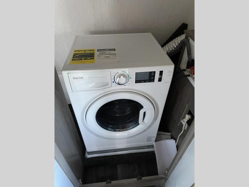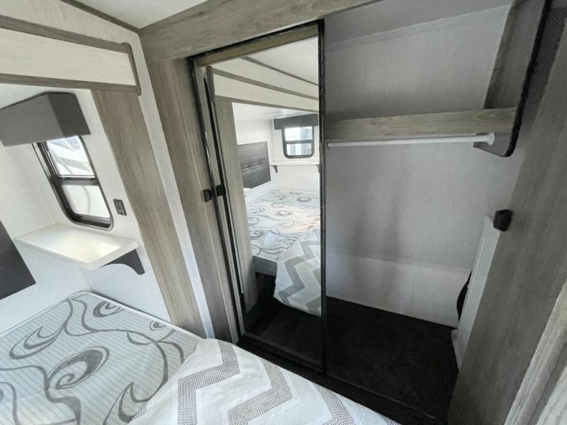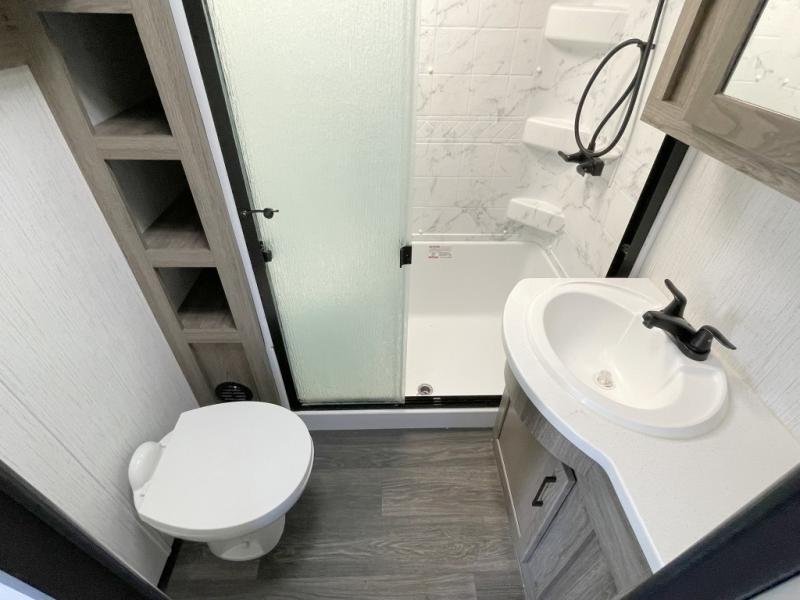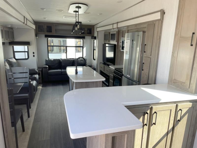 Your family will love camping in this fifth wheel or making it your full-time RV. Once you arrive at your destination, prepare a cold drink at the bar area. Here, you'll appreciate a counter with stools, a sink to wash up, and a mini fridge to keep your beverages cold. There is also a free-standing dinette table where the kids can play a game of cards at, and theater seating to kick your feet up. You and your spouse will love the front private bedroom, while the grandkids sleep on the sofa in the rear living area. In the morning, prepare breakfast on the three burner cooktop before heading out to find a trail or two!