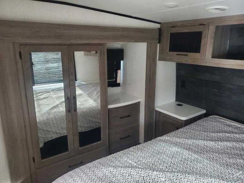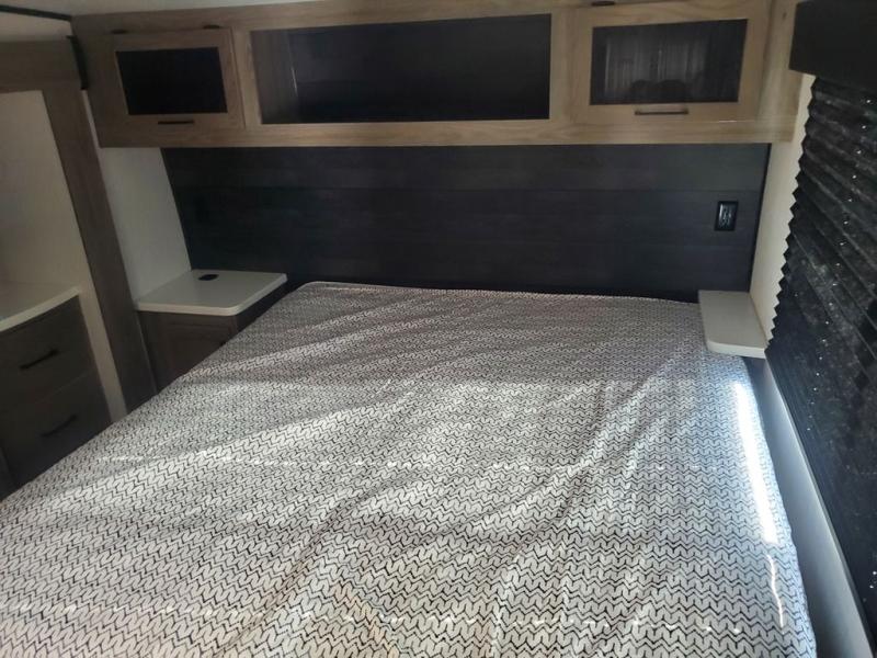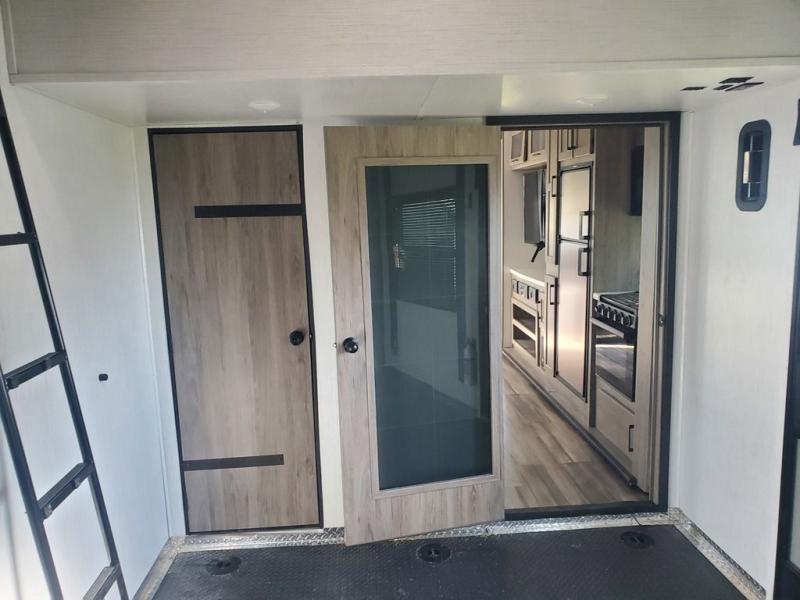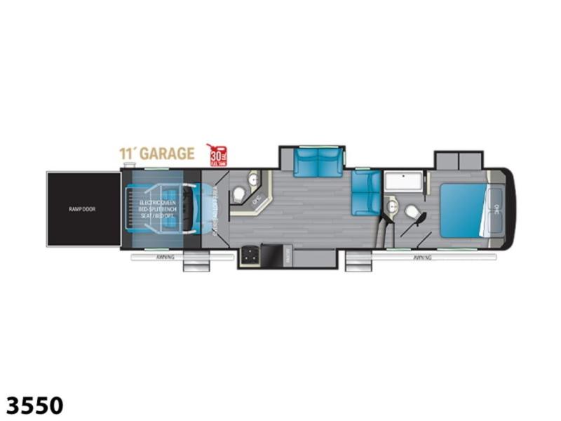 Unload your bikes from the 11' separate garage and head out on adventures with this toy hauler! Once your toys are unloaded, you can put the electric queen bed down if your guests need a rest, plus there is a loft area and a half bath for added convenience. The kitchen and main living area are spacious thanks to the dual opposing slides, and there are two sofas here to visit with friends. The dual entry bath will create a front master bedroom you are sure to love. Here, you can get a great night's rest on the king bed and store your things in the wardrobe slide.