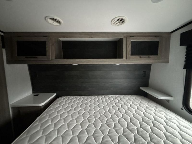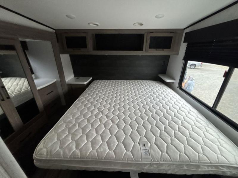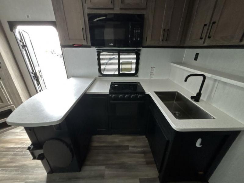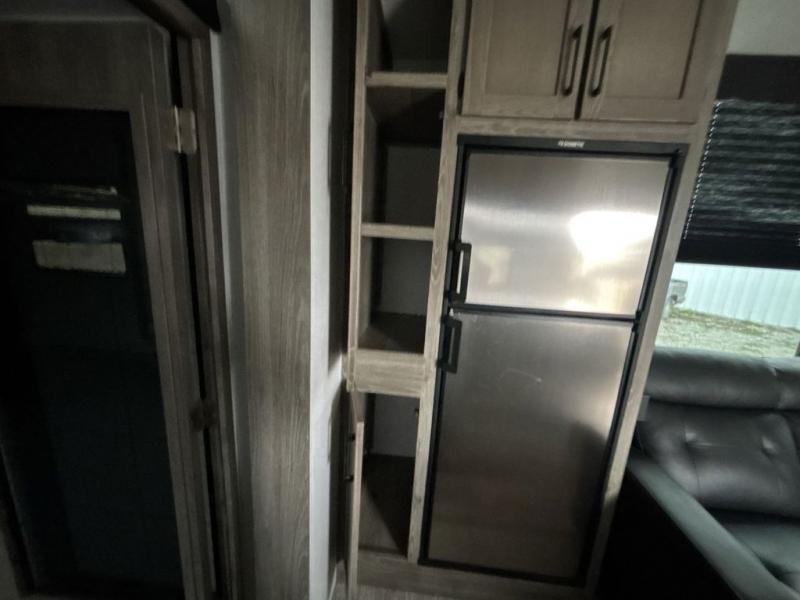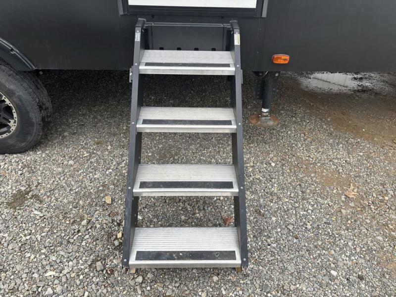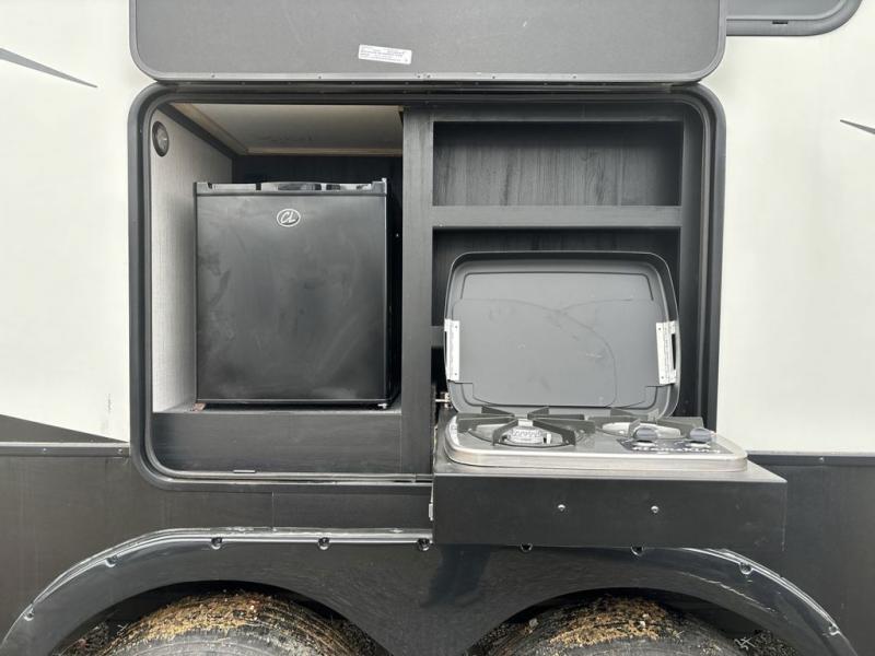 Whether you choose to bring along kayaks, dirt bikes, or a side-by-side, this toy hauler is equipped for all your adventures. Once you unload using the ramp door, you can relax on the convertible sofa while your teens climb in the loft area. The main living area is made spacious thanks to the slide out that includes reclining sofa seating with cup holders and USB ports. The chef of your group can prepare meals on the three burner cooktop, or use the microwave oven inside, and there is also an outdoor kitchen that is perfect when you want to cook and eat outdoors. There is a stainless steel refrigerator here, plus a counter with swing-out stools the all are sure to love. The dual entry bath includes a shower with a seat for convenience, and you'll love the front private bedroom with a king bed and a wardrobe slide for more space!