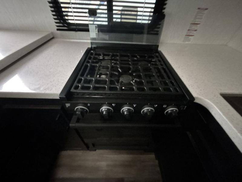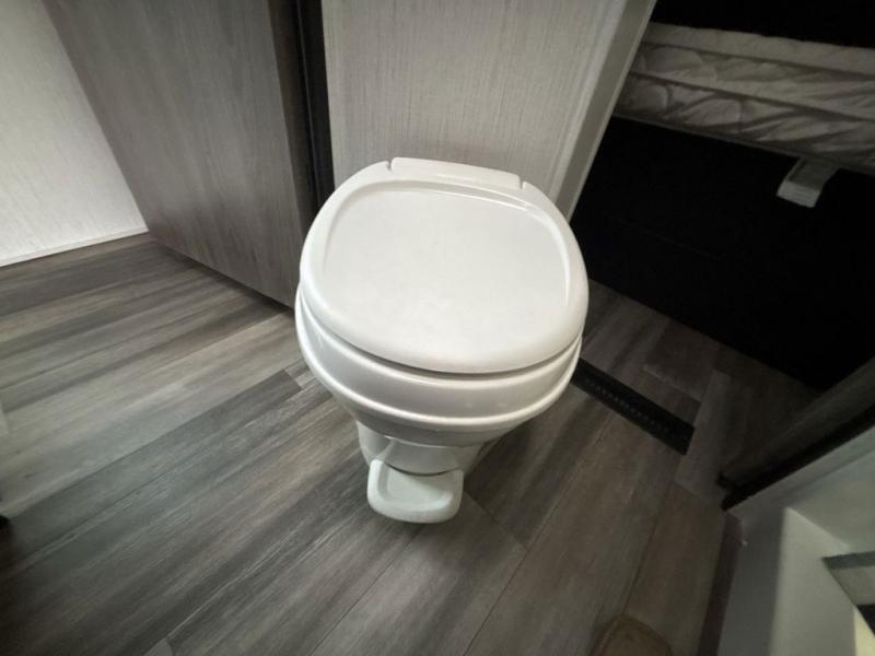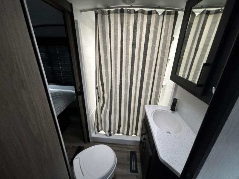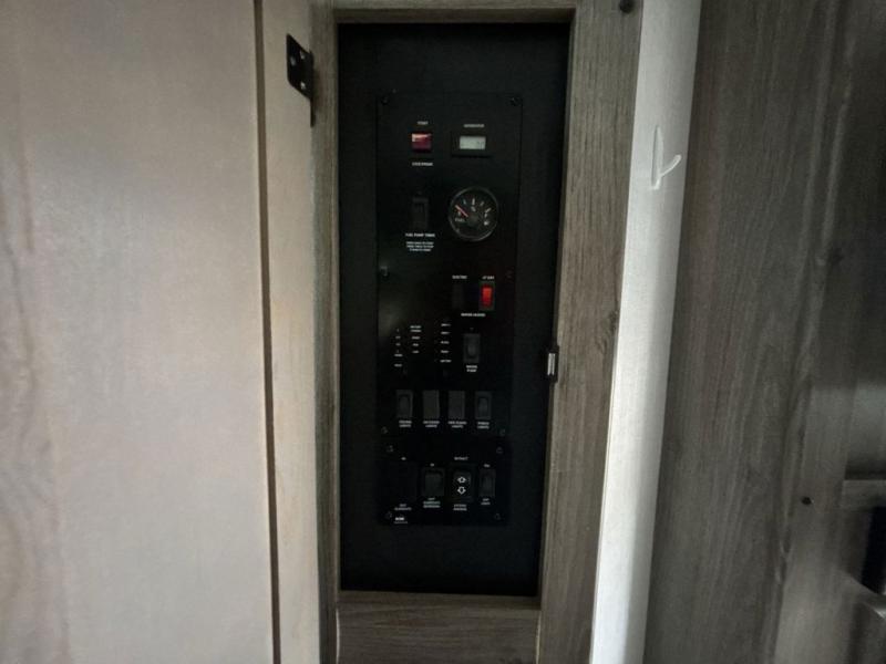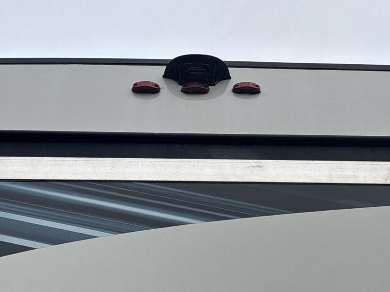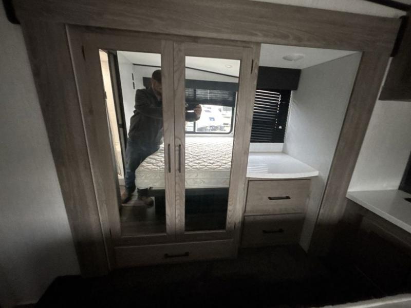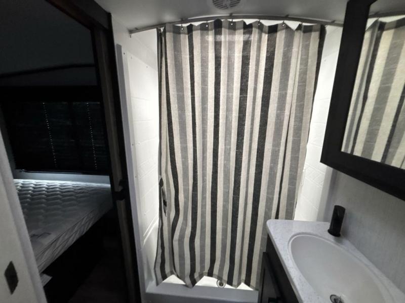 Whether you choose to bring along kayaks, dirt bikes, or a side-by-side, this toy hauler is equipped for all your adventures. Once you unload using the ramp door, you can relax on the convertible sofa while your teens climb in the loft area. The main living area is made spacious thanks to the slide out that includes reclining sofa seating with cup holders and USB ports. The chef of your group can prepare meals on the three burner cooktop, or use the microwave oven inside, and there is also an outdoor kitchen that is perfect when you want to cook and eat outdoors. There is a stainless steel refrigerator here, plus a counter with swing-out stools the all are sure to love. The dual entry bath includes a shower with a seat for convenience, and you'll love the front private bedroom with a king bed and a wardrobe slide for more space!