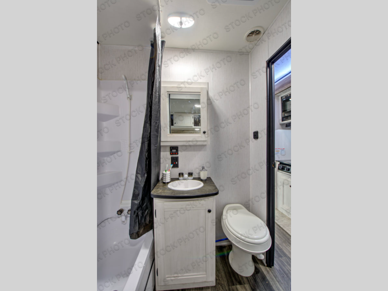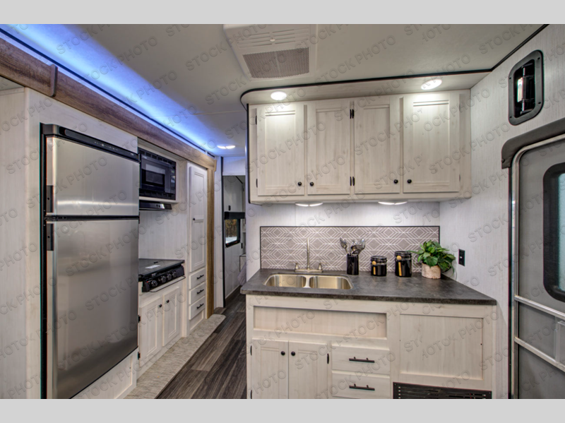 You will have a comfortable and fun camping trip with all of your toys in this toy hauler! Start each morning feeling clean and refreshed after sleeping on the walk around king bed in the front private bedroom and showering in the dual entry bathroom. Grab some eggs and bacon from the 10 cu. ft. refrigerator and fry them up on the three burner cooktop, and clean up will be a breeze with the double stainless steel sink that has plenty of countertop space next to it for prepping your other meals. The flip-up sofas with table provide a comfortable place to enjoy your meals, play games, and even sleep. There is also another sofa next to the refrigerator for another guest to tag along!