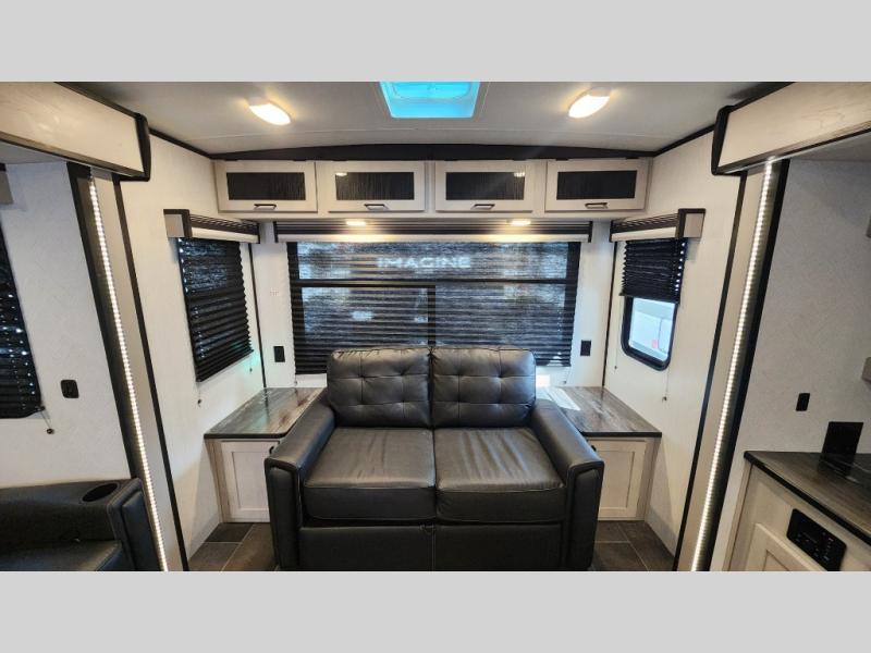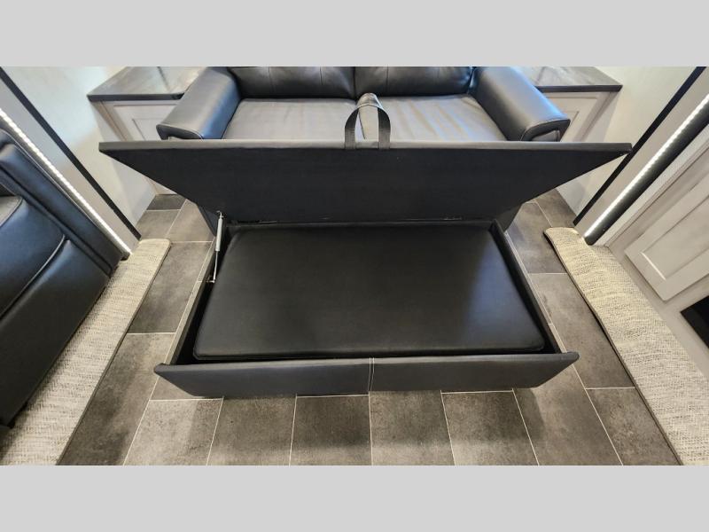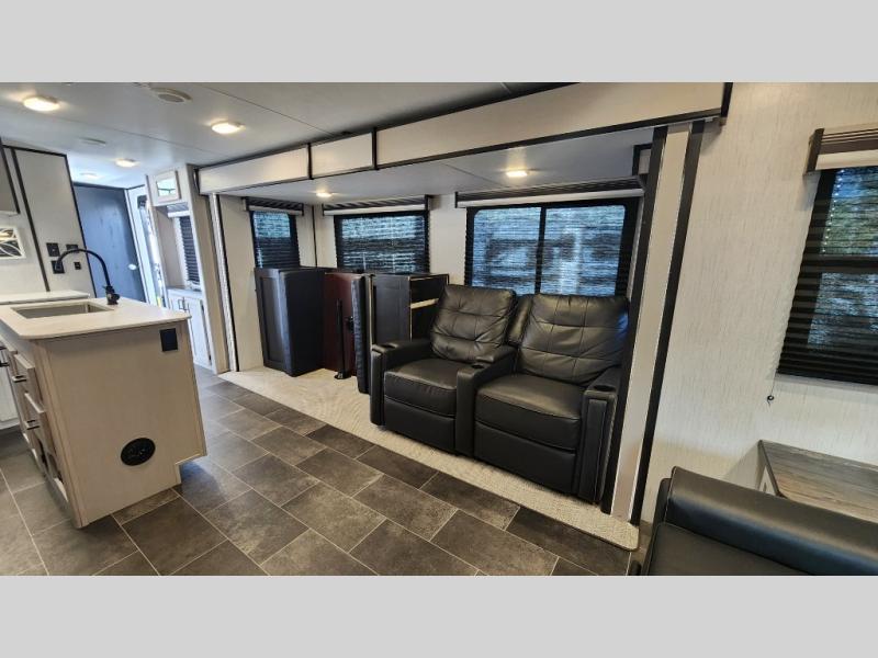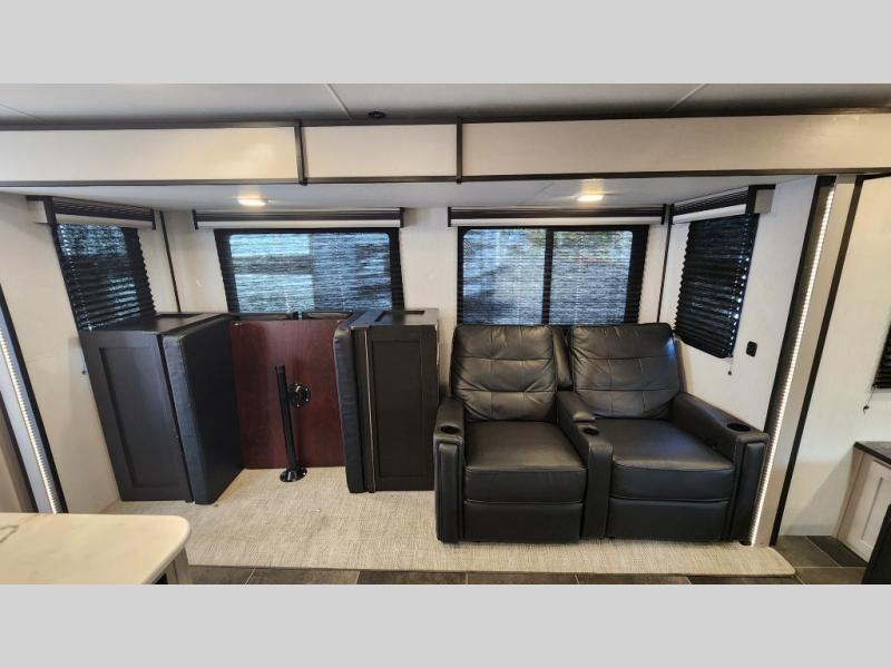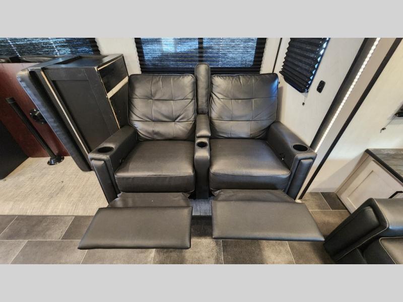 Rear living room with tri-fold sofa, theater seating & entertainment center