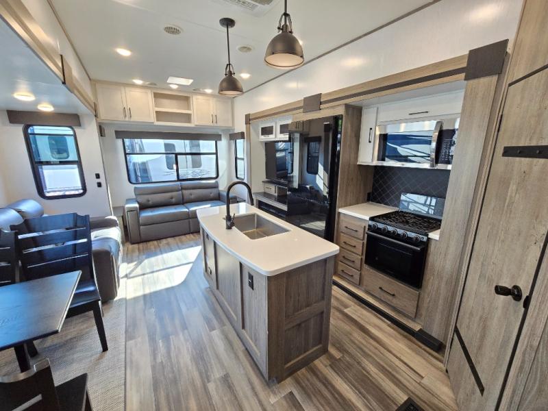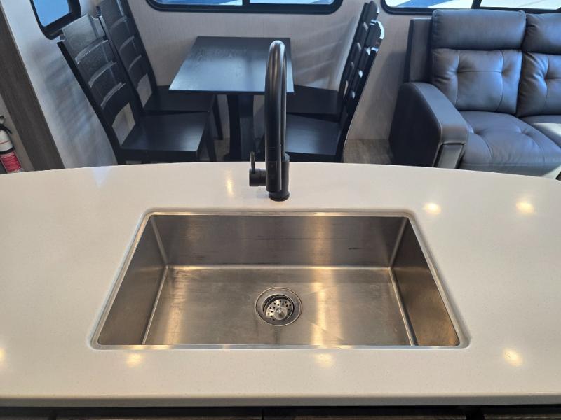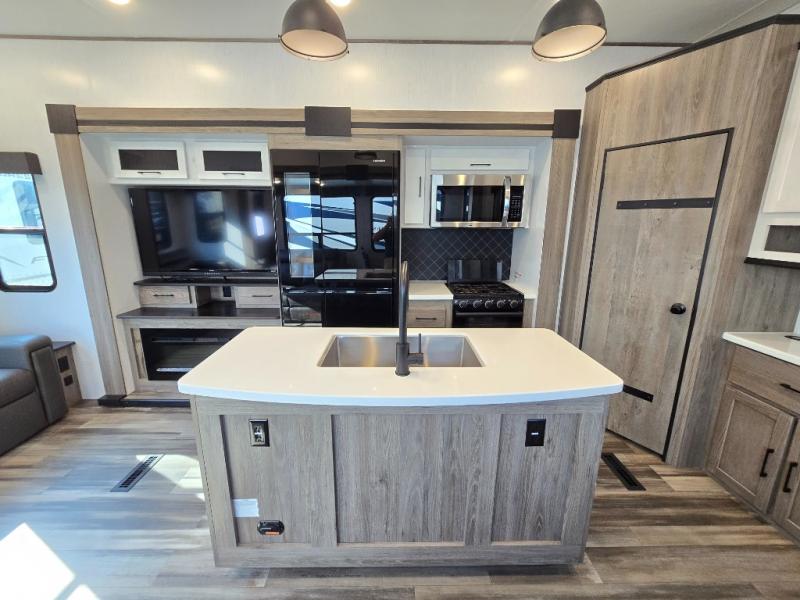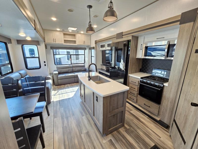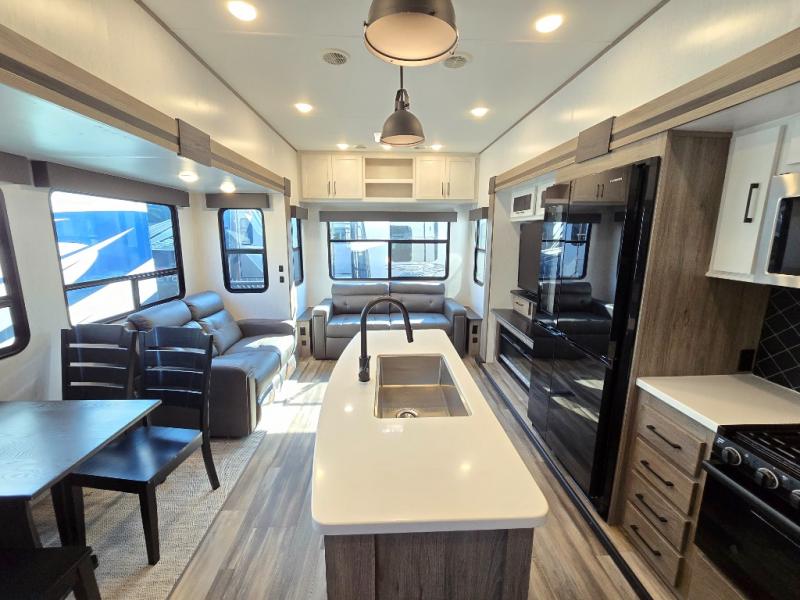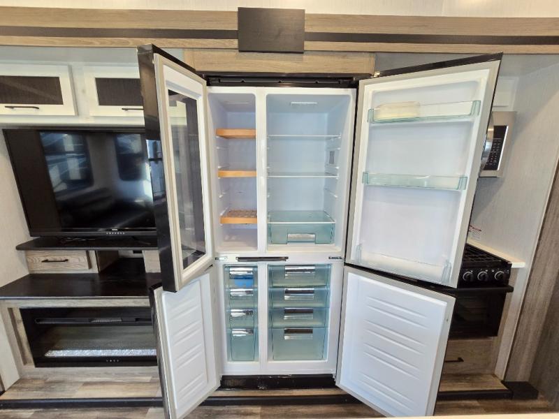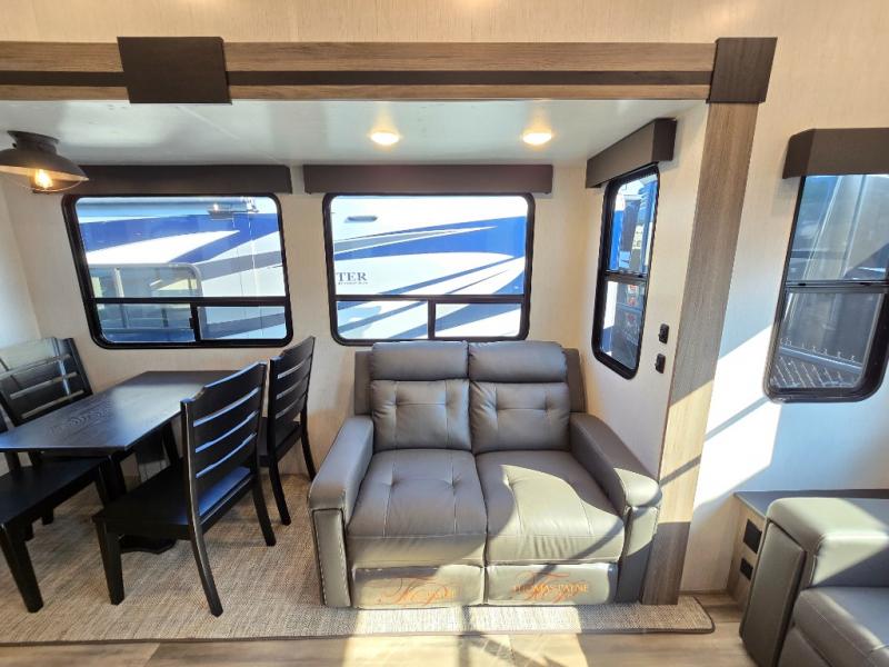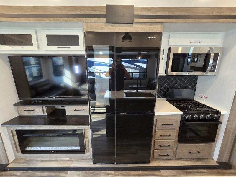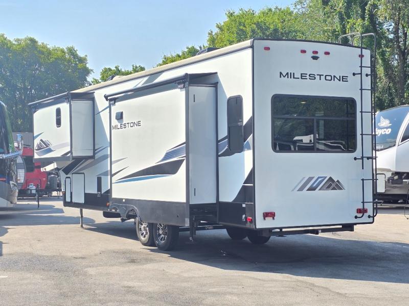 You can make many memories with this Milestone fifth wheel! There is an accommodating kitchen that offers you a residential refrigerator with wine cooler, a large corner pantry, a 30" over-the-range microwave, and a 21" large RV oven. The entertainment center holds a 50" TV with integrated sound bar so that you can enjoy a movie or two, and there is comfortable seating with the two sofas. One of the sofas even has foot rests in front to help you relax. The free-standing table with chairs will give you a place to eat your meals, and you can use the exterior camp kitchen to create meals when you want to remain outdoors.