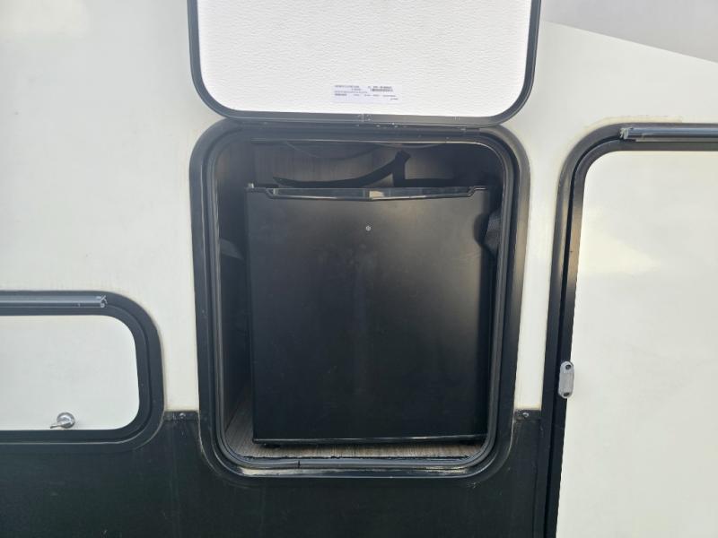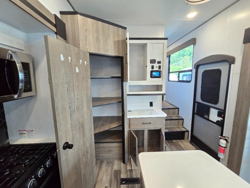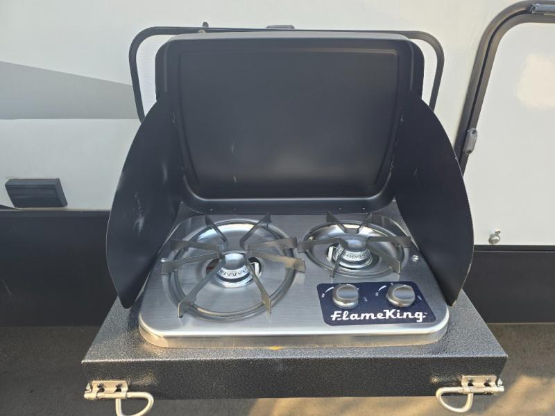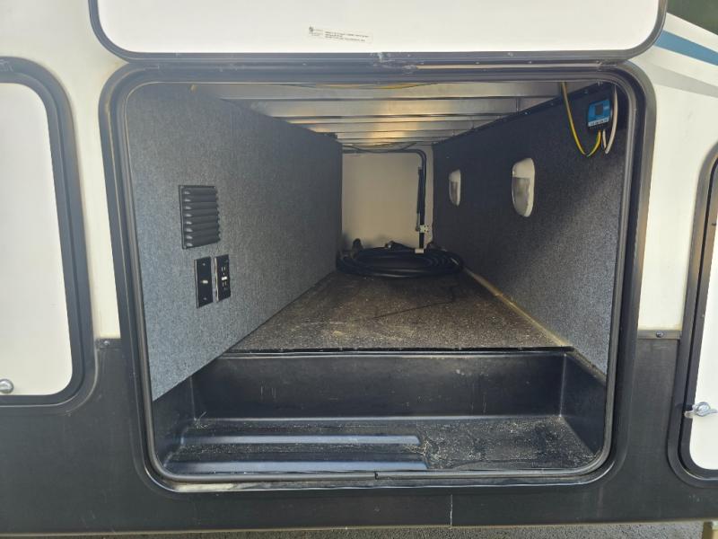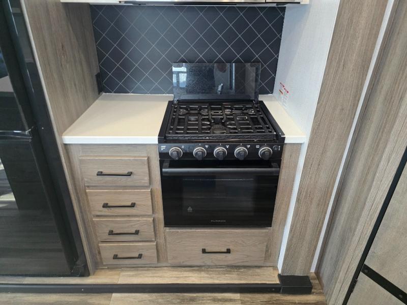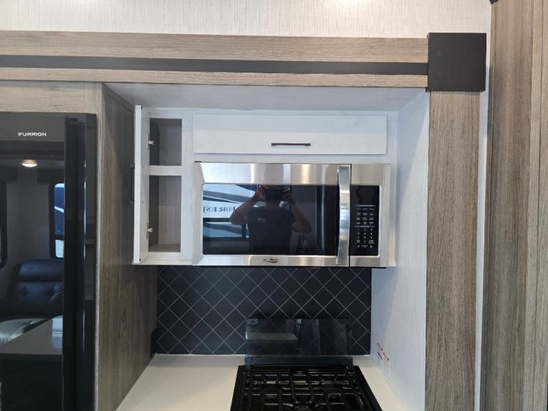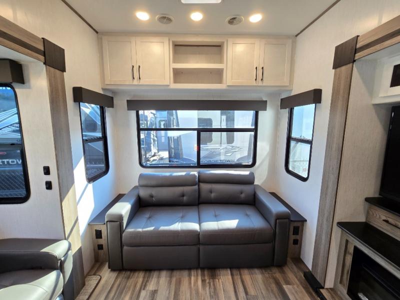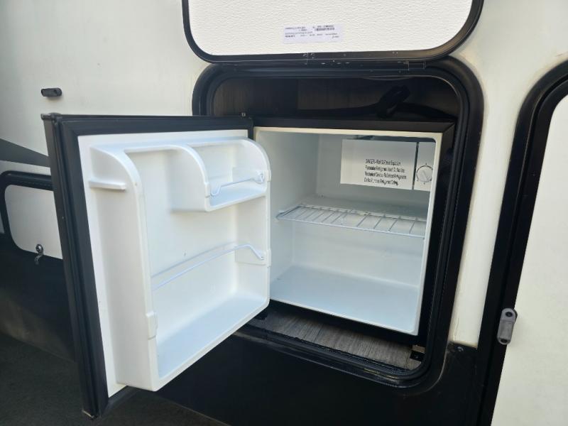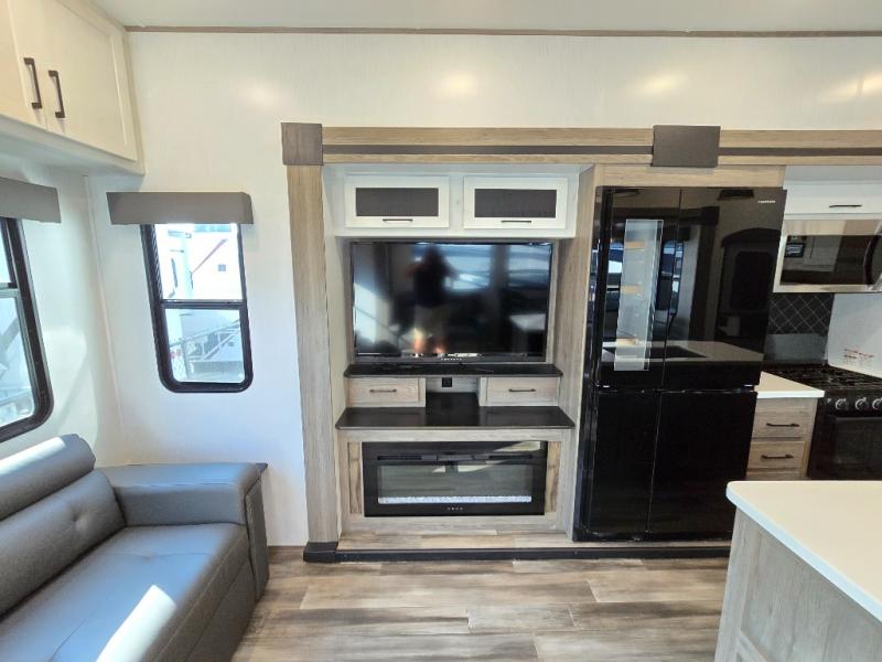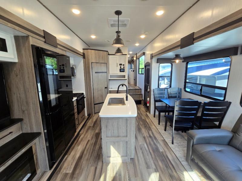 You can make many memories with this Milestone fifth wheel! There is an accommodating kitchen that offers you a residential refrigerator with wine cooler, a large corner pantry, a 30" over-the-range microwave, and a 21" large RV oven. The entertainment center holds a 50" TV with integrated sound bar so that you can enjoy a movie or two, and there is comfortable seating with the two sofas. One of the sofas even has foot rests in front to help you relax. The free-standing table with chairs will give you a place to eat your meals, and you can use the exterior camp kitchen to create meals when you want to remain outdoors.