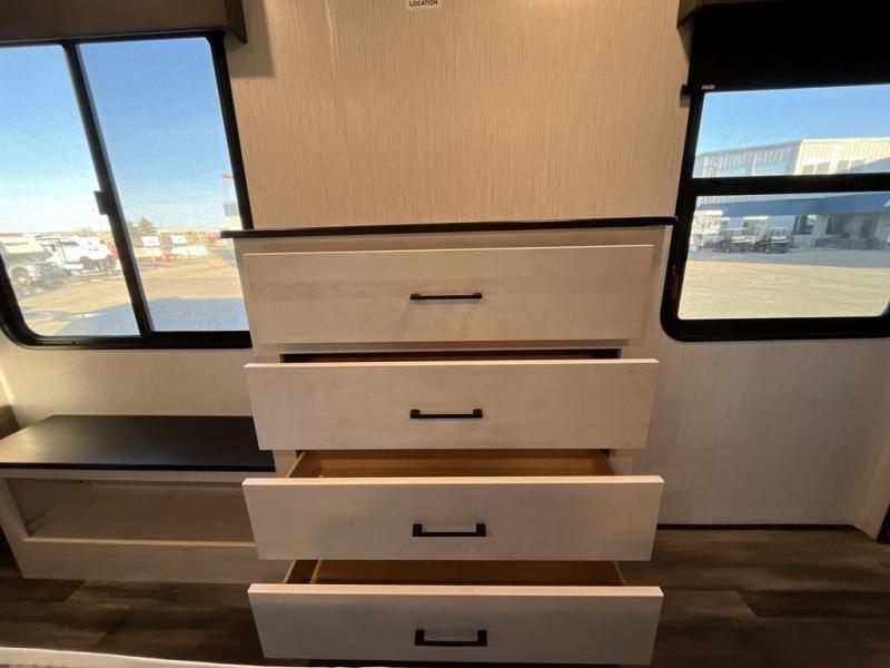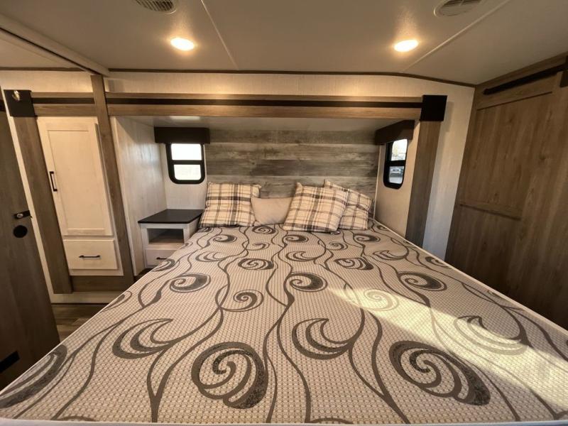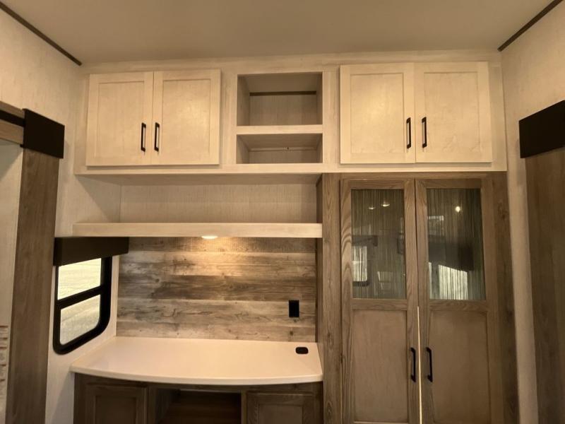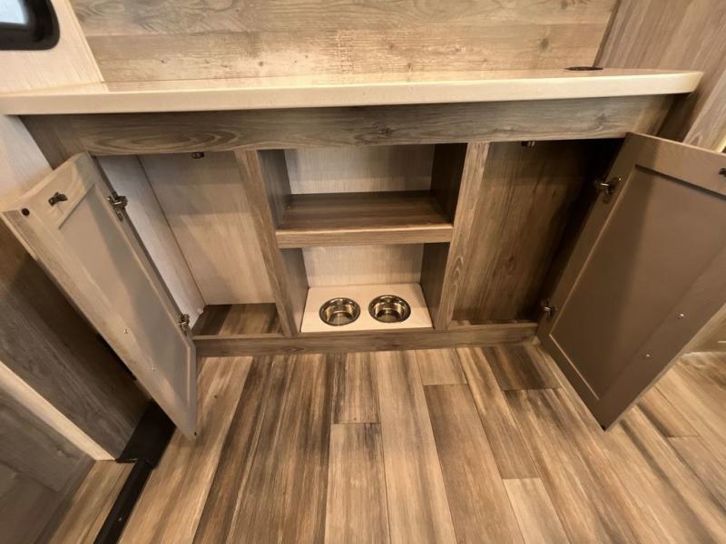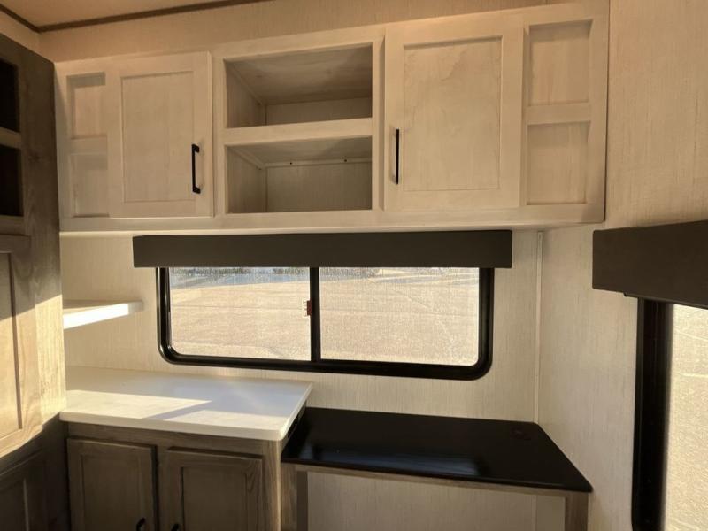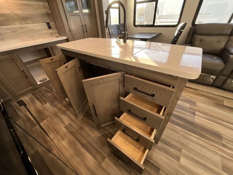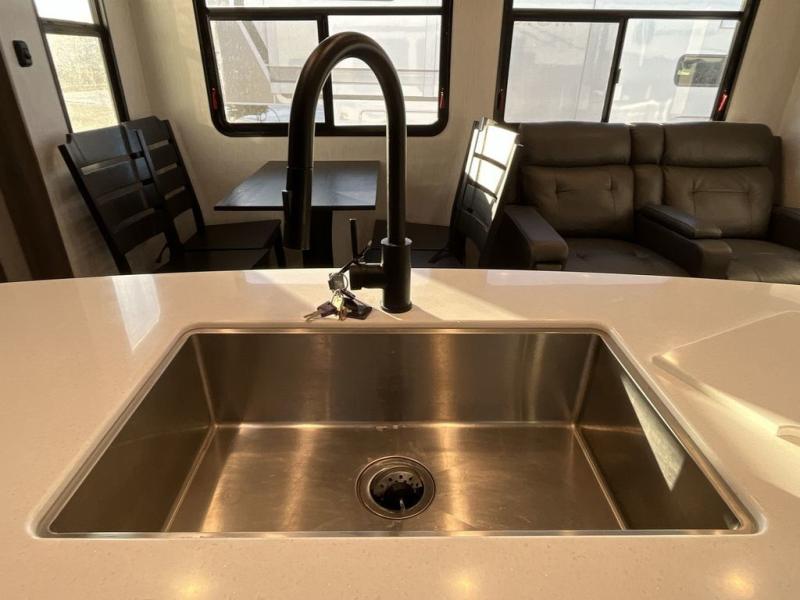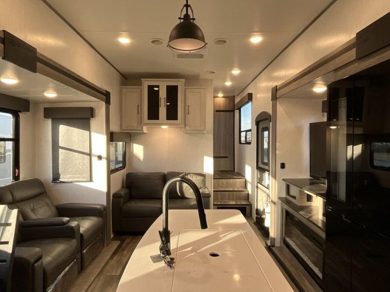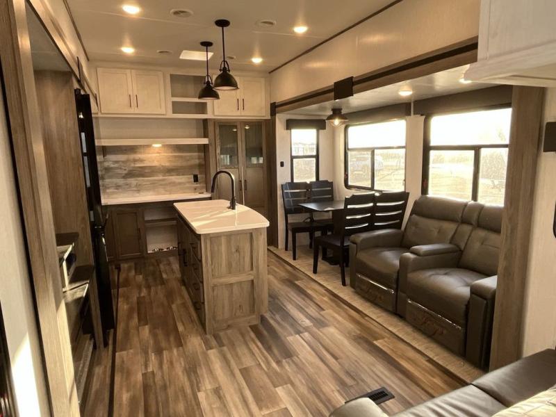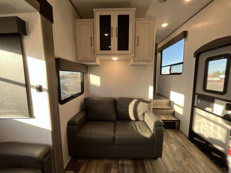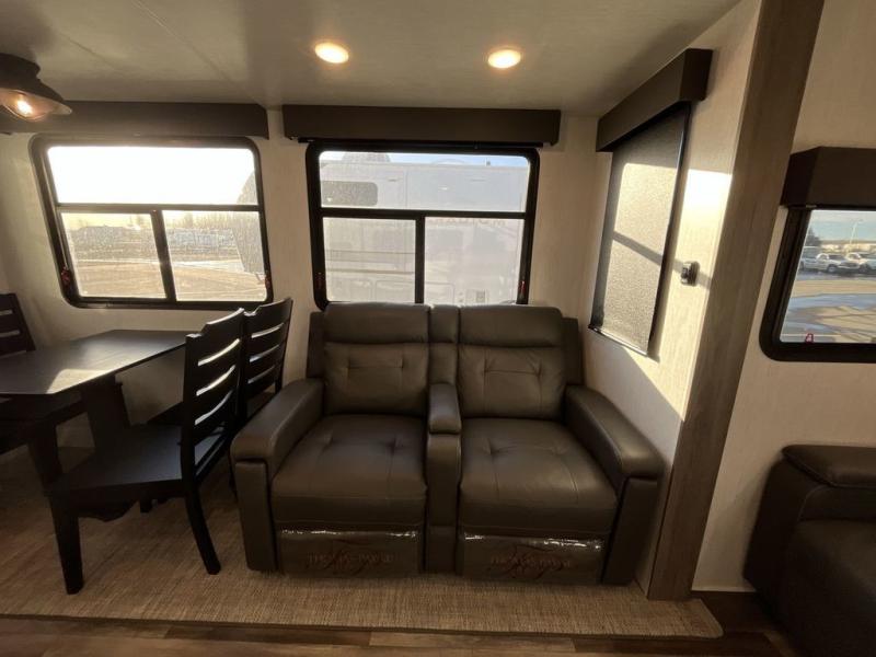 This Milestone fifth wheel has an excellent master suite with a king-size bed to keep you comfortable. The dual-entry bathroom offers you a private entrance into the bedroom, and there is a bedroom bench to help you sit down to put your shoes on. In the main living area, there is a free-standing table with chairs that you can use when you want to eat meals, and there are two sofas to relax on. The best part about this unit is the hidden butler's pantry in the back. This pantry includes a desk and great windows, so you'll be able to also use this space as an excellent work area.