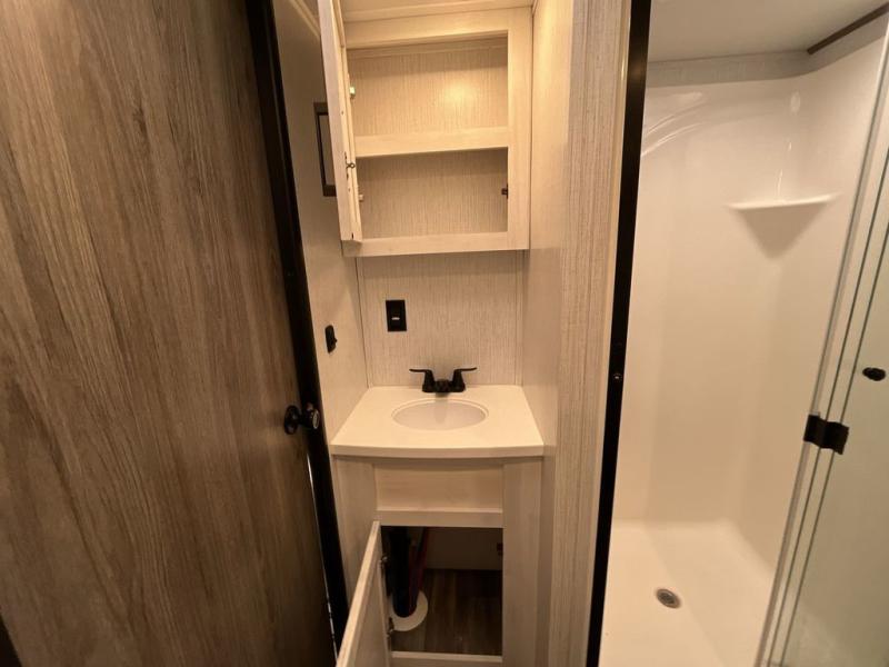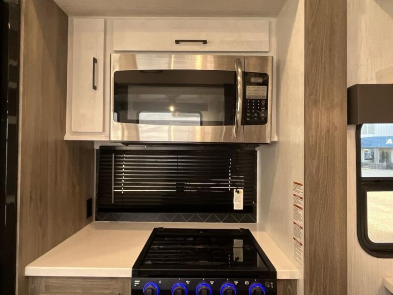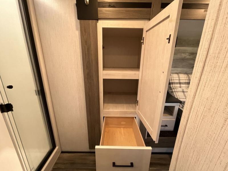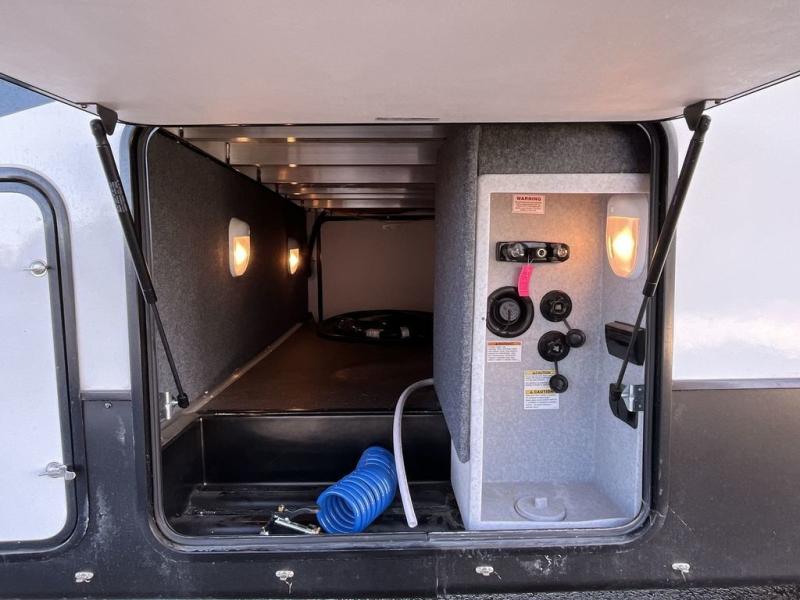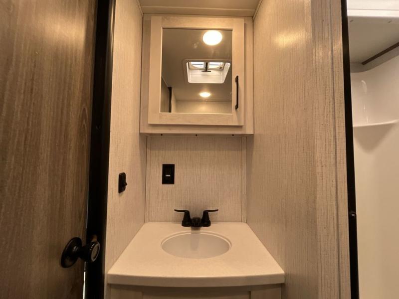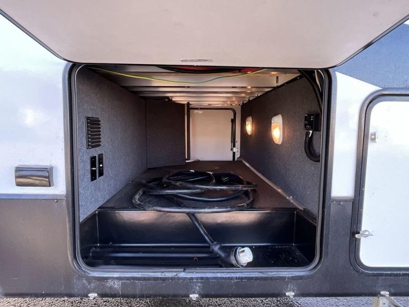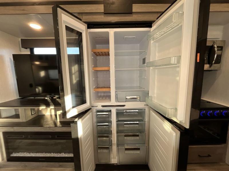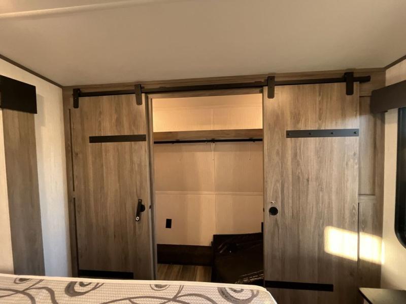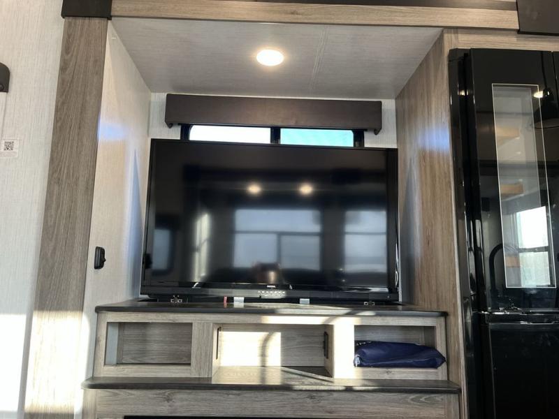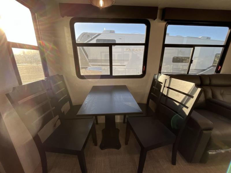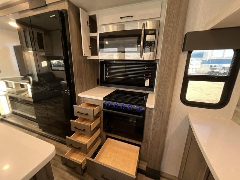 This Milestone fifth wheel has an excellent master suite with a king-size bed to keep you comfortable. The dual-entry bathroom offers you a private entrance into the bedroom, and there is a bedroom bench to help you sit down to put your shoes on. In the main living area, there is a free-standing table with chairs that you can use when you want to eat meals, and there are two sofas to relax on. The best part about this unit is the hidden butler's pantry in the back. This pantry includes a desk and great windows, so you'll be able to also use this space as an excellent work area.