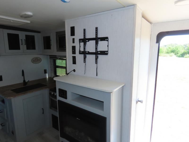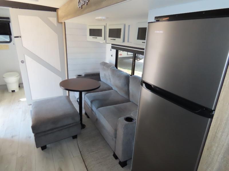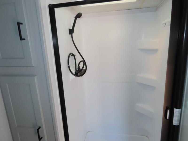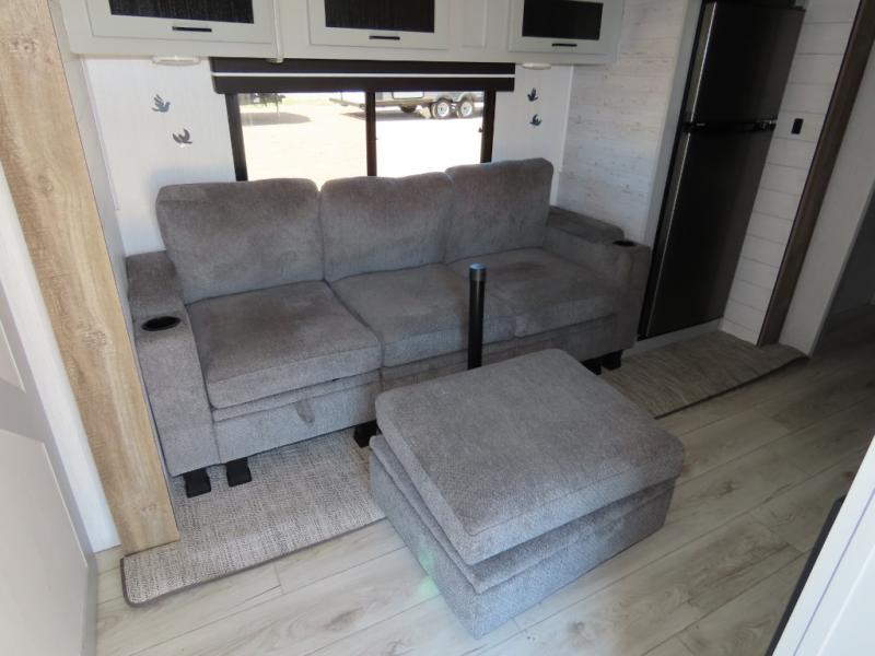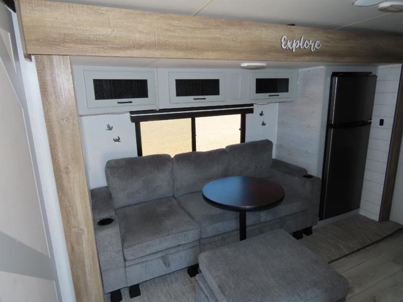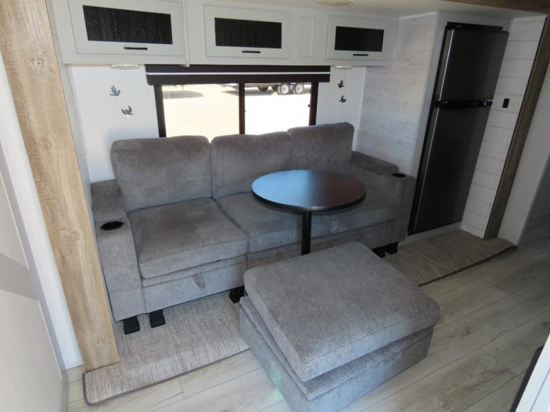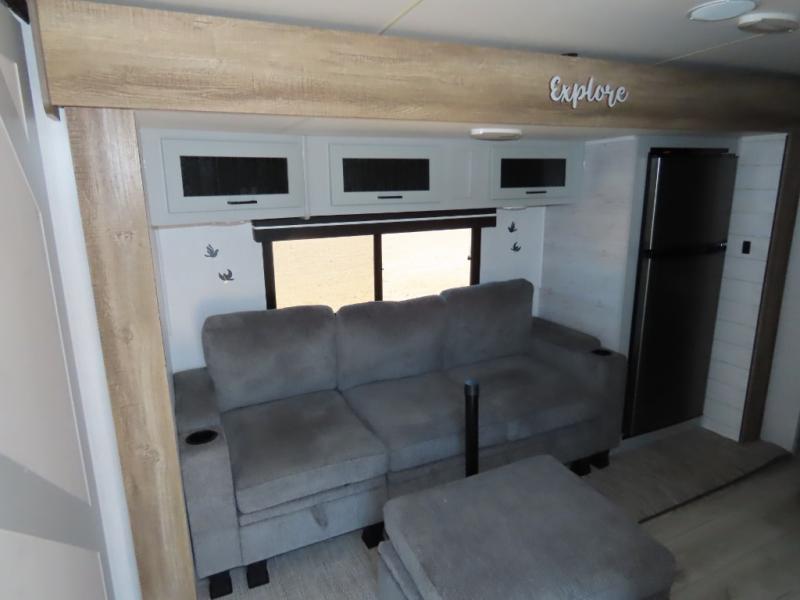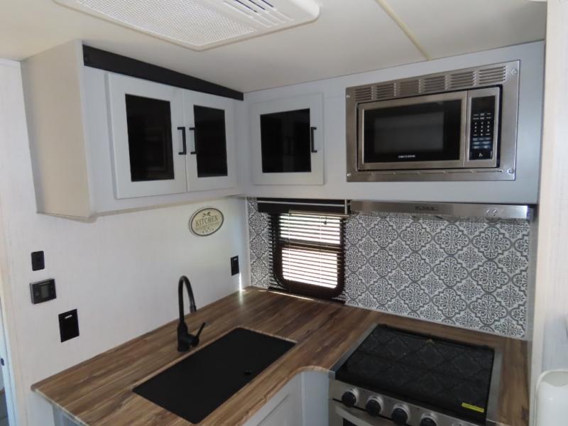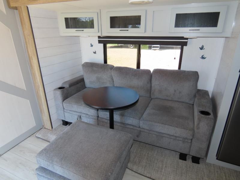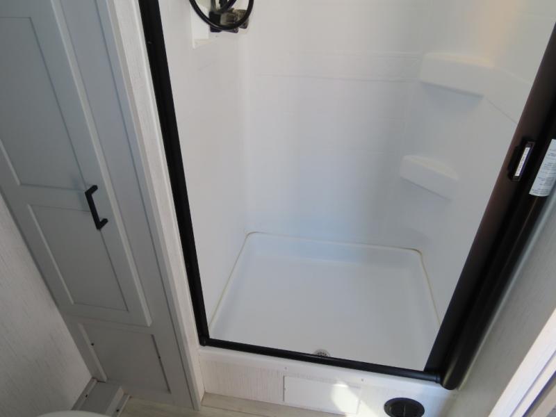 Check out this travel trailer with a full rear bath for added privacy and a front private bedroom that will feel just like home. You can prepare eggs and bacon on the three burner range, or use the microwave oven if you're on the go. This model includes a sofa with a table to dine at each day, or you can enjoy your meal under the 16' power awning with LED lights.