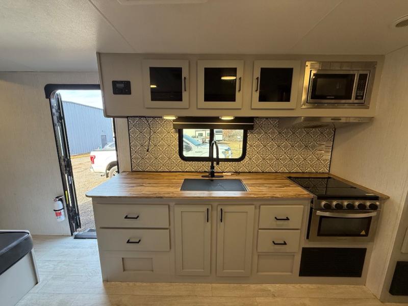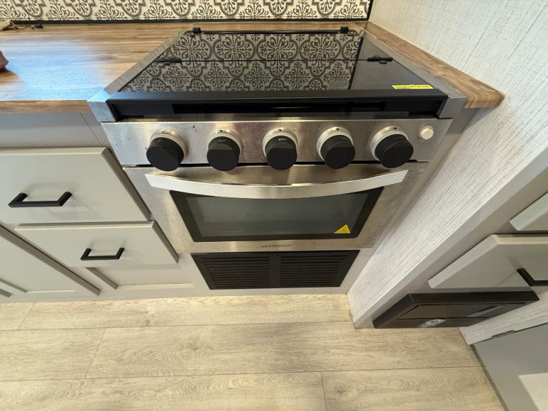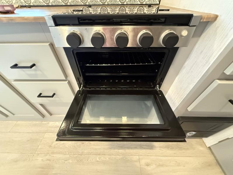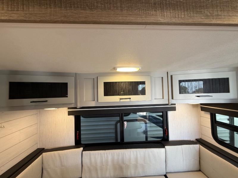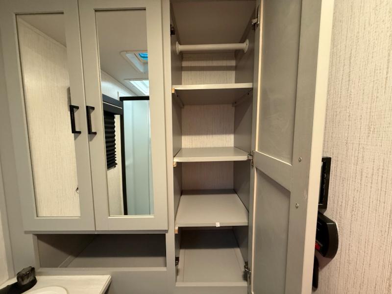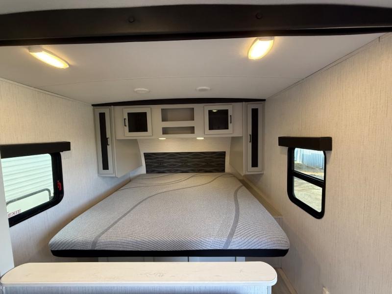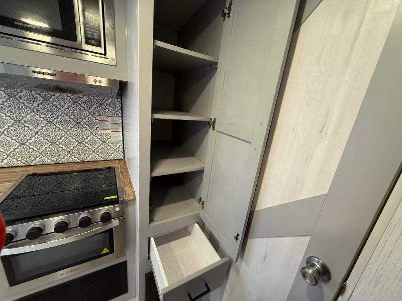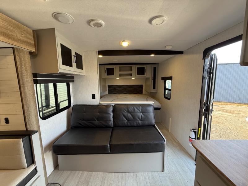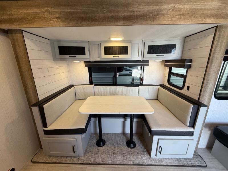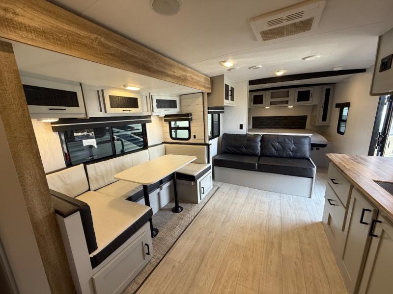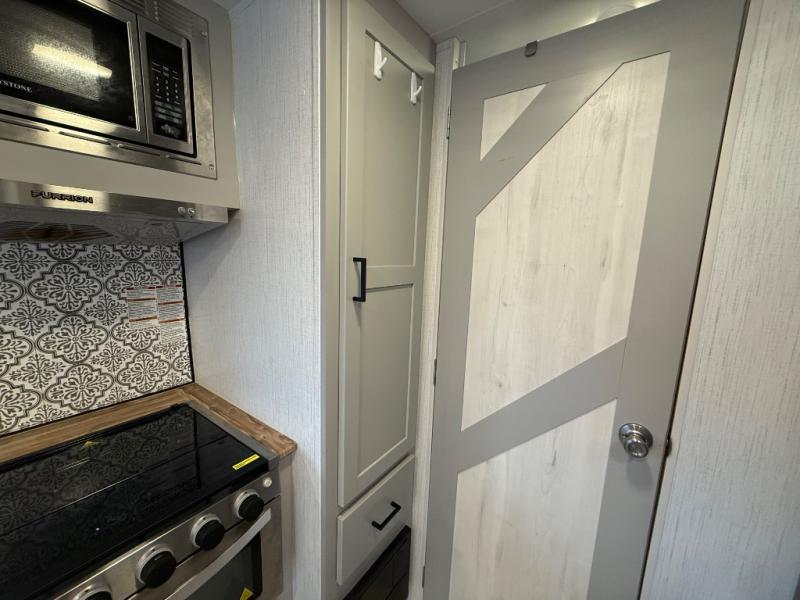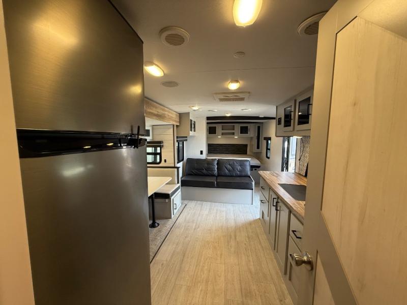 This travel trailer is both spacious and comfortable for all your camping needs. The U-shaped dinette within the slide out will be perfect to dine around each day, plus there is a sofa here as well to relax with a good book. The full rear bath has a convenient pantry to store clean towels and toiletries, and there is also a kitchen pantry for snacks. You will enjoy your own bedroom up front with a Comfort Select gel-infused king bed and a privacy curtain. It will be a snap to prepare breakfast each morning on the three burner range, and the milk can go back in the 8 cu. ft. refrigerator!