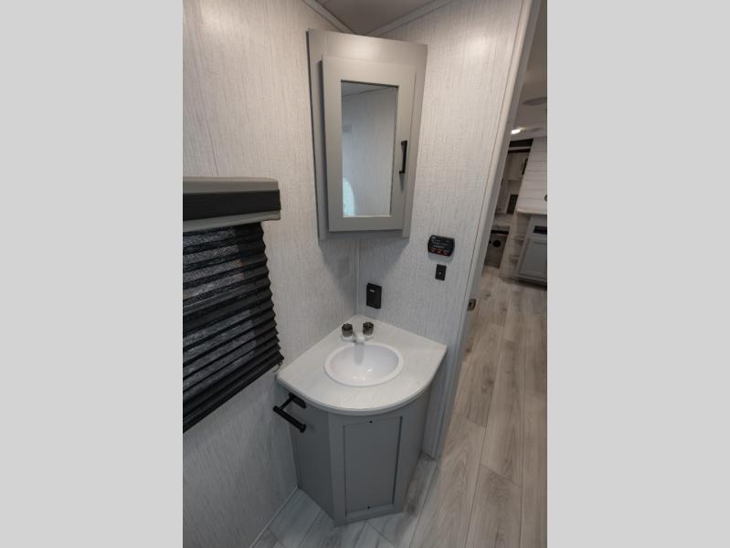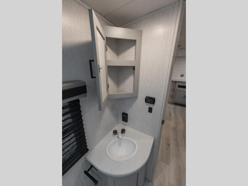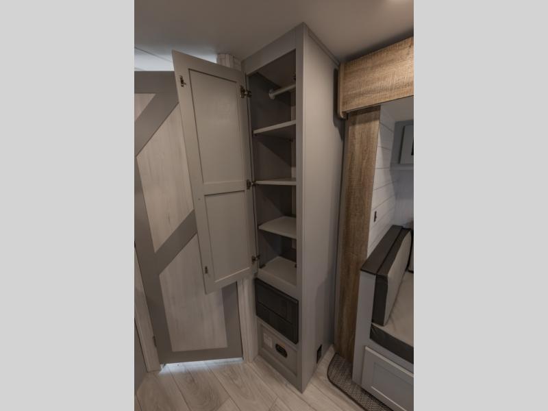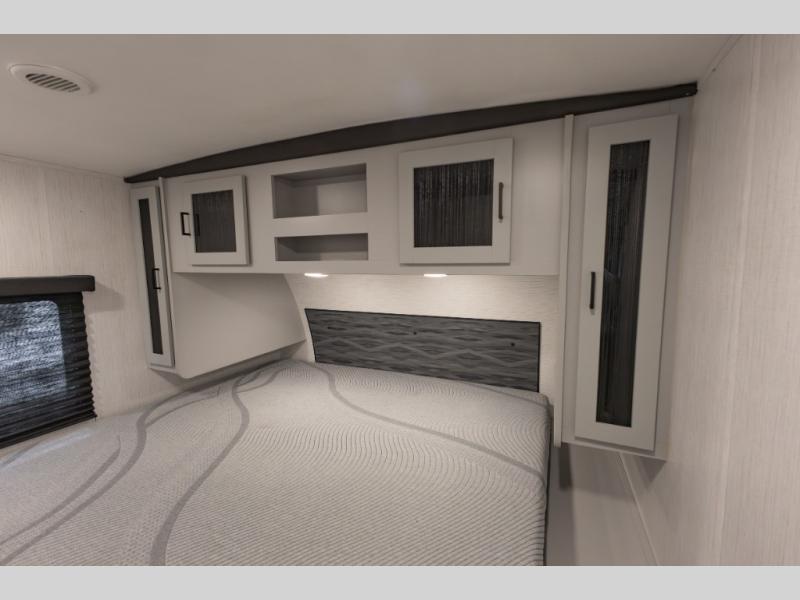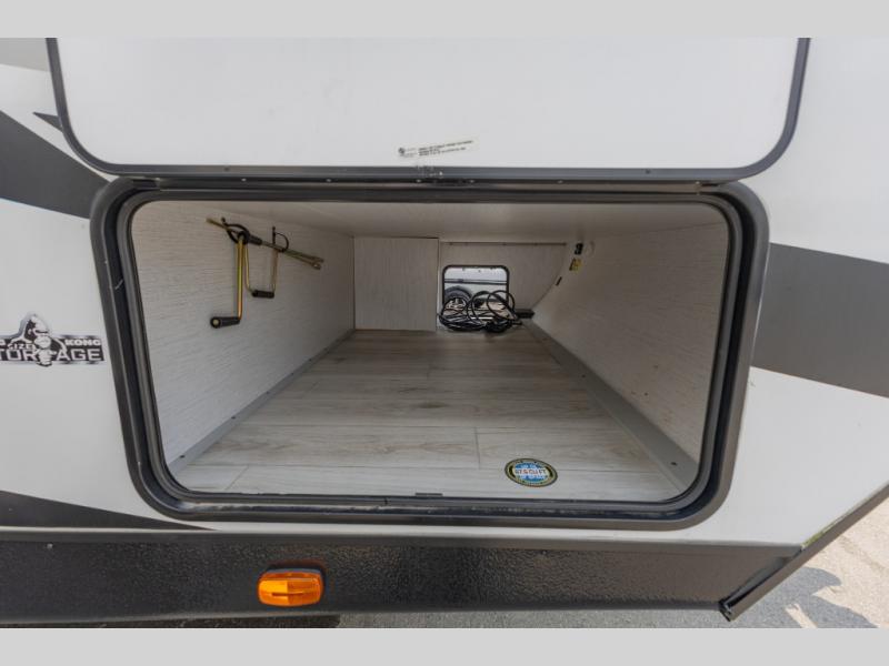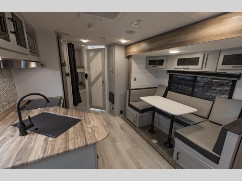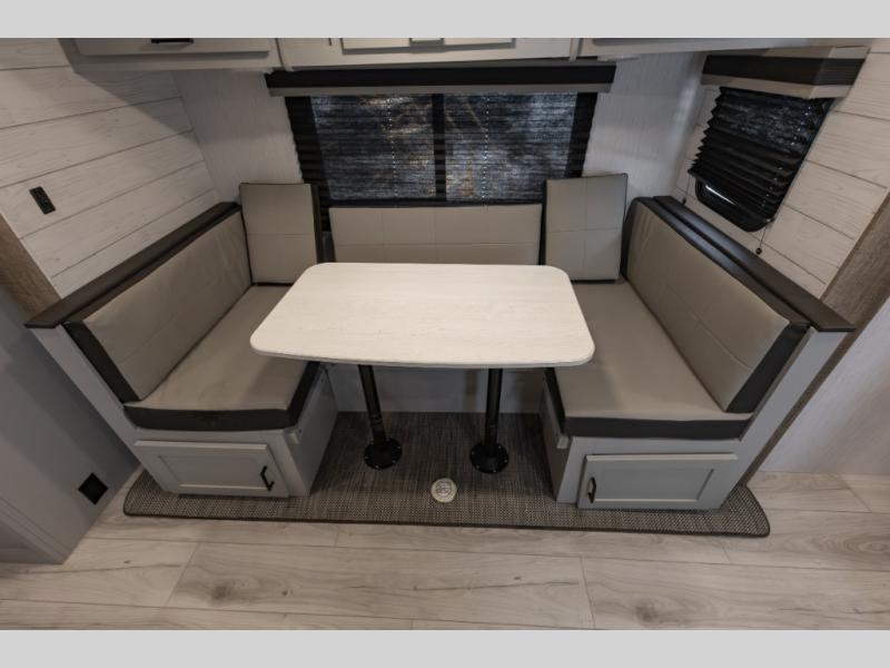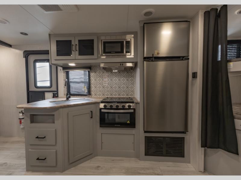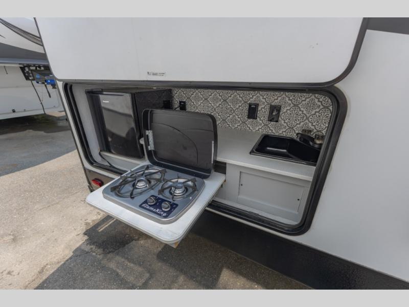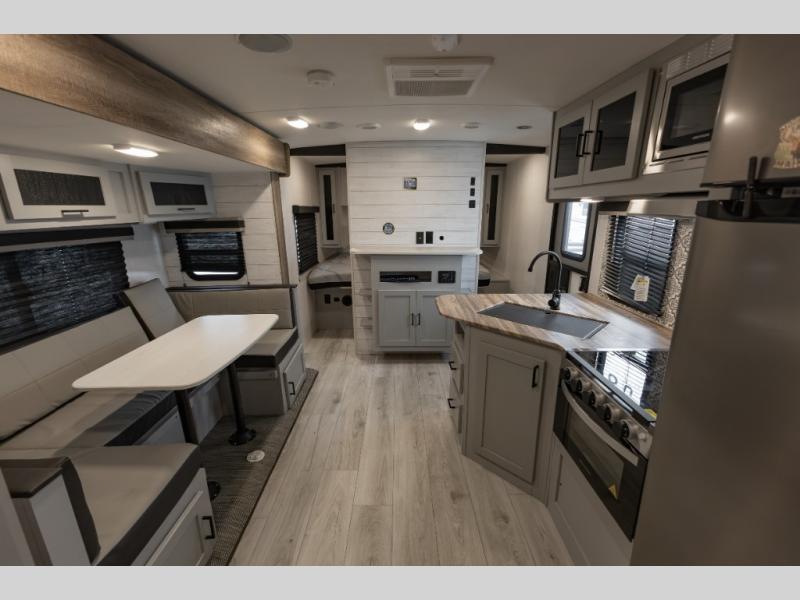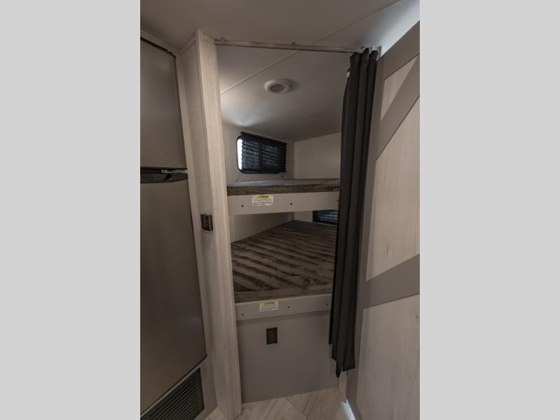Double-size bunks make this travel trailer family and friends approved! The slide out will provide more space to stretch out in the main living area, and the full bath will come in handy when cleaning up each day. This model includes a front private bedroom with a king bed, plus dual nightstands for your belongings. Everyone can gather under the 13' power awning with LED lights while the chef of the group prepares dinner on the exterior kitchen!