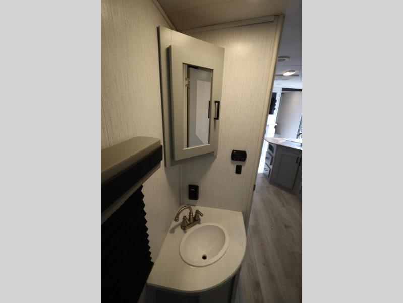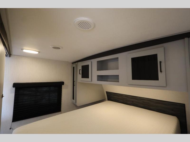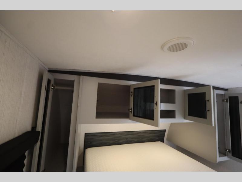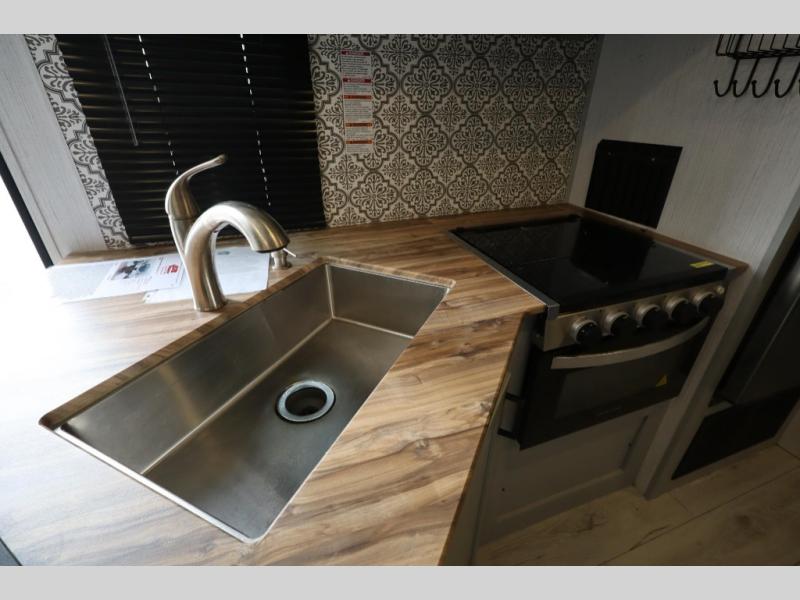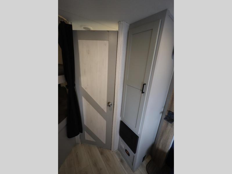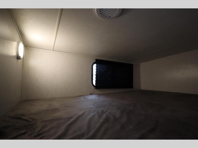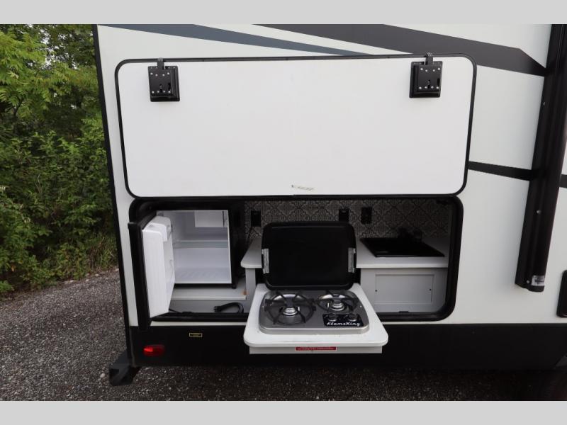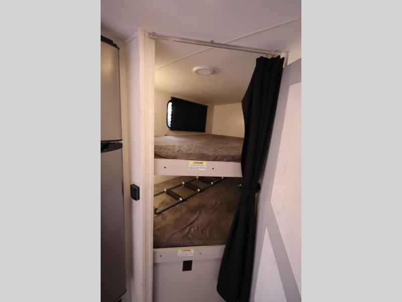 Double-size bunks make this travel trailer family and friends approved! The slide out will provide more space to stretch out in the main living area, and the full bath will come in handy when cleaning up each day. This model includes a front private bedroom with a king bed, plus dual nightstands for your belongings. Everyone can gather under the 13' power awning with LED lights while the chef of the group prepares dinner on the exterior kitchen!