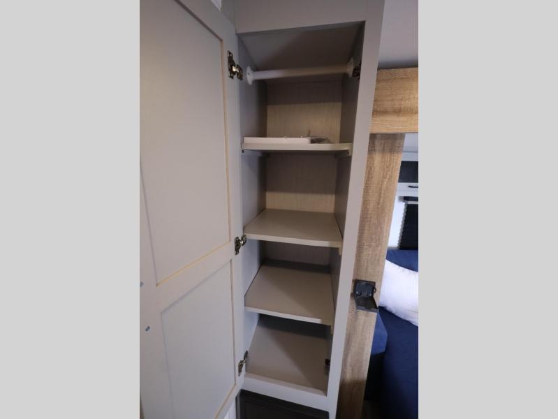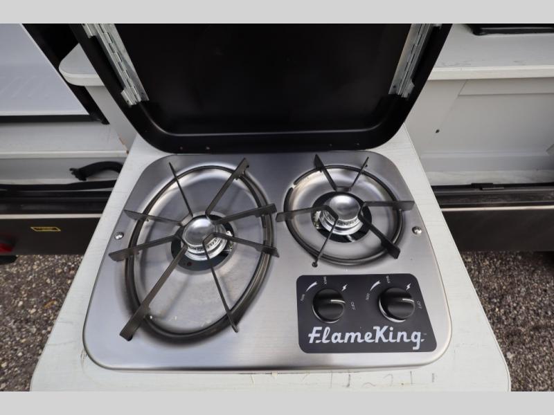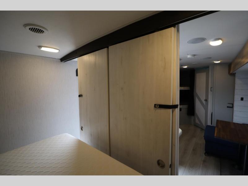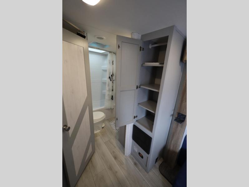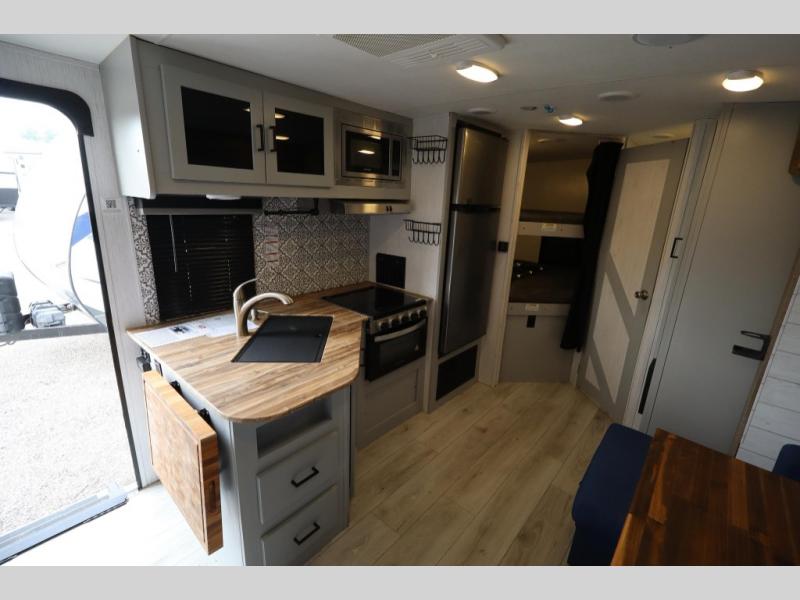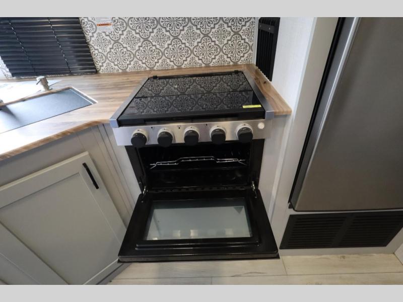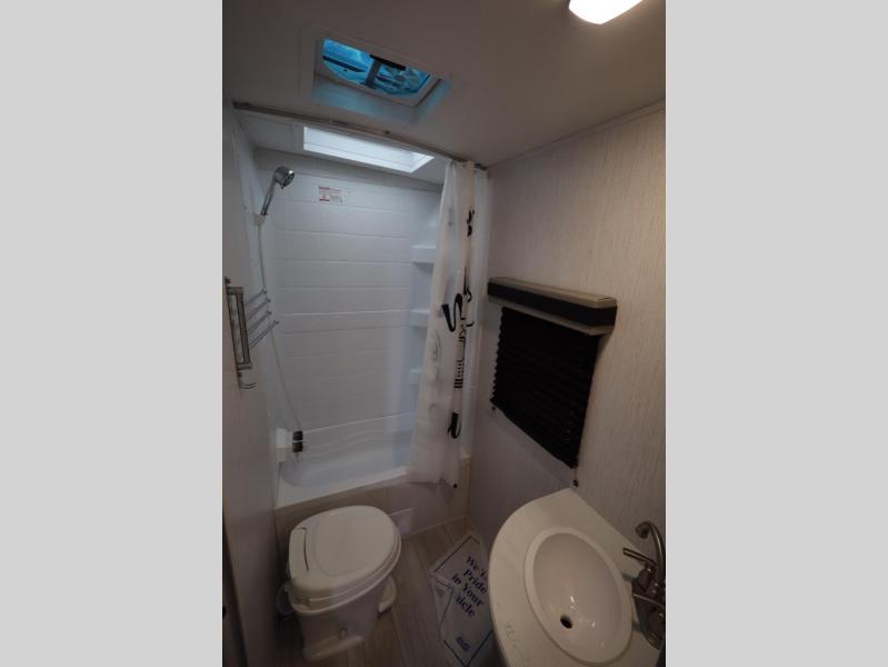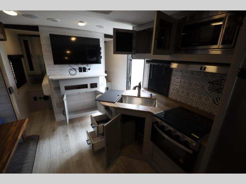 Double-size bunks make this travel trailer family and friends approved! The slide out will provide more space to stretch out in the main living area, and the full bath will come in handy when cleaning up each day. This model includes a front private bedroom with a king bed, plus dual nightstands for your belongings. Everyone can gather under the 13' power awning with LED lights while the chef of the group prepares dinner on the exterior kitchen!