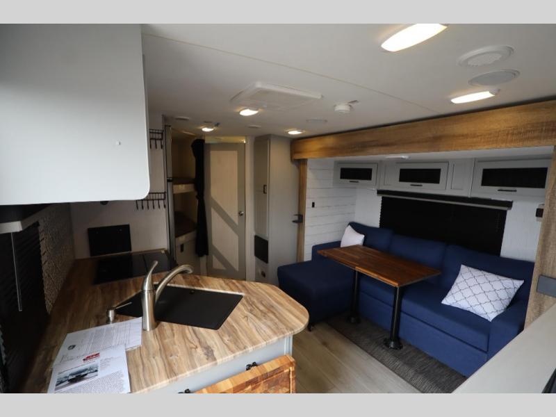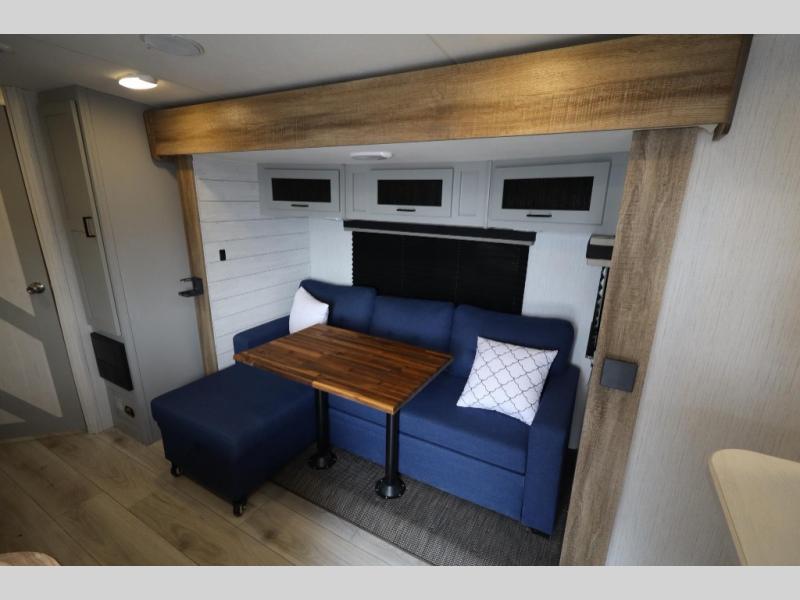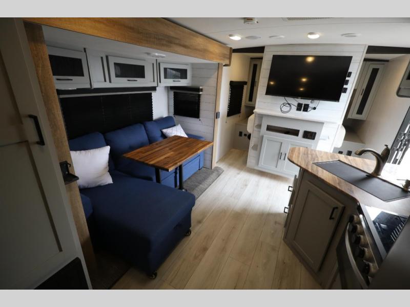 Family friendly bunkhouse with double size bunks, a U shaped dinette slide, and a private front king bed.