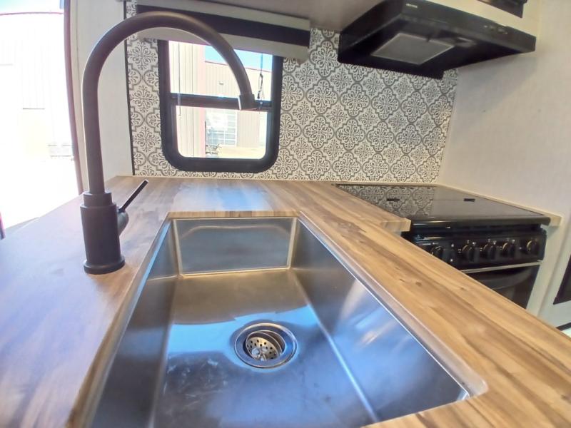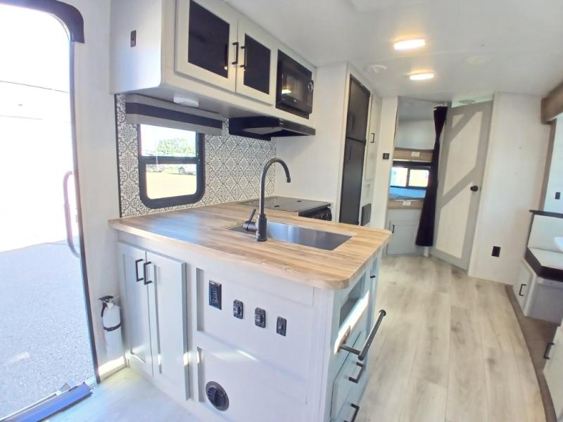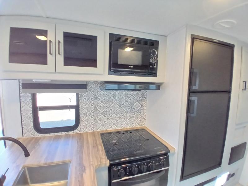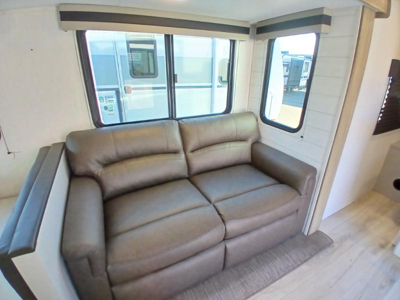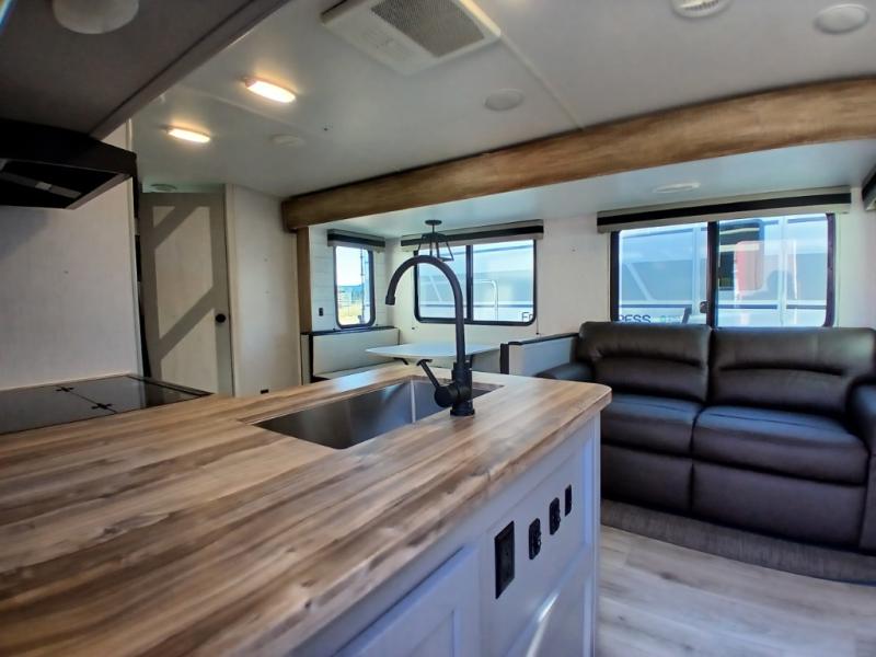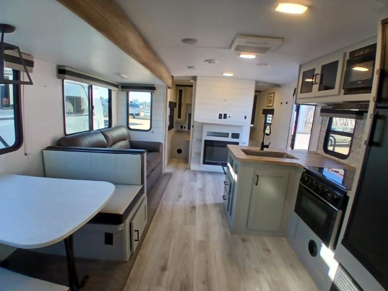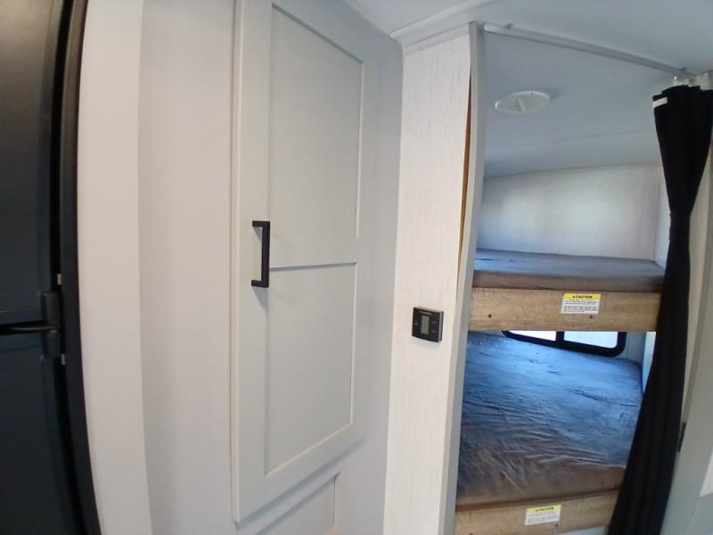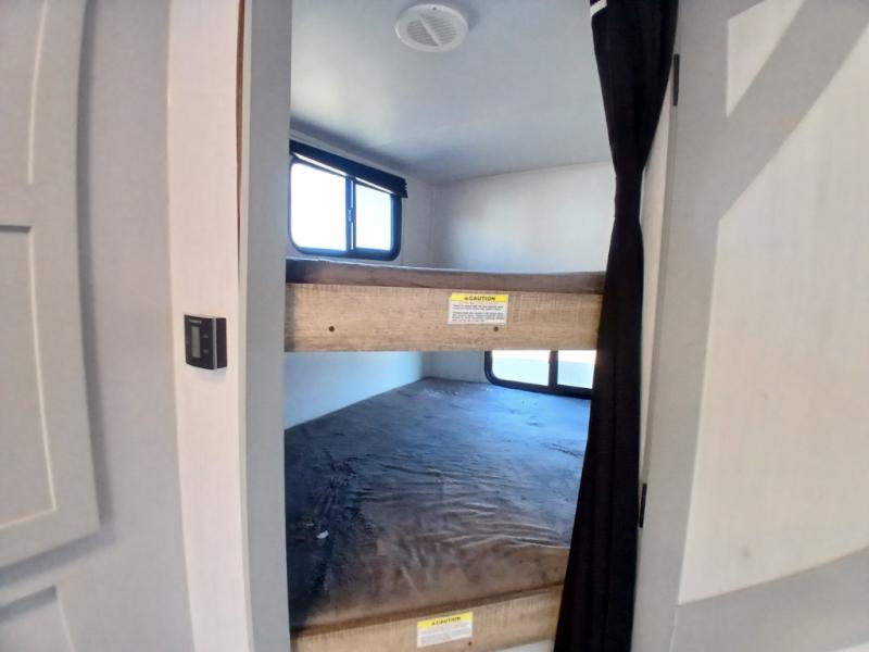 This is the perfect travel trailer for camping adventures with a group since it can sleep eight people each night. The kids or your guests will love the double-size bunks to sleep on, and you will enjoy the bed in the front private bedroom. There is additional sleeping space on the sofa and booth dinette within the slide out. Prepare all your meals on the three burner cooktop indoors, or head outside to cook on the exterior slide cooktop. You will appreciate the power awning with LED lights for some much wanted shade during the day, and an inviting space at night.