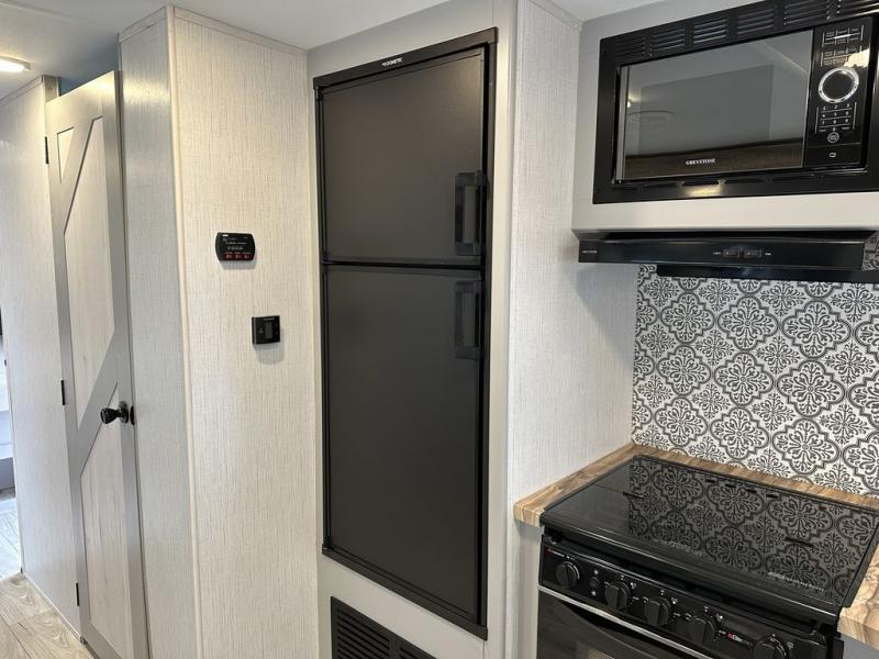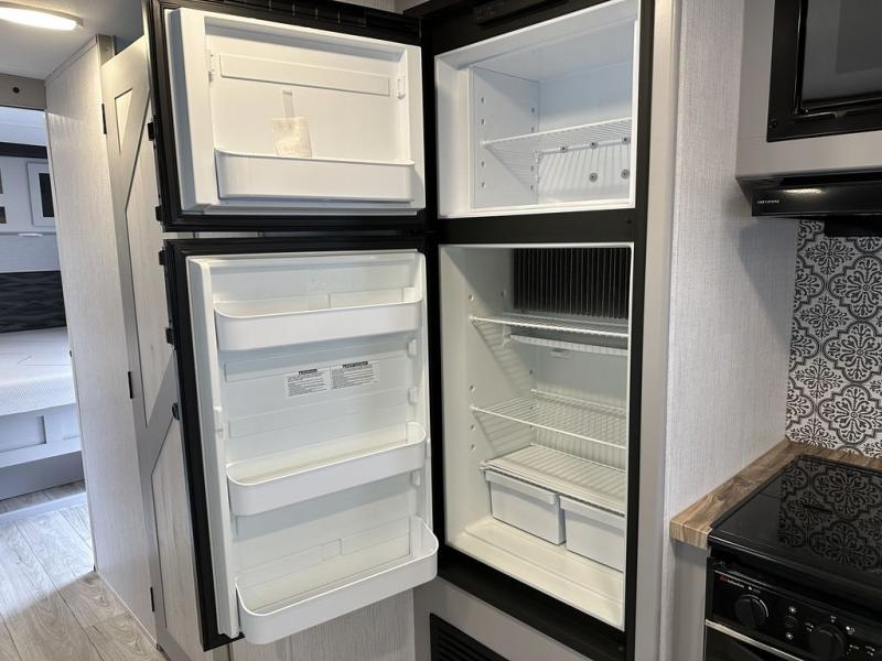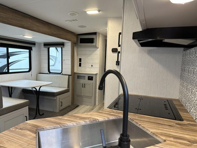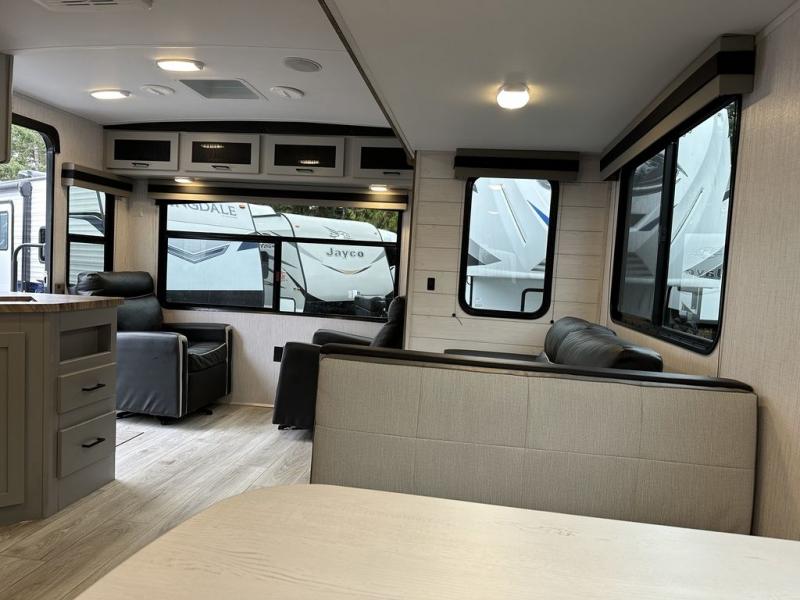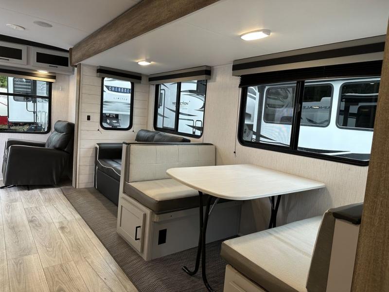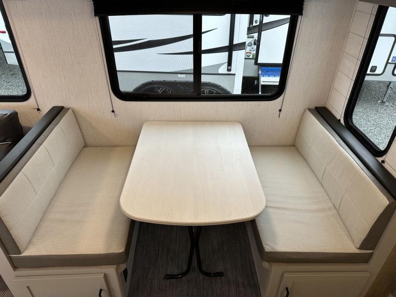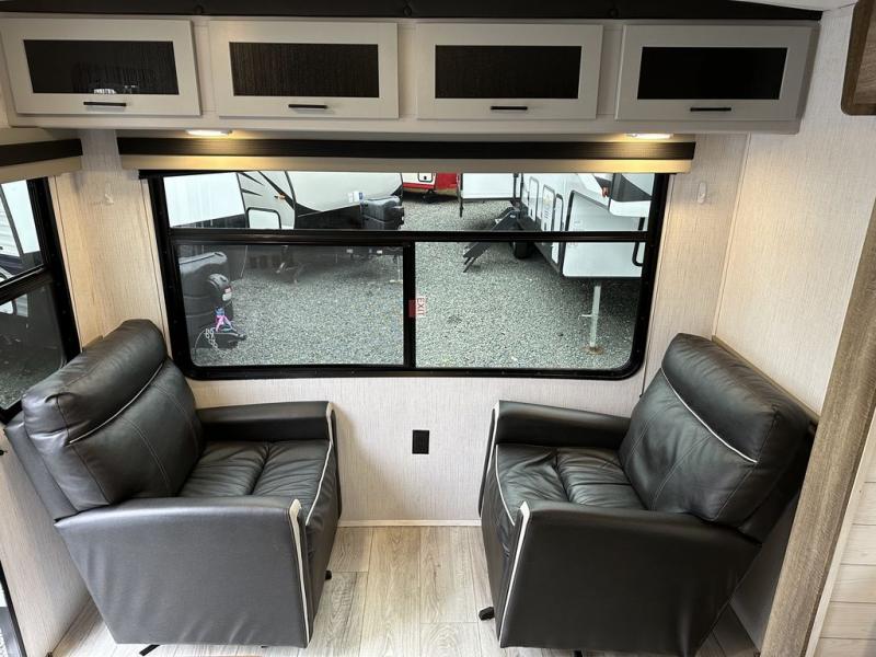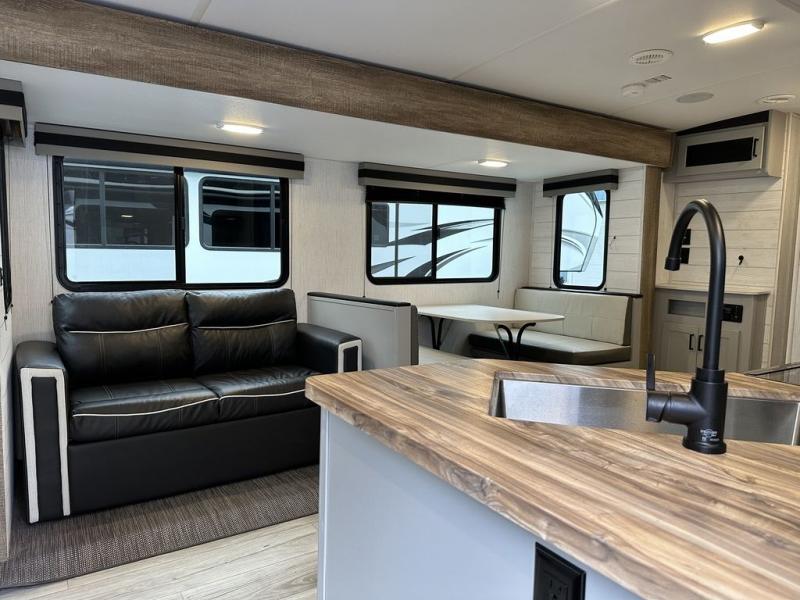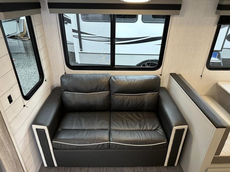 Plan to stay awhile in this comfortable travel trailer that will feel like home! The rear living area includes dual lounge chairs so you can relax after a day outdoors, plus there is a booth dinette and a sofa here for additional seating space. Your guests can make their beds here at night, and you can take the king bed in the front private bedroom. This model features convenient dual entry doors for a smooth flow of traffic, and there is plenty of storage space for all your belongings.