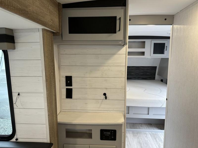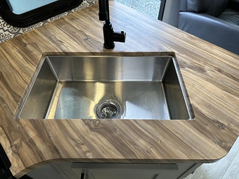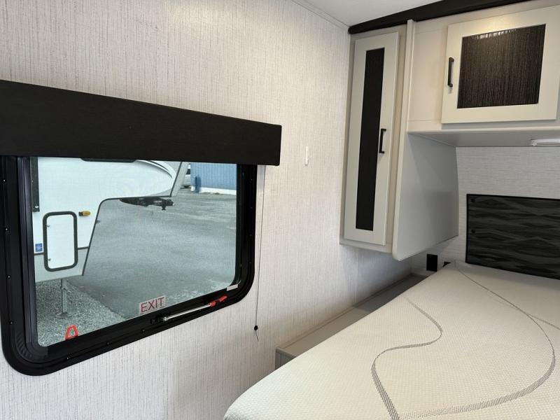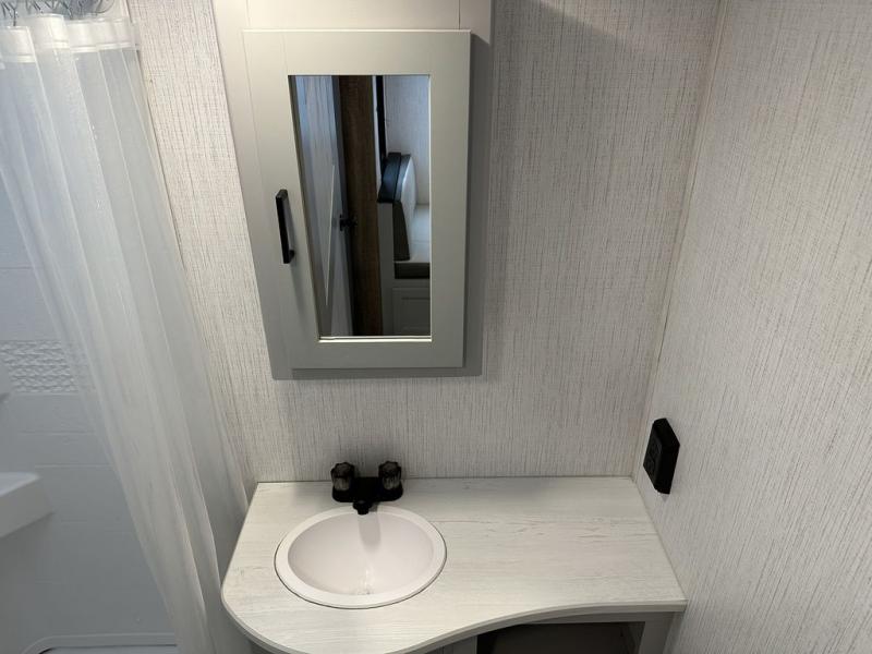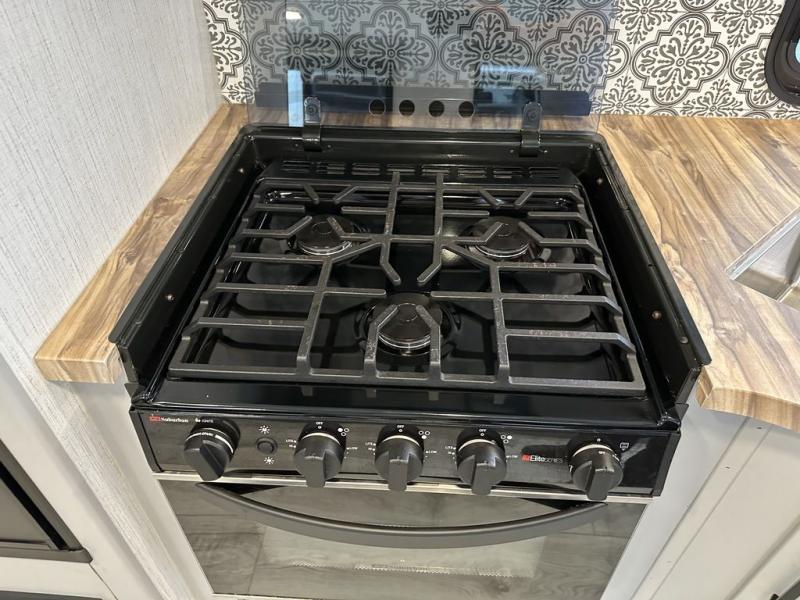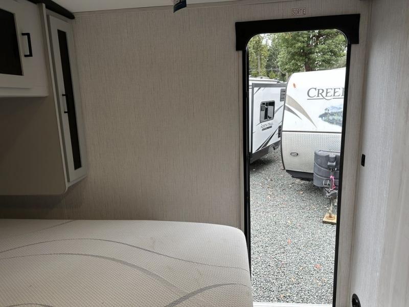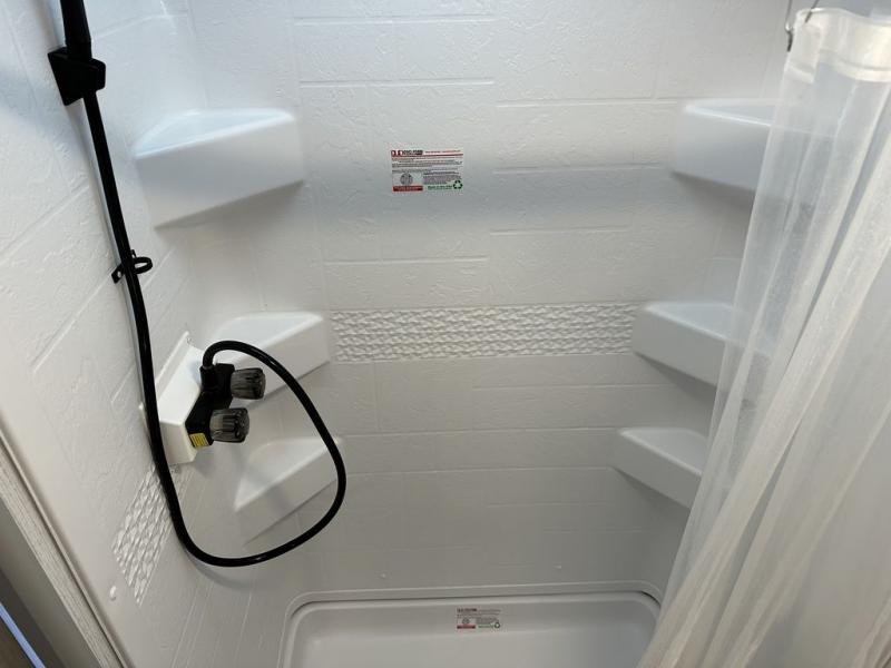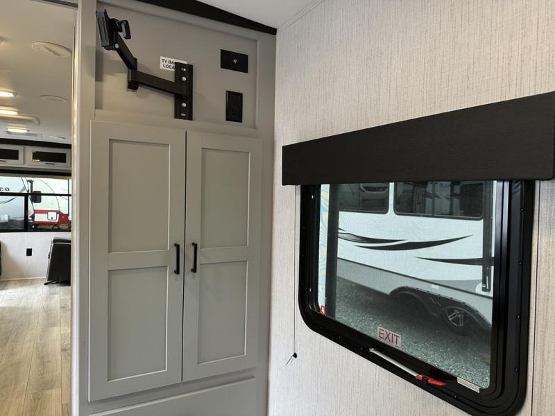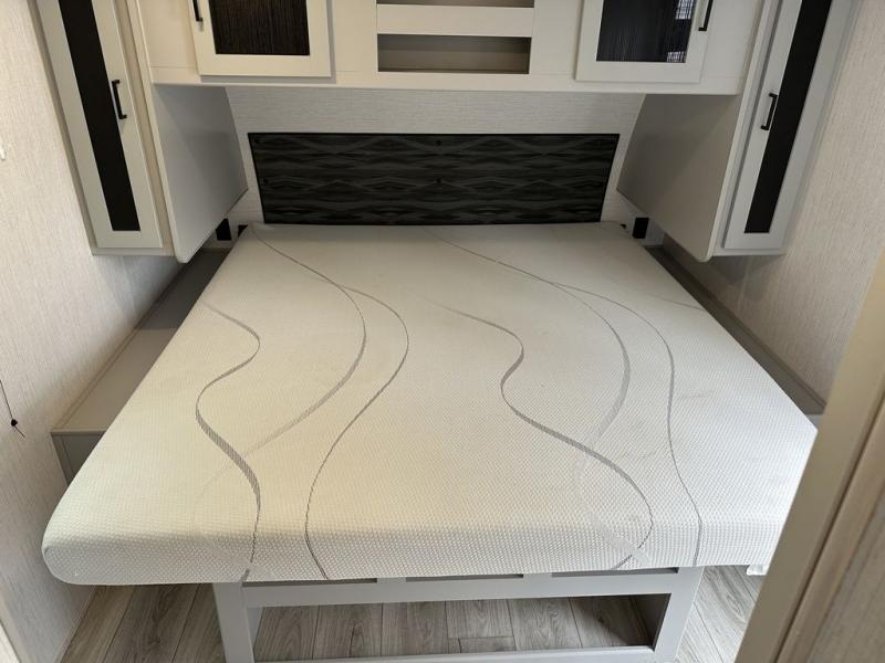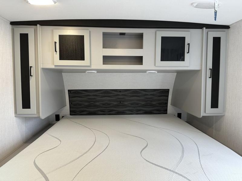 Plan to stay awhile in this comfortable travel trailer that will feel like home! The rear living area includes dual lounge chairs so you can relax after a day outdoors, plus there is a booth dinette and a sofa here for additional seating space. Your guests can make their beds here at night, and you can take the king bed in the front private bedroom. This model features convenient dual entry doors for a smooth flow of traffic, and there is plenty of storage space for all your belongings.