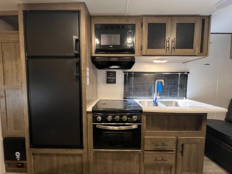 This Pioneer allows the kids their own space on the double-size bunks while you have your own space in the front private bedroom with a queen bed and storage. There is seating in the main living and kitchen area on the sofa and booth dinette, plus both of these furnishings provide sleeping space when needed. The cook will have a three-burner cooktop and a microwave to make warm meals, and an 8 cu. ft. refrigerator to store lots of cold food and drinks. You will find overhead cabinets and more storage throughout for your games, snacks, and such, plus there is a full bathroom to keep everyone clean.