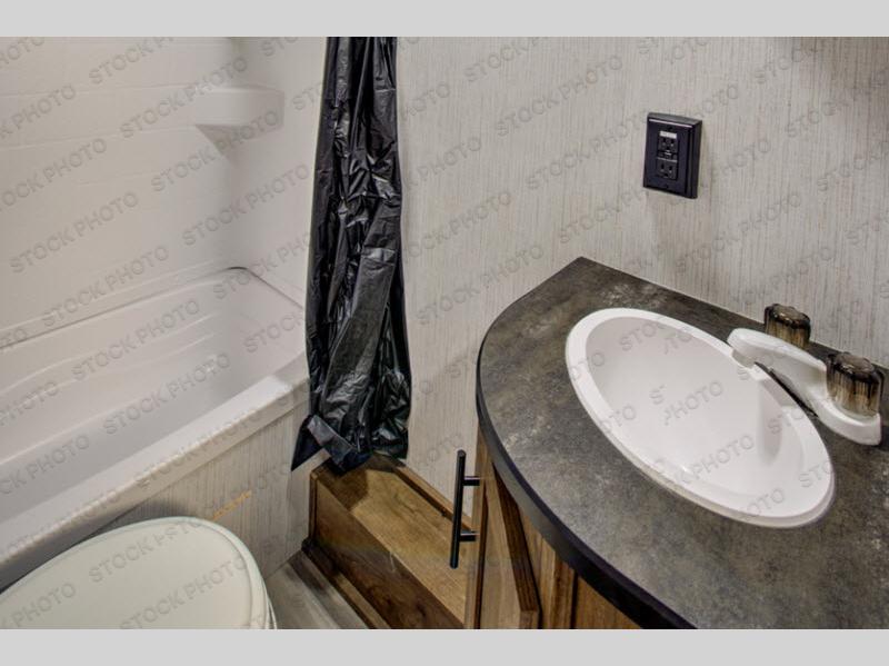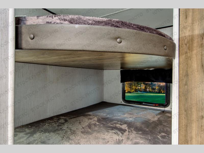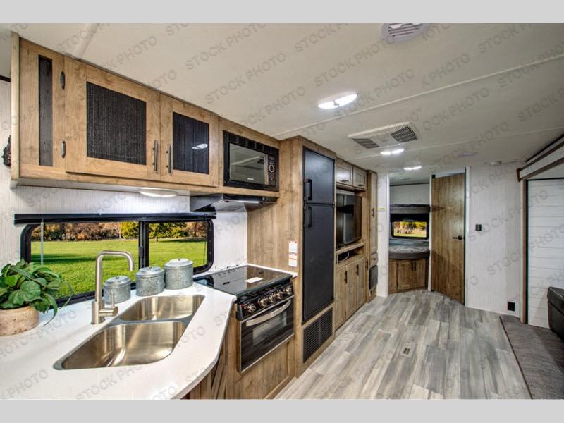 You camp because you love the outdoors and hanging out with your larger crew yet you don't have to give up indoor comforts like relaxing on a sofa and dining at a U-shaped dinette when you have this trailer at the campsite. The large slide provides the main living and kitchen area with more floor space for everyone to move about, and the cook will appreciate having more space when using the galley kitchen amenities. There is an outside kitchen that you can enjoy when wanting to be outside where the action is or when everyone is relaxing under the 20' power awning. Back inside there is a large TV to watch, and storage for pretty much everything, and the private front bedroom can be your oasis at night while others fall asleep on the bunks or furniture.