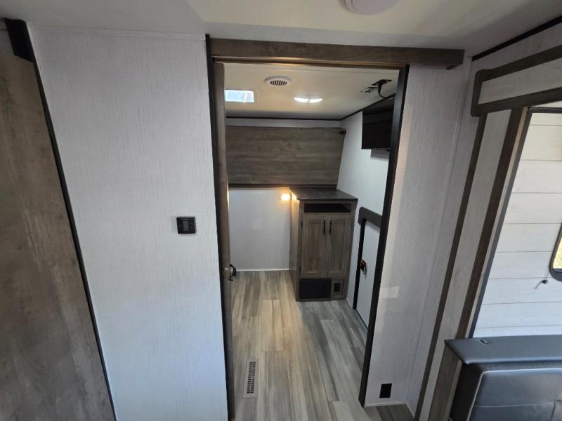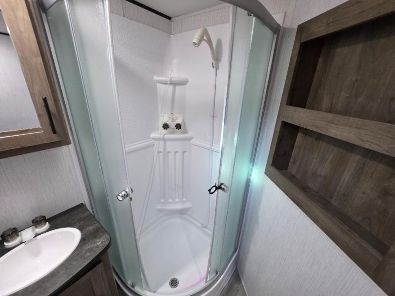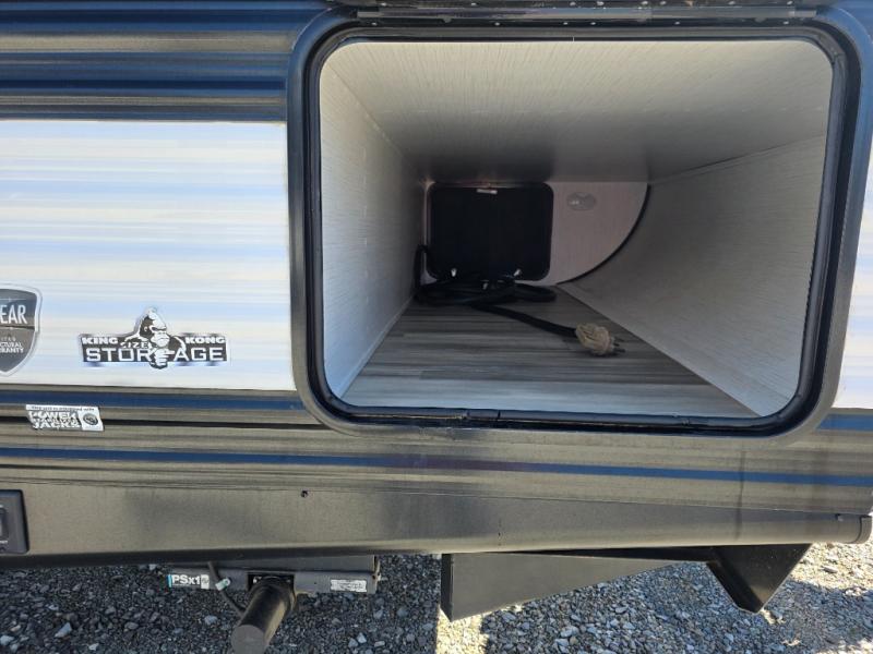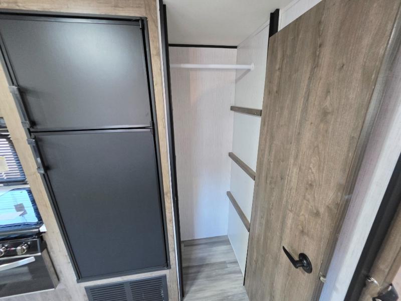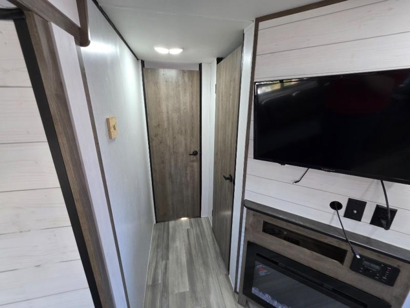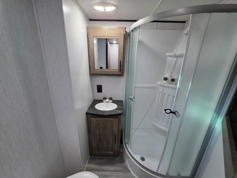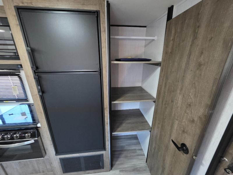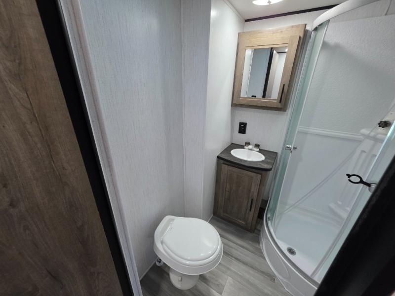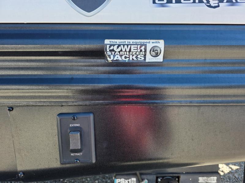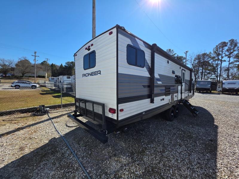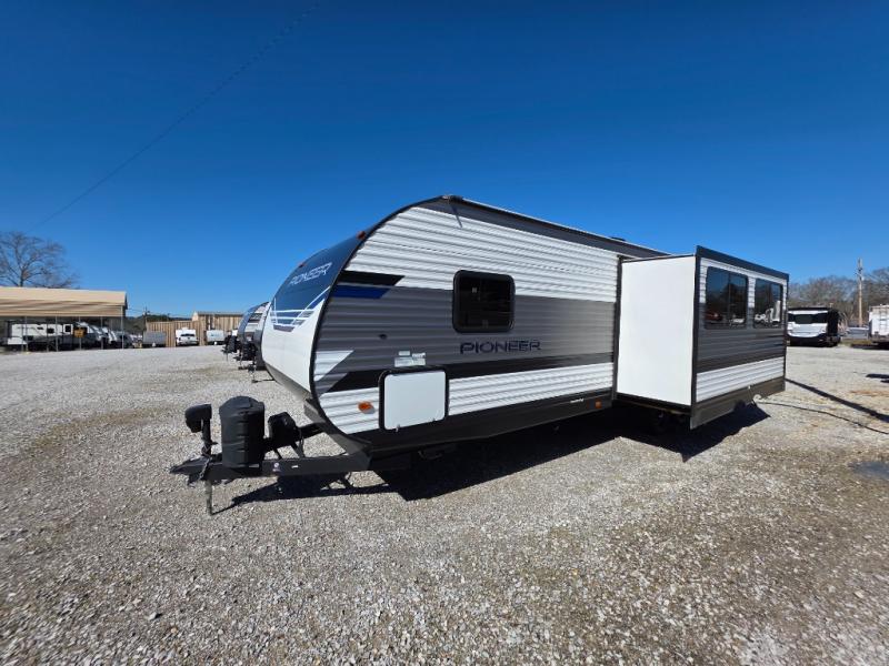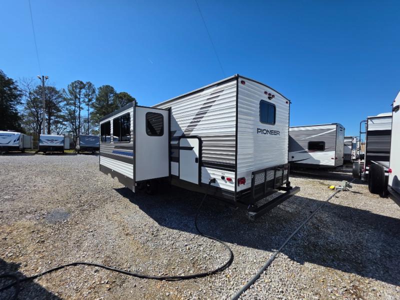 Your search is over! This Pioneer has paved the way for the ultimate setup for a larger family or group of friends with its rear private bunkhouse with a space saving sliding door, a sofa base that converts into a 60" x 70" bed below two upper flip down bunks. There is also a handy exterior storage door that allows you to stow items inside for your travels. You will have your own privacy in the front bedroom and your own queen bed and clothing storage. There is a full bathroom to keep everyone clean, and the full kitchen amenities will allow everyone to stay fed. There is an L-shaped counter, a double door refrigerator and a pantry. The large slide includes a U-shaped dinette and sofa for more floor space and easy viewing of the fireplace. And don't forget about the 20' power awning for protection from the elements, and the outside kitchen with griddle.