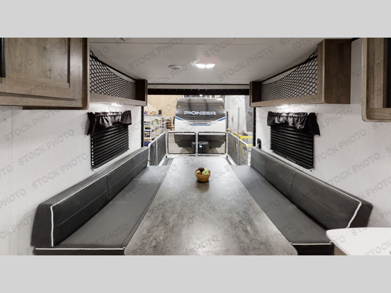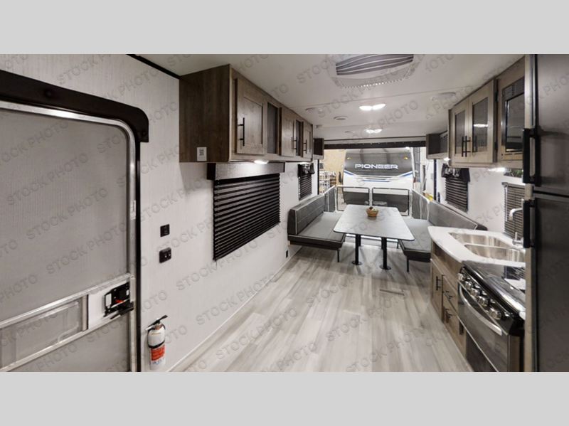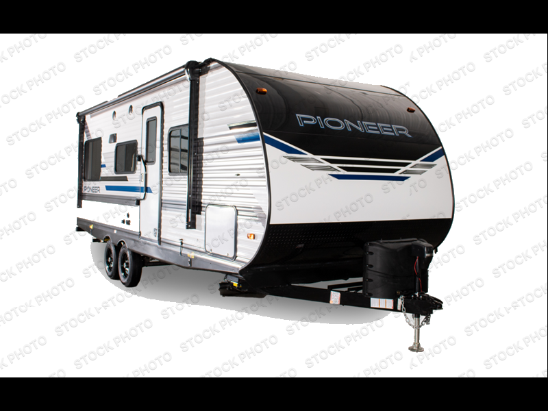 With any Pioneer dual axle travel trailer or toy hauler by Heartland, there is a hybrid aluminum front profile with aerodynamic radius front cage structure for better wind and water deflection, adding strength and reducing tongue weight. The Pioneer Power Pack provides power stabilizer jacks, a power tongue jack and a power awning, plus the EZ Camp package gives you a black tank flush, an outside shower with hot and cold water, LP quick connect, an outside TV hookup and a flip-down secure step with an XL handle. The interior offers solid surface countertops and a large stainless steel sink with high rise faucet in the kitchen, full linoleum on the main floor and no carpet in slide outs, cable TV hookup with RG6 coax cabling, and crossflow windows allowing the fresh air to circulate through the extra large windows. Make your selection today!