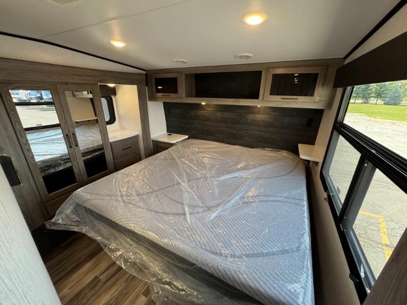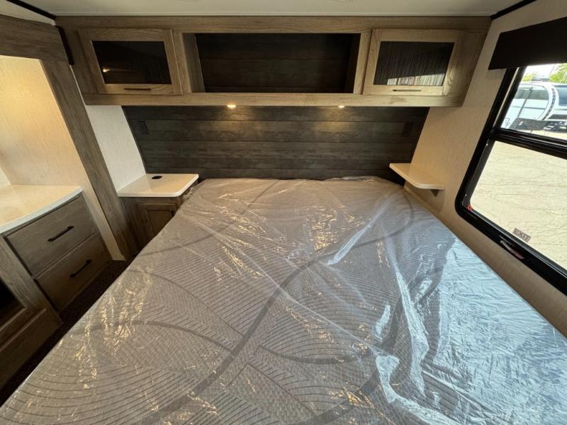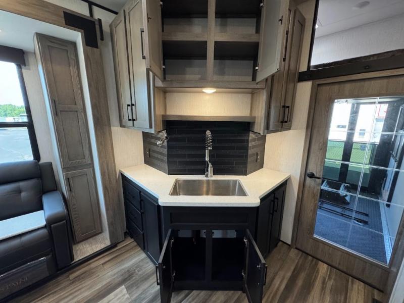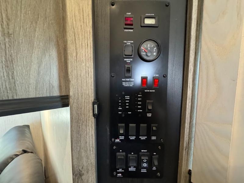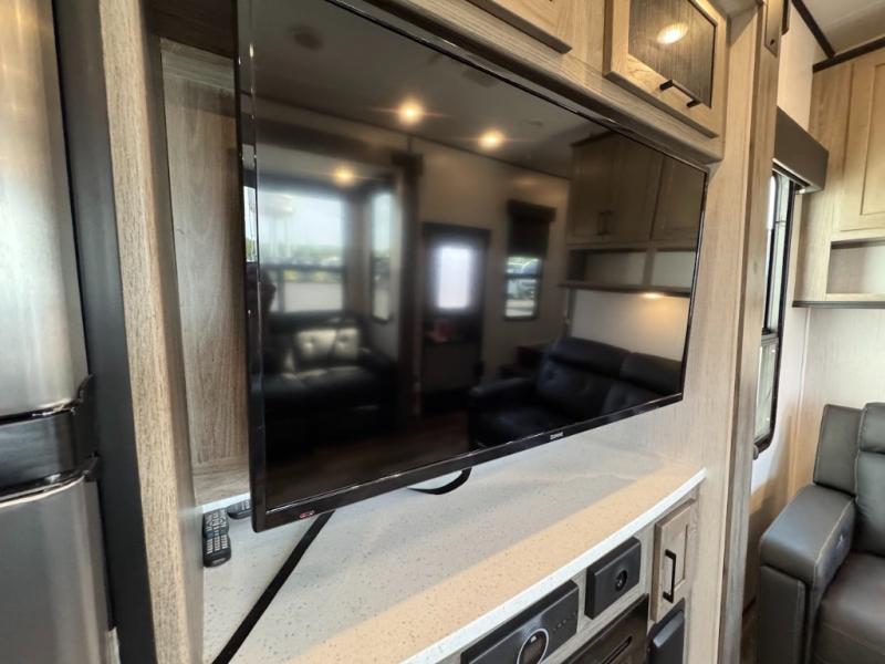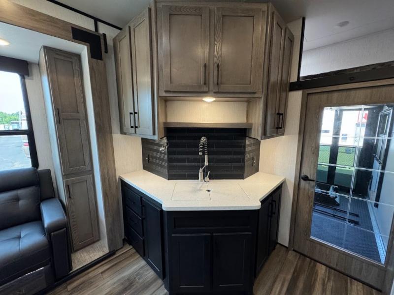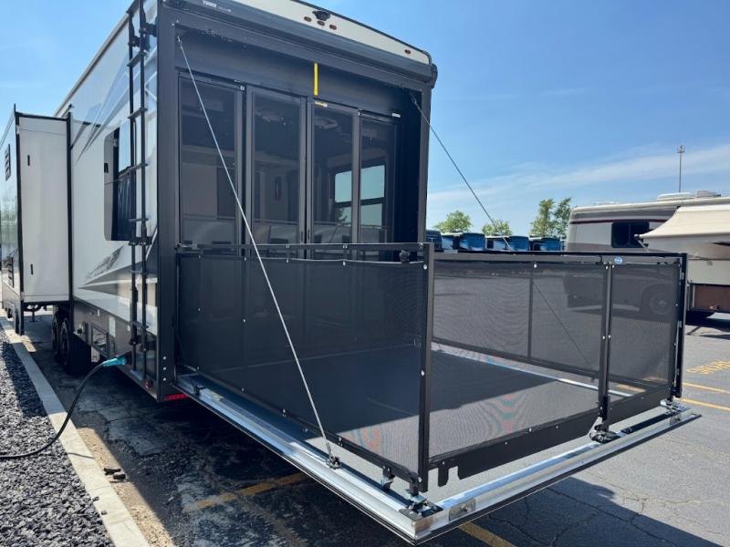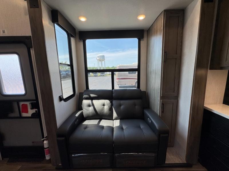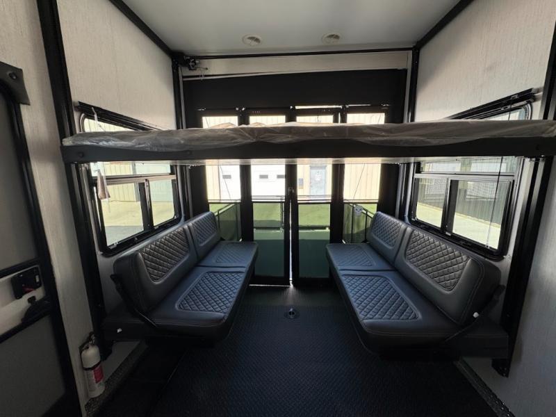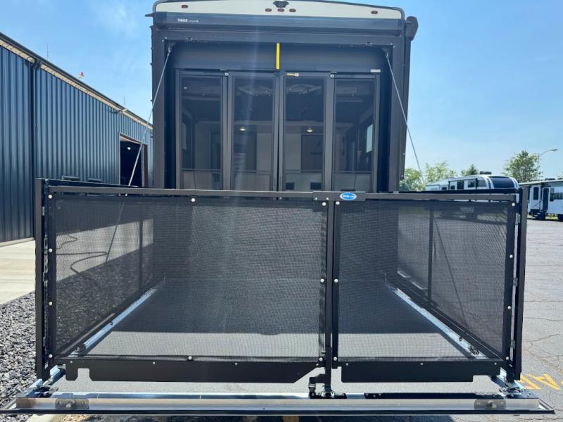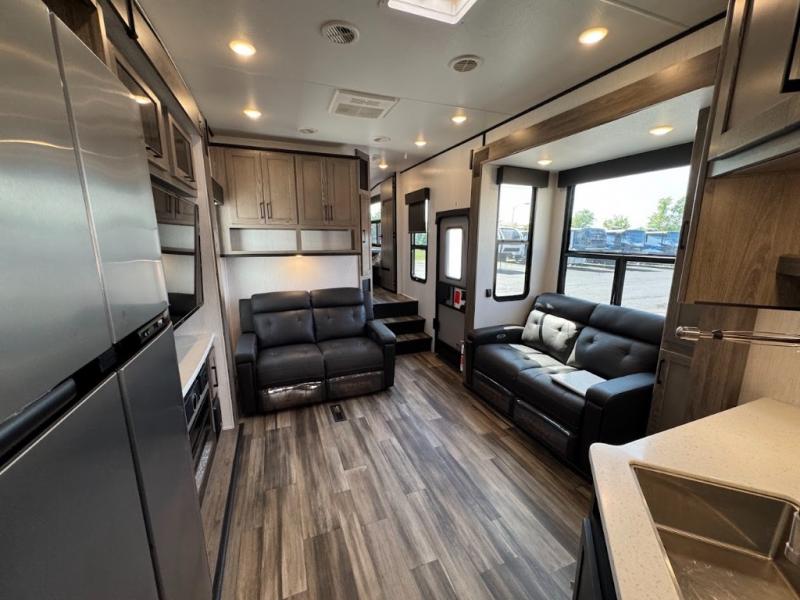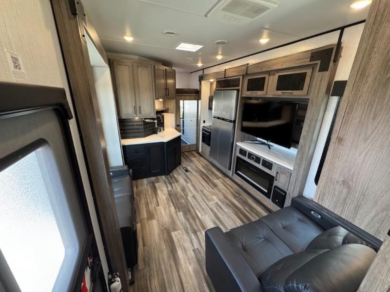 Calling all adventurous types, this toy hauler is ready for fun and the fifth wheel is ready with luxury accommodations! The front bedroom offers a walk-around king bed, a slide out with storage, and easy access to the double entry full bath. Your guests can sleep on two sofas in the main living and kitchen area that is spacious with two slide outs, and the cook will love having full amenities to feed everyone, and extra counter space to serve meals. The loft area is another favorite sleeping spot for one. The garage has 11' of space for your off-road toys and gear, plus you might like to add the electric queen bed-split bench seat/bed option for more dining and sleeping space for family and friends. And the half bath and side man door will surely come in handy. You will also find a 30 gallon fuel station with a second 30 gallon aux tank that allows you to stay in one place a little longer.
