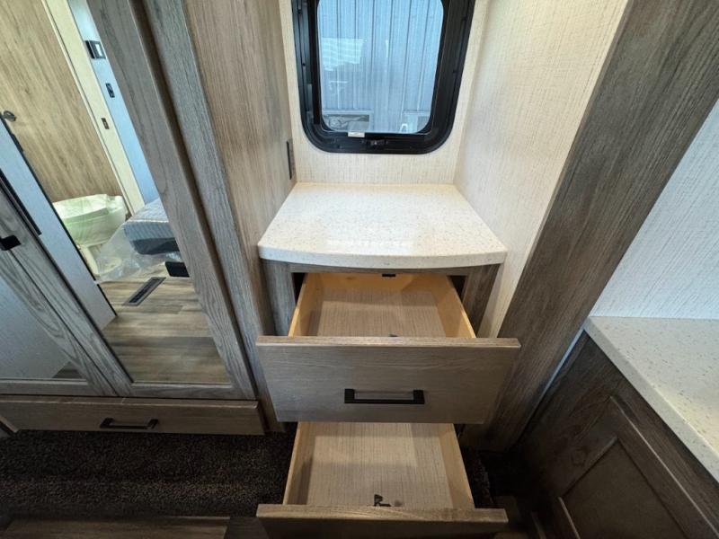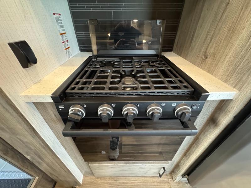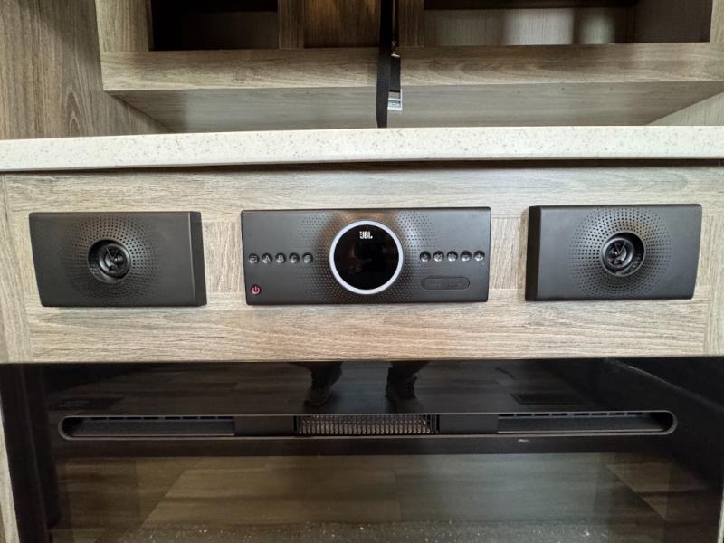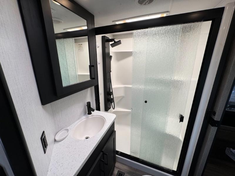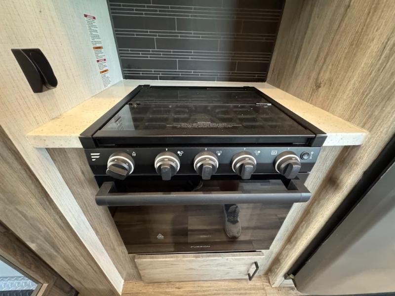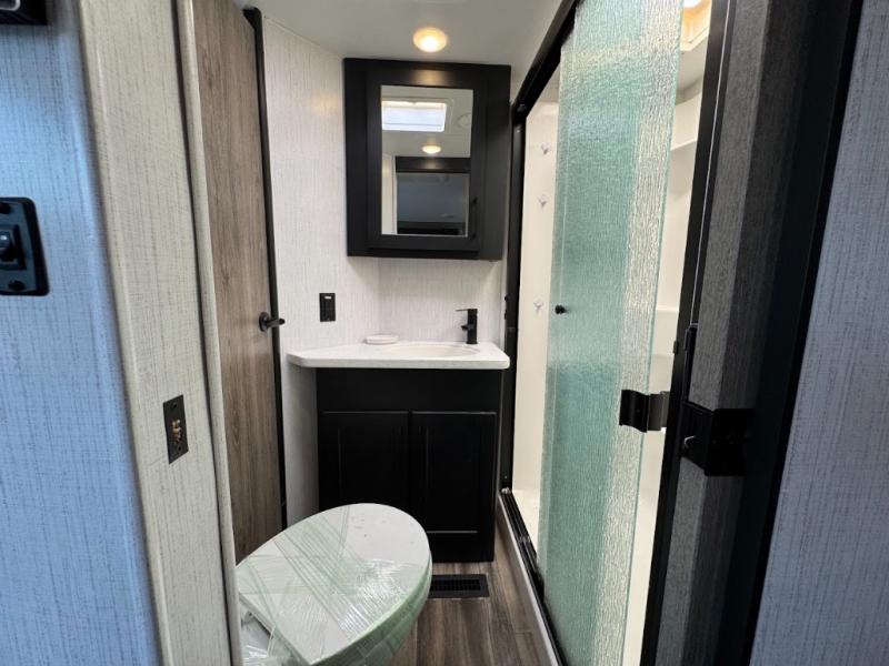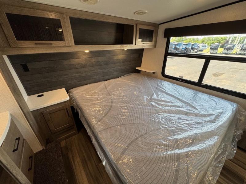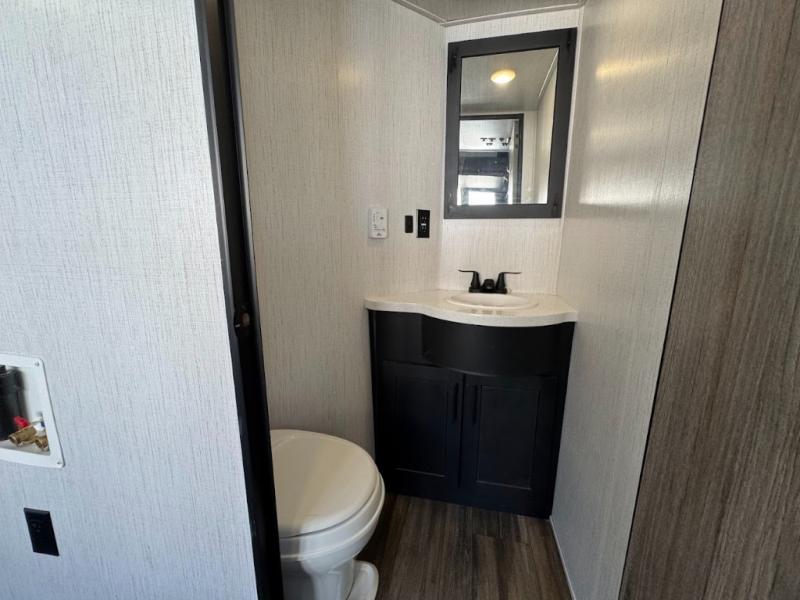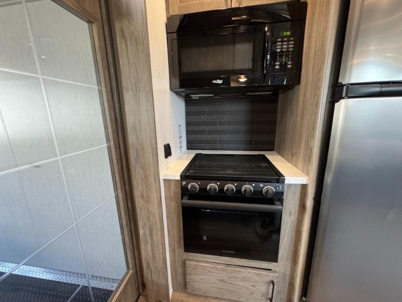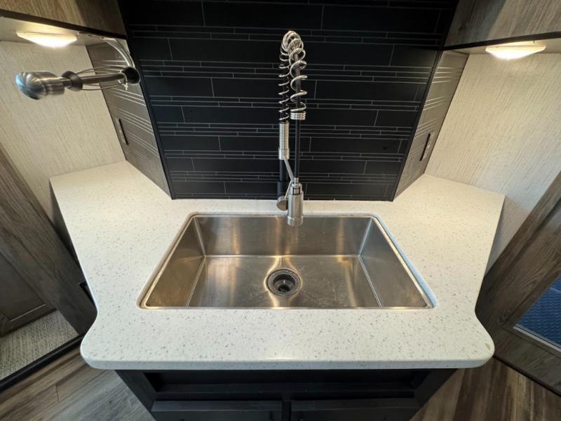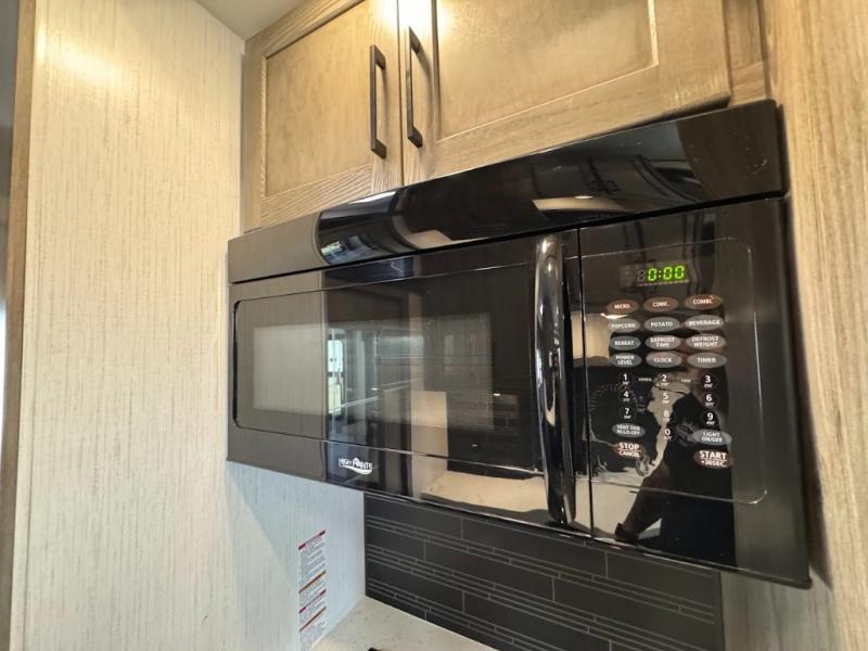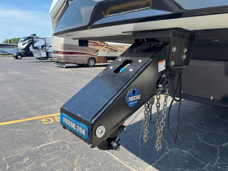 Calling all adventurous types, this toy hauler is ready for fun and the fifth wheel is ready with luxury accommodations! The front bedroom offers a walk-around king bed, a slide out with storage, and easy access to the double entry full bath. Your guests can sleep on two sofas in the main living and kitchen area that is spacious with two slide outs, and the cook will love having full amenities to feed everyone, and extra counter space to serve meals. The loft area is another favorite sleeping spot for one. The garage has 11' of space for your off-road toys and gear, plus you might like to add the electric queen bed-split bench seat/bed option for more dining and sleeping space for family and friends. And the half bath and side man door will surely come in handy. You will also find a 30 gallon fuel station with a second 30 gallon aux tank that allows you to stay in one place a little longer.