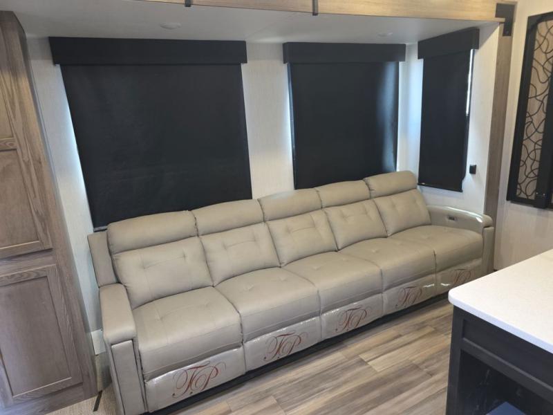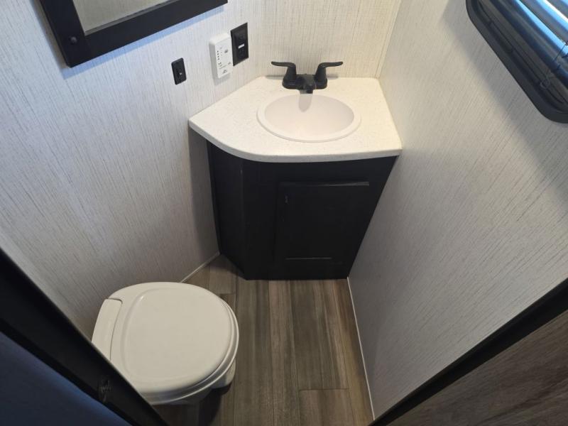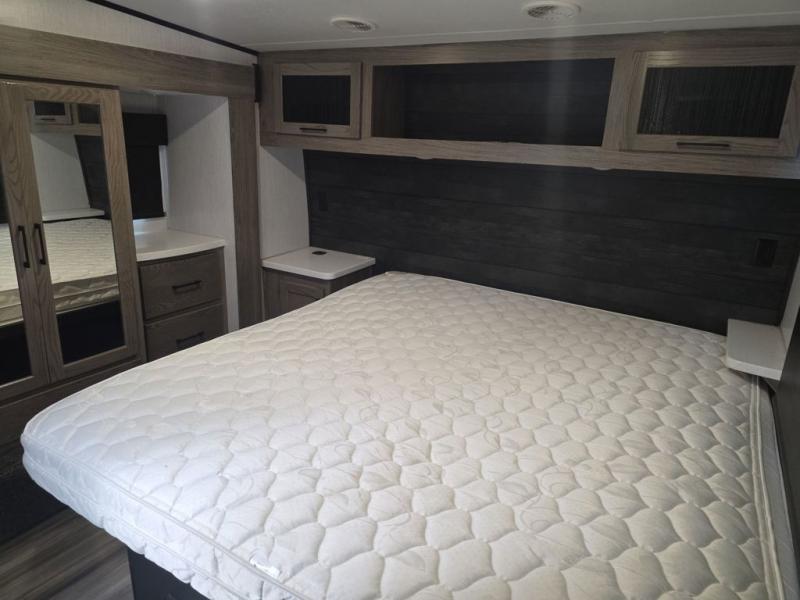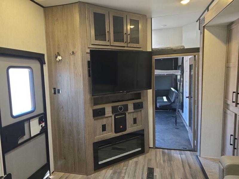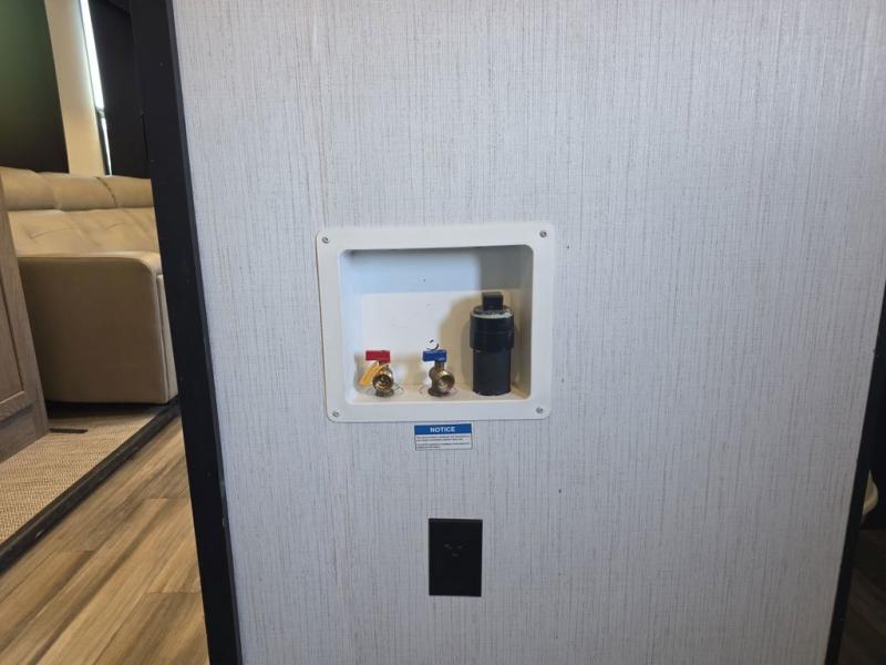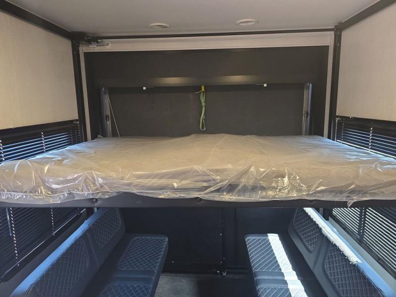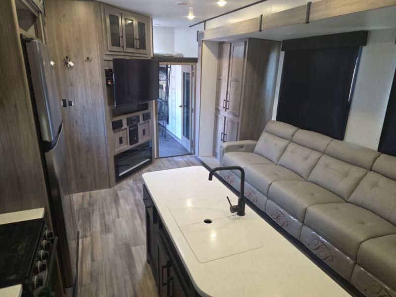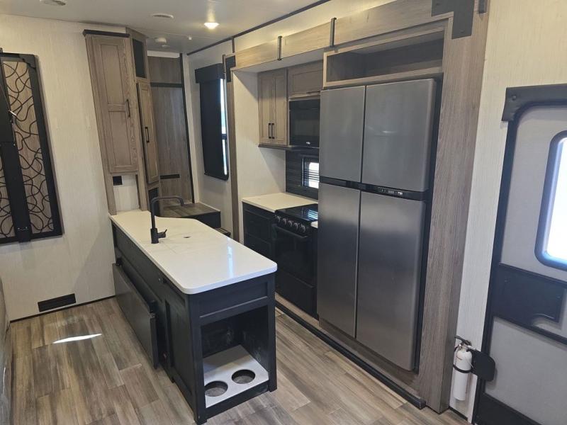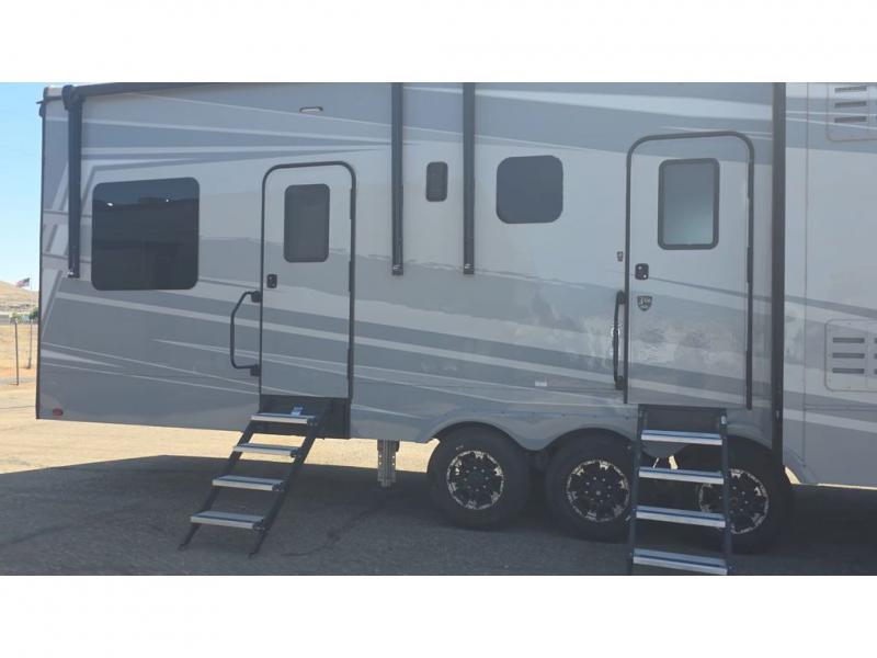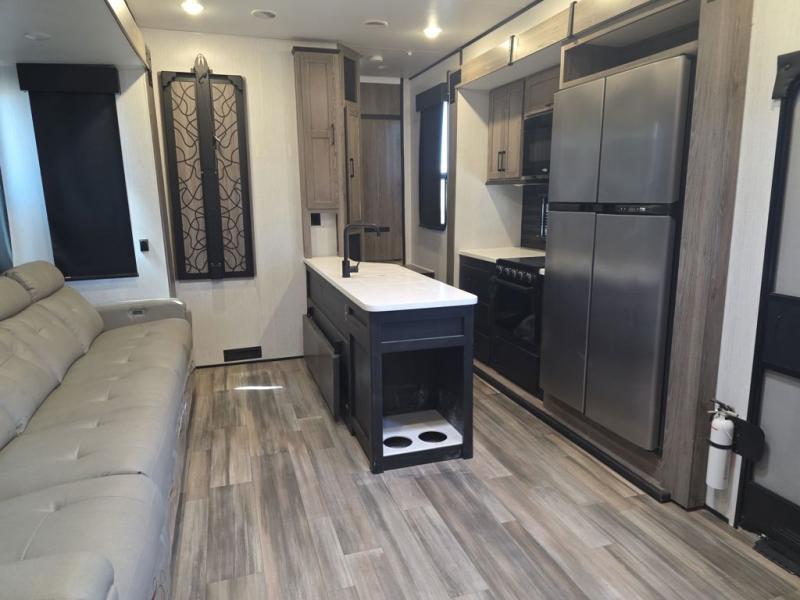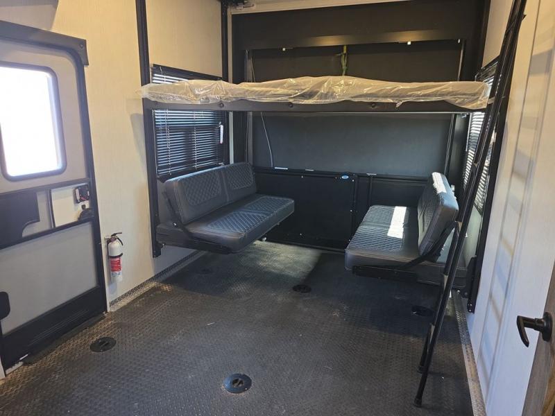 It's time to seek adventure and stay in luxury in this fifth wheel that allows you to bring along your toys be it mountain bikes, motorcycles and/or an ATV! After easily loading up the ramp door into 13'8" of garage space, you can head out. You will appreciate having dual entry for easy access to your toys and the main living and kitchen area, plus having a half bath in the garage is super convenient. You might even like to add the electric queen bed-split bench seat/bed option for more dining and sleeping space. Relax inside the main area on the large sofa and dine at the drop down dinette with flip-up bench. The cook will have full kitchen amenities to make meals, plus a peninsula counter with as sink to prepare and serve meals. The full bathroom has double access, and the front bedroom offers a king bed, plus a slide out with a wardrobe and dresser for more floor space and storage. And the 30 gallon fuel station with a second 30 gallon aux tank will keep the fun going!