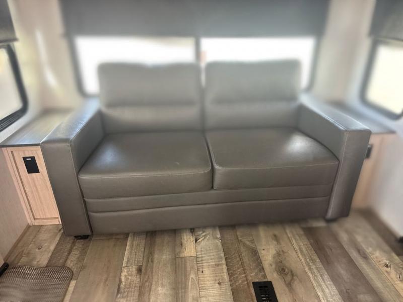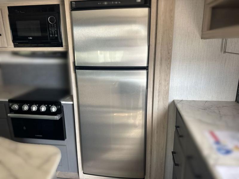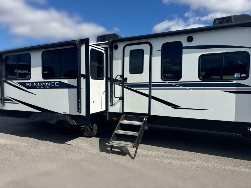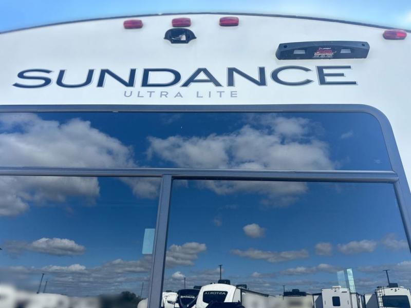 You will love planning more trips that involve this Sundance Ultra Lite travel trailer! There is lots of space in the living area because of the opposing slides, and there is lots of lounge space with the two sofas and booth dinette. The private bedroom offers you a queen-size bed with wardrobes on either side, and there is an additional dresser/wardrobe towards the foot of the bed. The kitchen has great countertop space with an island and a standalone countertop, and you can whip up something delicious on the three-burner range. Or you can just grab some leftovers from the 12V refrigerator.