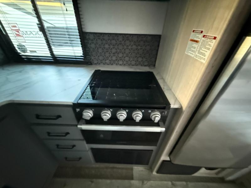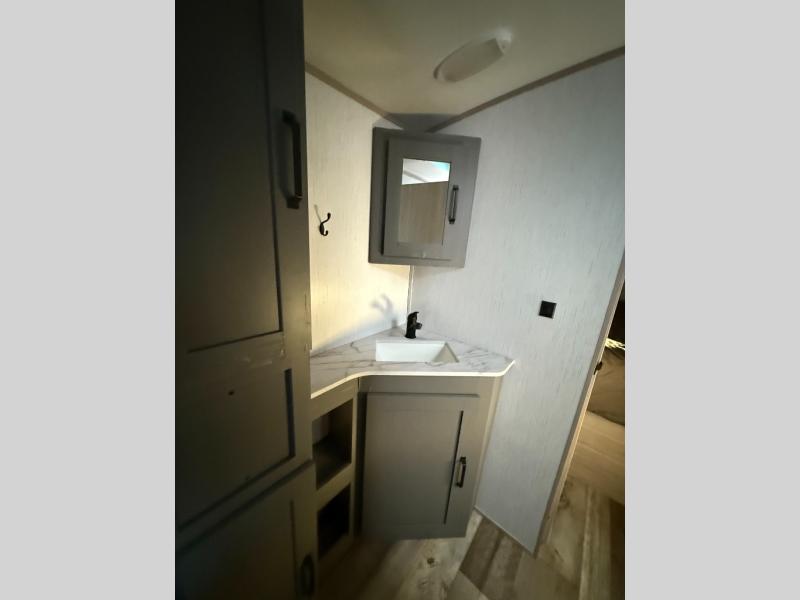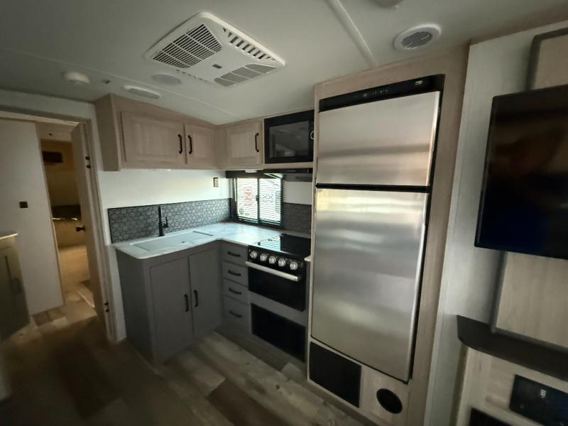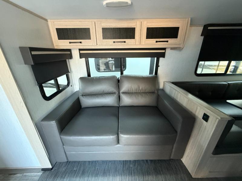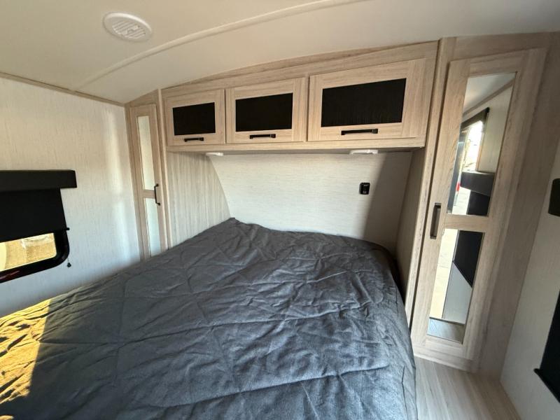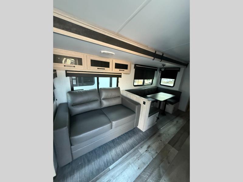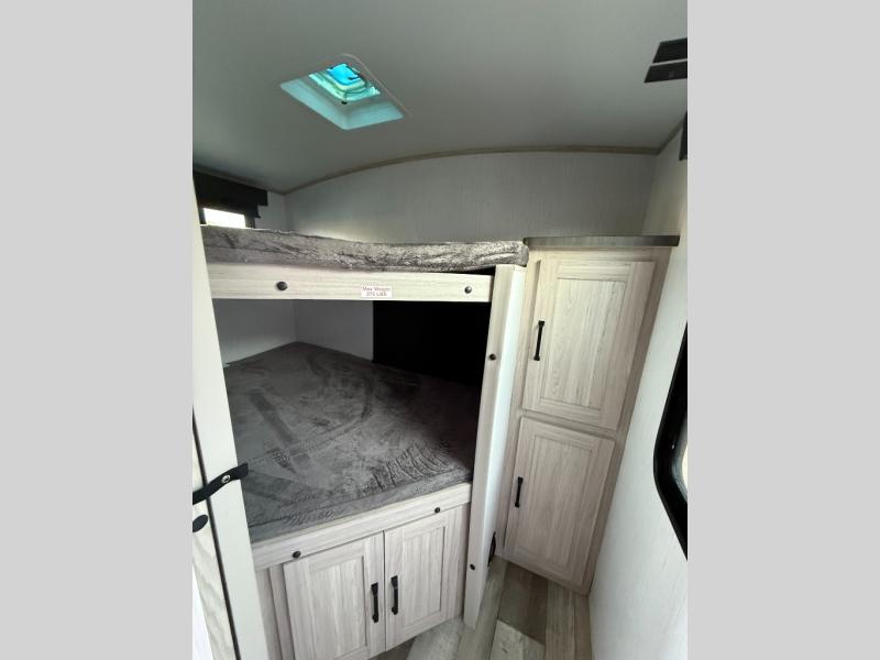 Camping with a large group or your family has never been easier than in this spacious travel trailer. Your guests will have double-size bunks to sleep on, as well as a sofa and a U-shaped dinette within the slide out. There is a queen bed in the front master bedroom, and the walk-through bath is convenient for everyone! You will love how much storage space is found in this model, including two bedroom wardrobes, plenty of overhead compartments, and a walk-in pantry/wardrobe for food, shoes, or jackets. And don't overlook the exterior with its outside kitchen and large patio awning!
