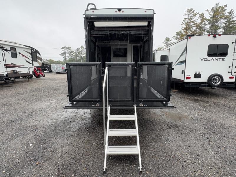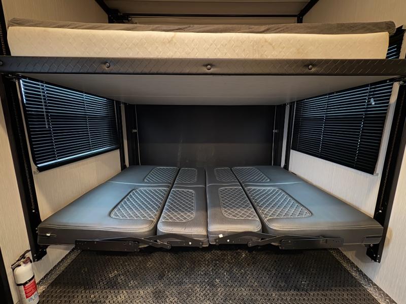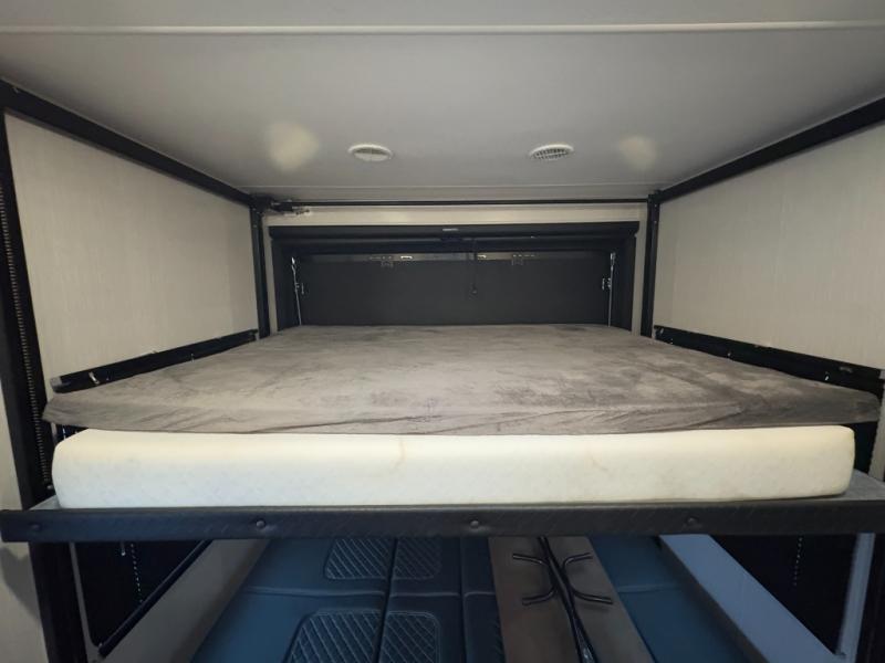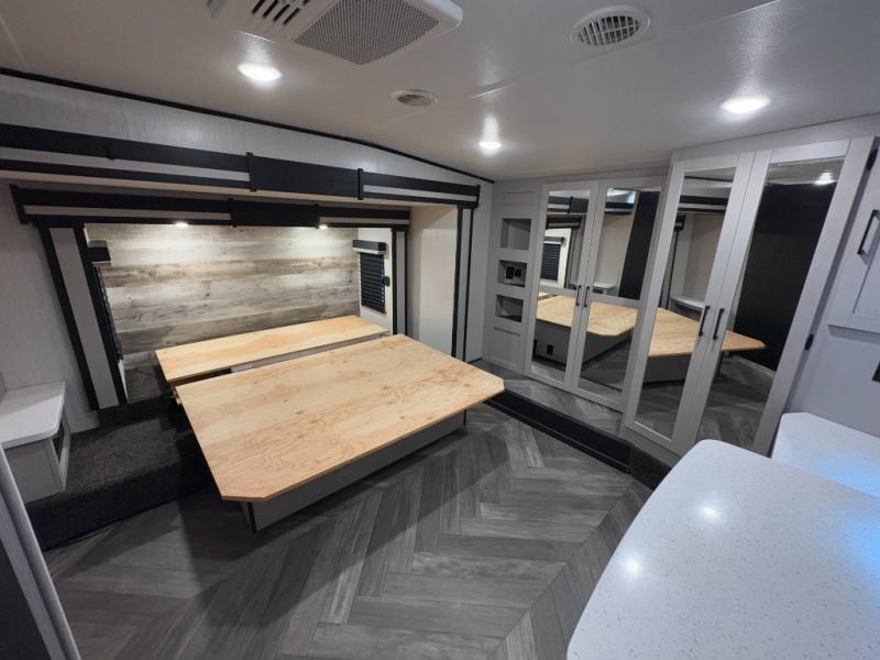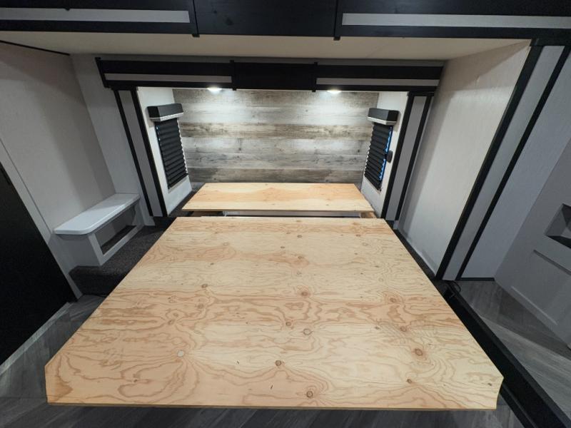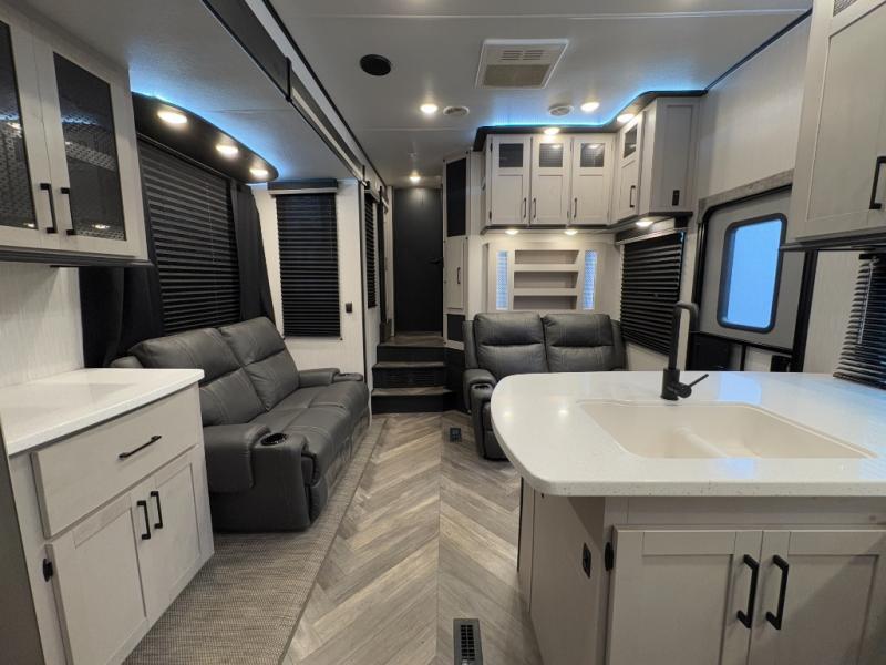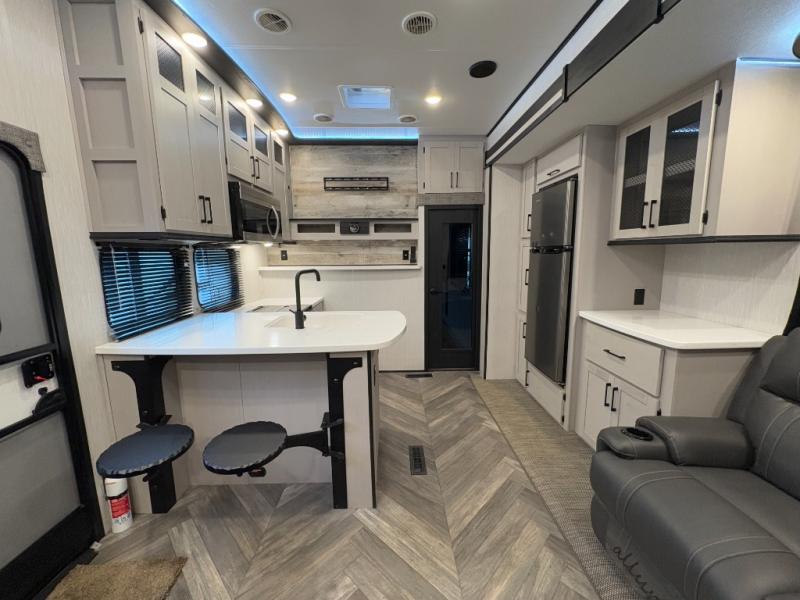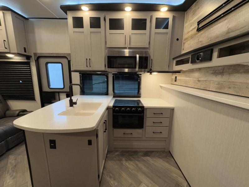 This toy hauler is decked out in features you will love! Starting with the outdoor kitchen that has a two burner cooktop and is protected by the 18' electric awning. The inside kitchen has everything you need to prepare delicious meals too, plus two bar stools at the countertop to enjoy your morning coffee. There are two areas prepped for optional washer and dryers so you can have clean clothes throughout your entire trip. Get a good night's rest each night on the tilting king bed slide in the front master suite which also has an entrance into the dual entry bathroom for easy access at night. In the 13' garage area, there is a loft above a half bathroom with a folding wall, an optional electric queen bed with split bench seating below it, and one of the dual entry doors to the unit!