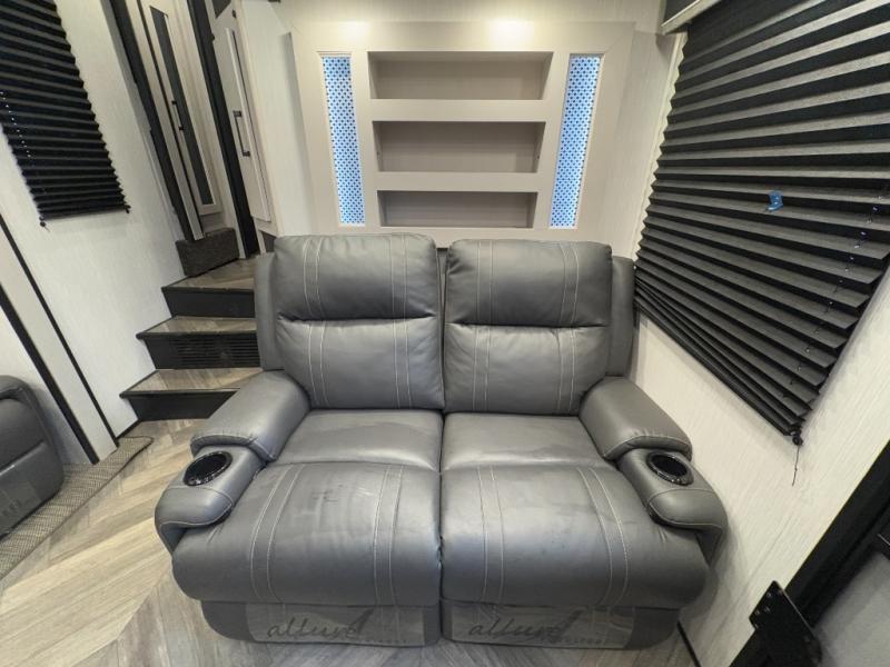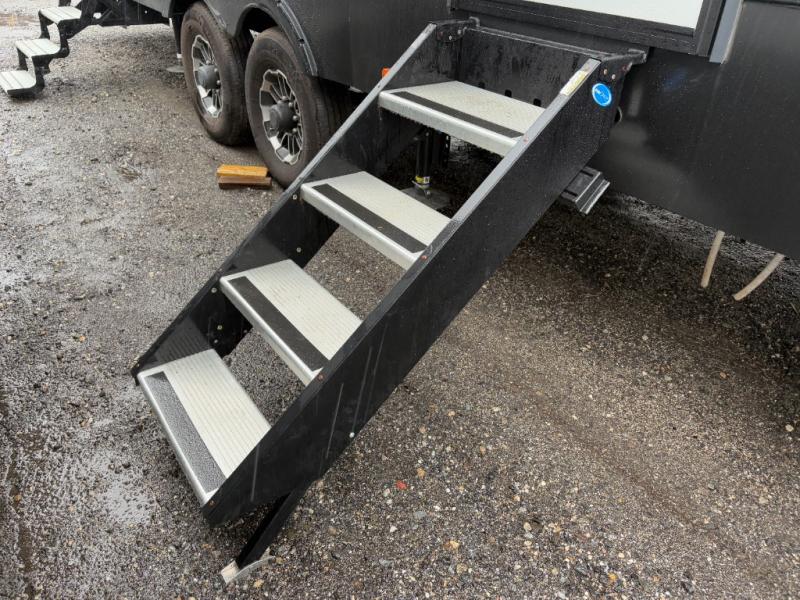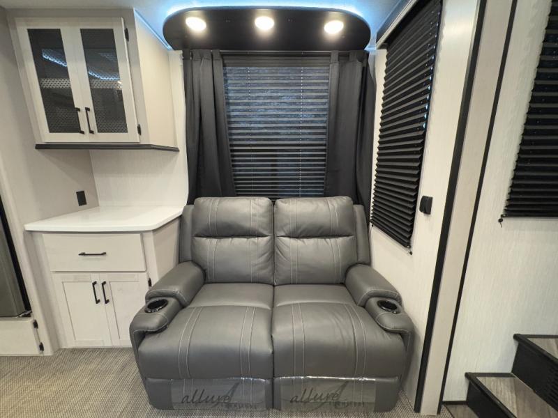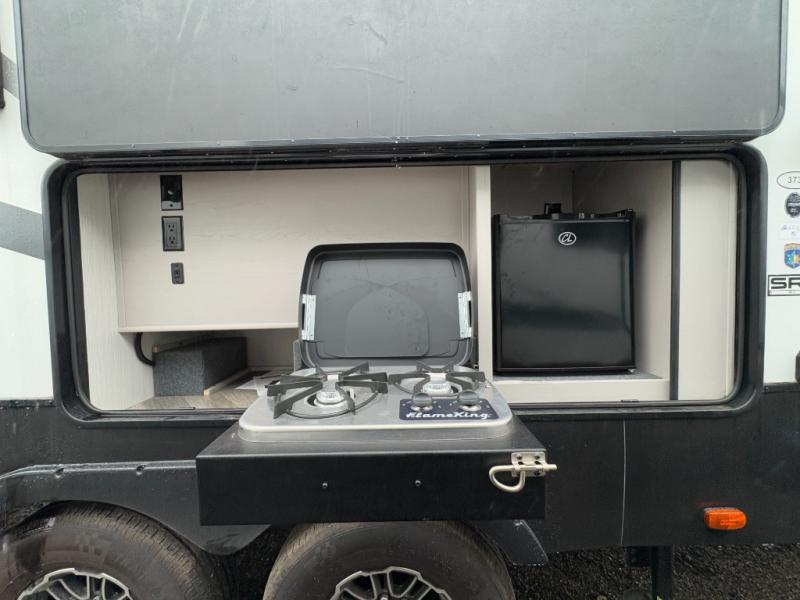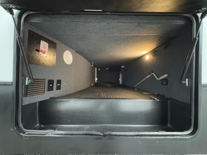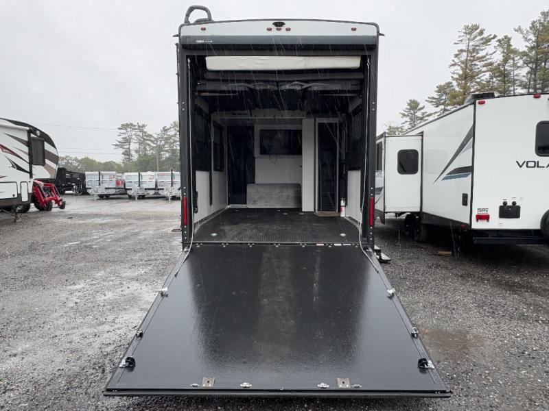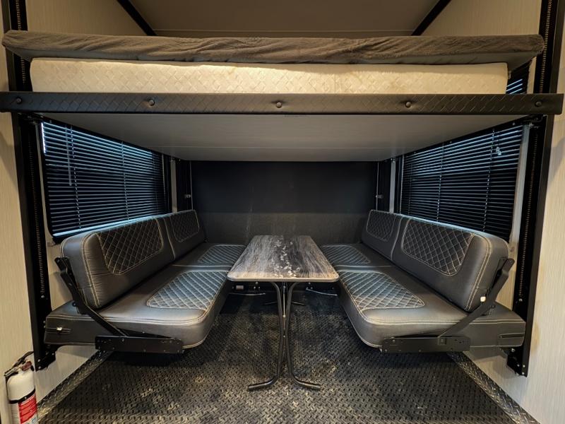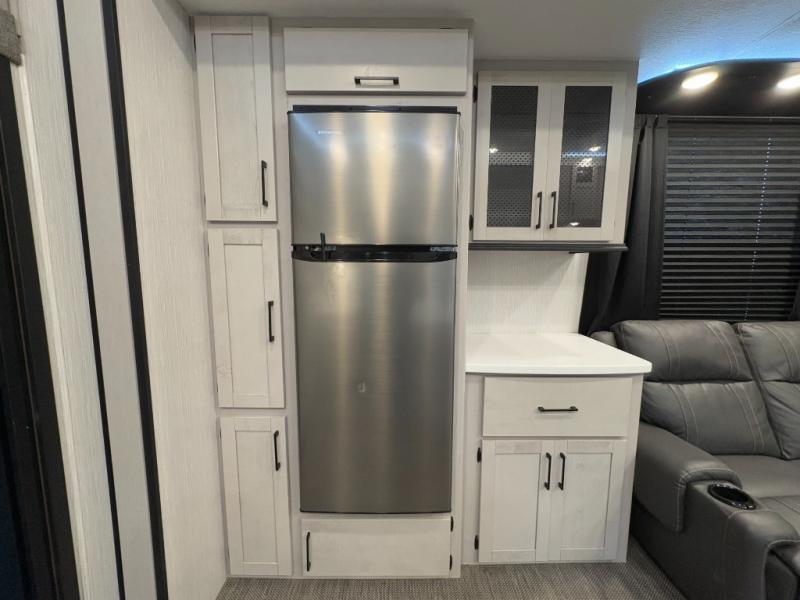 This toy hauler is decked out in features you will love! Starting with the outdoor kitchen that has a two burner cooktop and is protected by the 18' electric awning. The inside kitchen has everything you need to prepare delicious meals too, plus two bar stools at the countertop to enjoy your morning coffee. There are two areas prepped for optional washer and dryers so you can have clean clothes throughout your entire trip. Get a good night's rest each night on the tilting king bed slide in the front master suite which also has an entrance into the dual entry bathroom for easy access at night. In the 13' garage area, there is a loft above a half bathroom with a folding wall, an optional electric queen bed with split bench seating below it, and one of the dual entry doors to the unit!