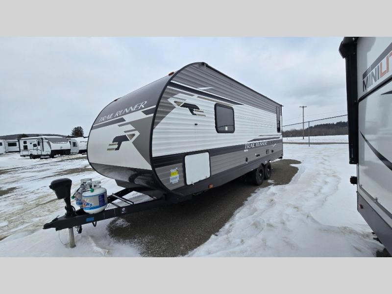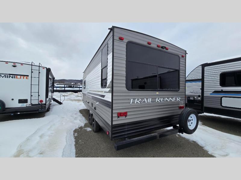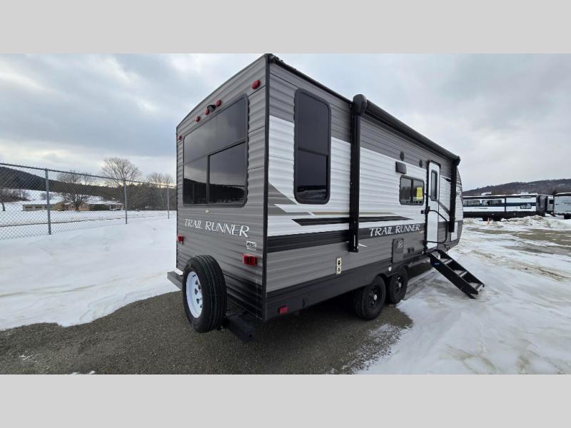 Paradise awaits at the end of the trail with one of these Heartland Trail Runner travel trailers! Experience better wind and water deflection, added strength, and a reduction of tongue weight with the hybrid aluminum front profile that has an aerodynamic radius front cage. A cambered structural steel I-beam frame holds them together and a heated enclosed underbelly protects the units vitals. There is an industry leading mammoth storage space of 57 cu. ft. pass-through storage so you can bring all of your outdoor gear with you. Roller shades in the main living area, woven flooring in all slide rooms, master suites with CPAP storage, and upgraded pressed counters give you the at-home feel you desire. Come find the perfect model for you today!