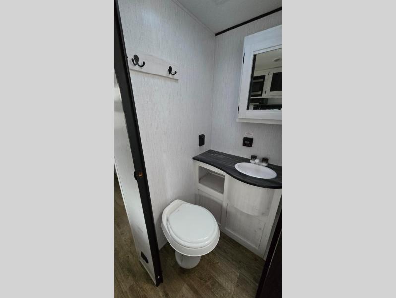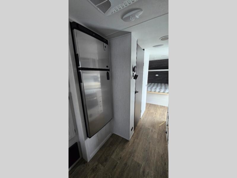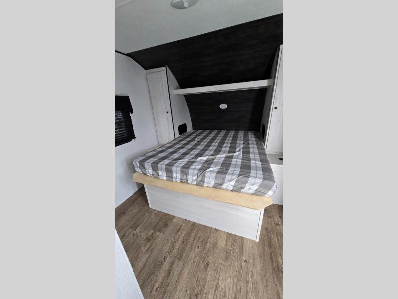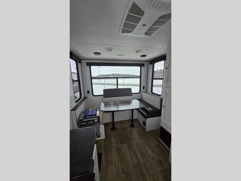 Head to your favorite campground with your favorite person in this travel trailer! The front queen bed has under-bed storage for more blankets and since there are wireless cell charging stations you don't have to worry about bringing your chargers. Freshen up each morning in the full bathroom with the ABS tub/shower surround with a skylight above to bring the outdoors inside. Keep your bellies full with a three burner cooktop and 10 cu. ft. stainless steel refrigerator, and the rear U-shaped dinette offers a comfortable place to eat meals, play games, and even transform into an extra sleeping space for a guest or two to tag along!
